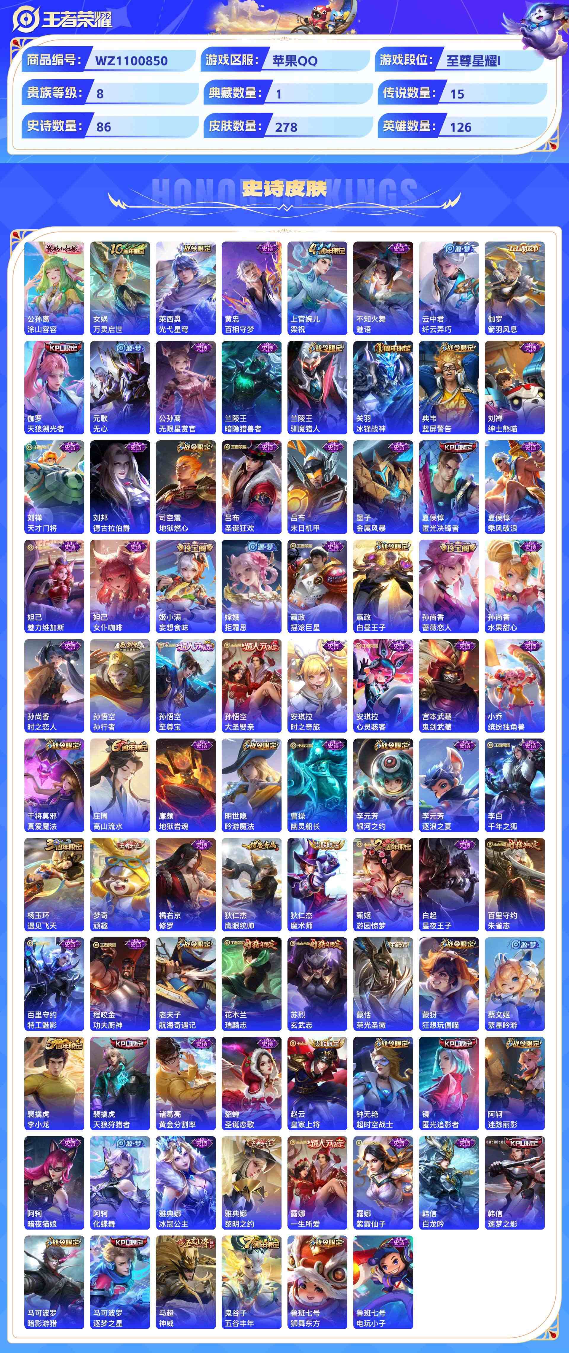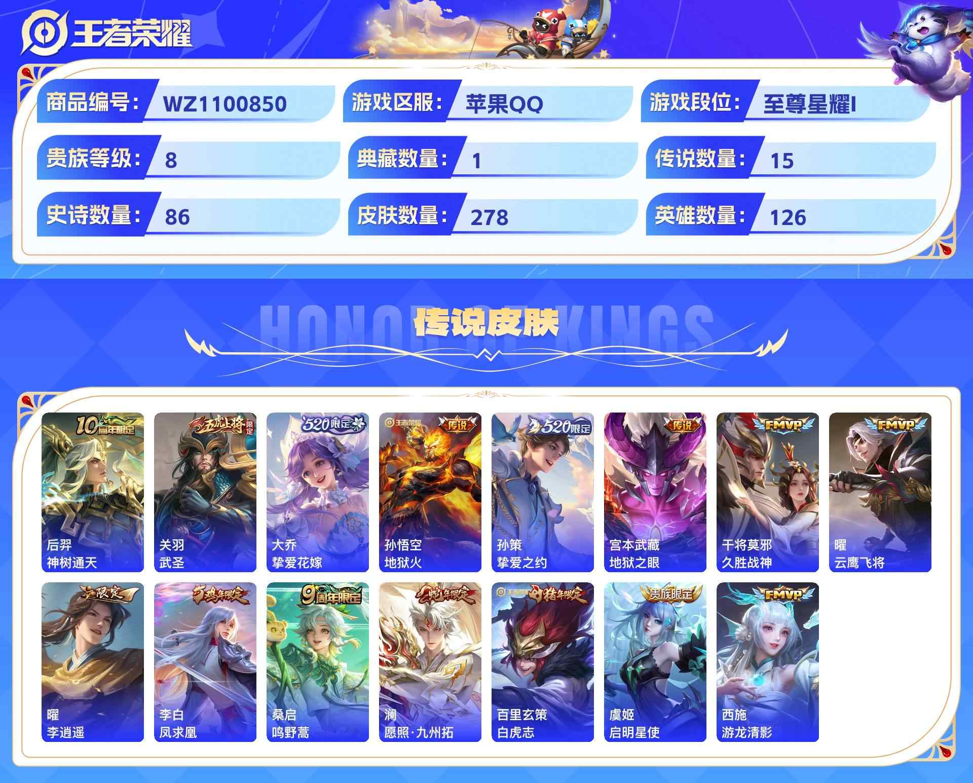 wz1100850|精品号苹果qq 贵族8级 278皮 1典藏(无限飓风号) 15传说(神树通天武圣挚爱花嫁地狱火挚爱之约地狱之眼久胜战神云鹰飞将李 凤求凰鸣野蒿愿照·九州拓白虎志启明星使游龙清影) 86史诗1星传说4个性按键1天幕