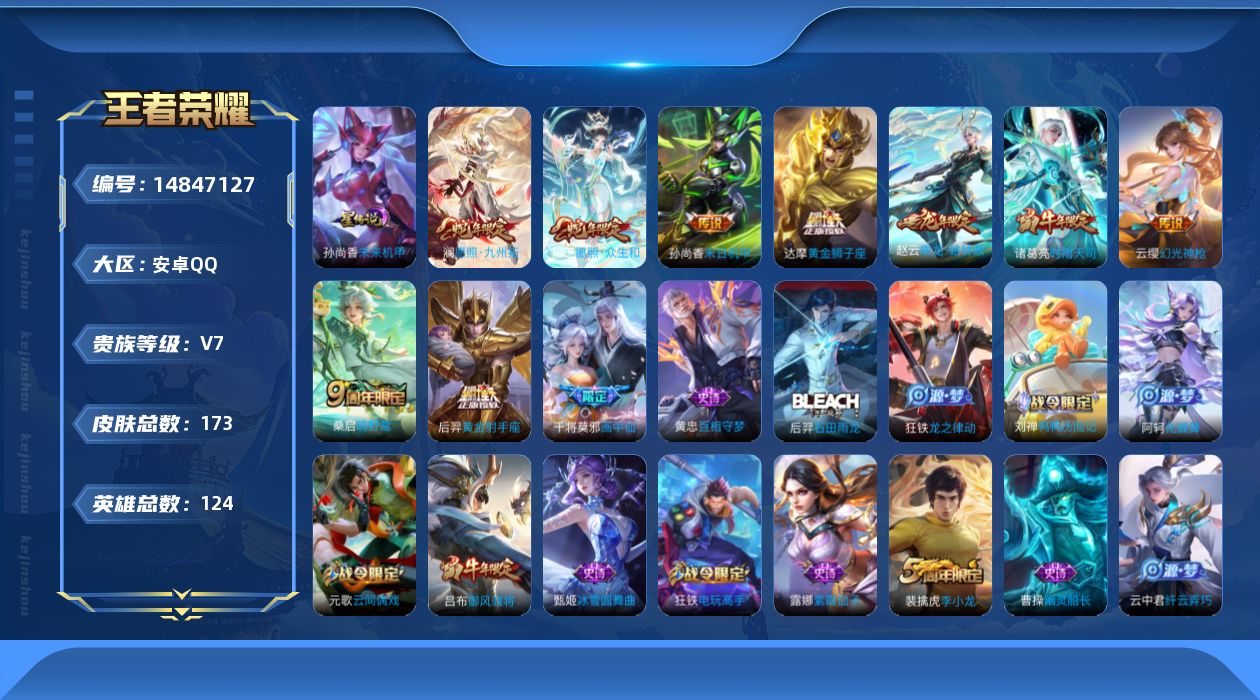 [14847127]v7雄-173皮肤-10传说-37史诗,ll5149 【传说皮肤】:妲己愿照众生和,澜愿照九州拓,云缨幻光神呛,桑启鸣野蒿,赵云乘龙铭钟鼎,干将莫邪画中仙,诸葛亮时雨天司,达摩黄金狮子座,后羿黄金射手座,孙尚香末日机甲 【限定皮肤】:狄仁杰阴阳师,赵云皇家上将,吕布御风骁将,元歌云间偶戏,夏侯惇朔风刀,狄仁杰魔术师,狄仁杰万华元夜,达摩星际陆战队,达摩沙漠行僧,项羽海滩派对,老夫子醍醐杖,程咬金演武夺筹,王昭君午后时光,亚瑟潮玩骑士王,后羿圣弓游侠,李元芳云中旅人,钟馗驱傩正仪,干将莫邪画中仙,雅典娜黎明之约,鬼谷子原初探秘者,诸葛亮时雨天司,苏烈千军破阵,弈星混沌棋,沈梦溪大漠名商,明世隐疑决卦,裴擒虎李小龙,裴擒虎擒涛扼浪,狂铁电玩高手,米莱狄御霄,米莱狄胡桃异想国,云中君纤云弄巧,盾山御銮,鲁班大师探海日志,镜匿光追影者,桑启海盐诗旅,艾琳女武神,张良古海寻踪,鬼谷子天穹祈灯,赵云乘龙铭钟鼎,鲁班七号蔬乡物语,李元芳蔬乡物语,刘邦剑破天穹 【年限皮肤】:吕布御风骁将,诸葛亮时雨天司,赵云乘龙铭钟鼎 【赛季限定】:夏侯惇朔风刀,狄仁杰万华元夜,达摩沙漠行僧,老夫子醍醐杖,程咬金演武夺筹,张良古海寻踪,李元芳云中旅人,钟馗驱傩正仪,雅典娜黎明之约,鬼谷子原初探秘者,苏烈千军破阵,弈星混沌棋,沈梦溪大漠名商,明世隐疑决卦,裴擒虎擒涛扼浪,米莱狄御霄,盾山御銮,鲁班大师探海日志,桑启海盐诗旅,鬼谷子天穹祈灯,刘邦剑破天穹 【战令限定】:元歌云间偶戏,达摩星际陆战队,王昭君午后时光,亚瑟潮玩骑士王,后羿圣弓游侠,狂铁电玩高手,米莱狄胡桃异想国,鲁班七号蔬乡物语,李元芳蔬乡物语 【史诗皮肤】:项羽苍穹之光,露娜紫霞仙子,赵云皇家上将,貂蝉圣诞恋歌,甄姬冰雪圆舞曲,王昭君偶像歌手,狄仁杰魔术师,孙尚香水果甜心,妲己魅力维加斯,曹操幽灵船长,张飞乱世虎臣,夏侯惇乘风破浪,兰陵王暗隐猎兽者,亚瑟心灵战警,百里守约特工魅影,刘禅天才门将,白起星夜王子,阿轲节奏热浪,狄仁杰鹰眼统帅,裴擒虎李小龙,云中君纤云弄巧,元歌云间偶戏,吕布御风骁将,米莱狄胡桃异想国,西施诗语江南,杨戬天秀启明,镜匿光追影者,雅典娜黎明之约,狂铁电玩高手,鲁班七号蔬乡物语,马可波罗星界特工,孙膑茶境仙,阿轲化蝶舞,刘禅鸭鸭历险记,狂铁龙之律动,后羿石田雨龙,黄忠百相守梦 【其他皮肤】:项羽海滩派对,韩信教廷