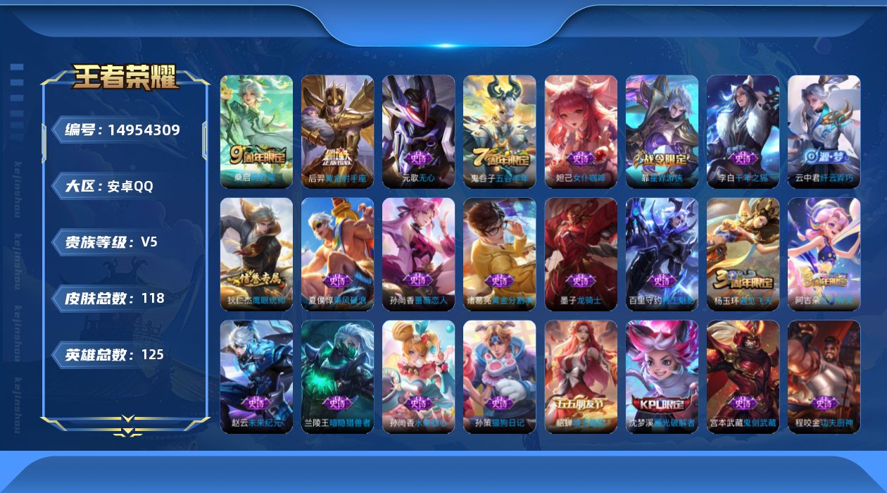 [14954309]v5-118皮肤-2传说-25史诗 tt1240 【内测皮肤】:孙尚香蔷薇恋人,艾琳女武神,狂铁特工战影 【传说皮肤】:后羿黄金射手座,桑启鸣野蒿 【限定皮肤】:姜子牙天穹之誓,狄仁杰阴阳师,赵云皇家上将,孙尚香蔷薇恋人,元歌无心,狄仁杰万华元夜,达摩沙漠行僧,项羽海滩派对,程咬金演武夺筹,李元芳云中旅人,钟馗驱傩正仪,杨玉环遇见飞天,鬼谷子原初探秘者,鬼谷子五谷丰年,苏烈千军破阵,沈梦溪匿光破解者,裴擒虎擒涛扼浪,云中君纤云弄巧,嫦娥暖冬兔眠,鲁班大师探海日志,桑启海盐诗旅,暃星界游侠,艾琳女武神,阿古朵江河有灵,张良古海寻踪,蒙犽百解令,鬼谷子天穹祈灯,刘邦剑破天穹,周瑜熔金海岸 【赛季限定】:狄仁杰万华元夜,达摩沙漠行僧,程咬金演武夺筹,张良古海寻踪,李元芳云中旅人,钟馗驱傩正仪,鬼谷子原初探秘者,苏烈千军破阵,裴擒虎擒涛扼浪,鲁班大师探海日志,桑启海盐诗旅,鬼谷子天穹祈灯,刘邦剑破天穹,姜子牙天穹之誓 【战令限定】:嫦娥暖冬兔眠,暃星界游侠 【史诗皮肤】:赵云皇家上将,赵云未来纪元,宫本武藏鬼剑武藏,孙尚香蔷薇恋人,孙尚香水果甜心,妲己魅力维加斯,妲己女仆咖啡,墨子龙骑士,李白千年之狐,夏侯惇乘风破浪,兰陵王暗隐猎兽者,诸葛亮黄金分割率,百里守约特工魅影,程咬金功夫厨神,杨玉环遇见飞天,孙策猫狗日记,狄仁杰鹰眼统帅,云中君纤云弄巧,貂蝉唤灵魅影,鬼谷子五谷丰年,元歌无心,暃星界游侠,沈梦溪匿光破解者,阿古朵江河有灵,蒙犽百解令 【其他皮肤】:项羽海滩派对,韩信教廷特使,艾琳女武神,白起白色死神,牛魔西部大镖客,扁鹊化身博士,扁鹊救世之瞳,姜子牙时尚教父,妲己少女阿狸,亚瑟死亡骑士,达摩拳王,花木兰兔女郎,张飞五福同心,甄姬花好人间,刘备万事如意,宫本武藏万象初新,后羿阿尔法小队,狄仁杰阴阳师,刘备纽约教父,关羽龙腾万里,老夫子功夫老勺,孙尚香沉稳之力,诸葛亮掌控之力,明世隐虹云星官,庄周奇妙博物学,吕布野性能量,孙膑归虚梦演,盾山圆桌骑士,狂铁特工战影,鬼谷子原初探秘者,狄仁杰万华元夜,刘禅秘密基地,露娜瓷语鉴心,程咬金演武夺筹,张良缤纷绘卷,钟馗驱傩正仪,鲁班大师乓乓大师,苏烈千军破阵,达摩沙漠行僧,蒙恬蔚蓝守将,李元芳云中旅人,刘备潮玩造梦师,桑启海盐诗旅,嫦娥暖冬兔眠,猪八戒潮玩探月行,白起乐园追猎者,赵怀真太极少年,裴擒虎擒涛扼浪,太乙真人劲辣红锅