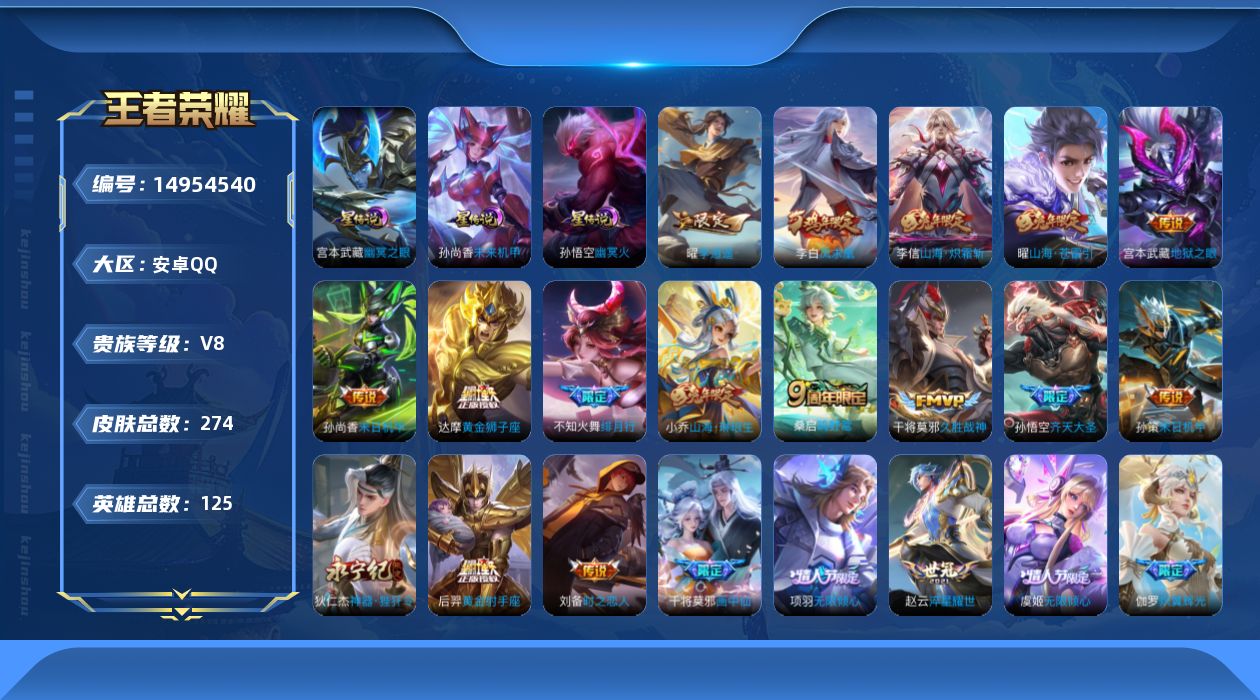 [14954540]【终身售后 找回包赔】安卓手q16区274皮0典藏28传说0无双 营地id465280469可二次v8最强王者 [兔年全套]【星传说】:幽冥火幽冥之眼未来机甲,【优质限定皮肤】:神威山海·琳琅生山海·苍雷引山海·炽霜斩凤求凰【传说皮肤】:神树通天鸣野蒿牧神诗旅音你心动画中仙燃星之曲启明星使音你闪耀无限倾心无限倾心黄金狮子座地狱之眼黄金射手座时之恋人炽翼辉光齐天大圣山海·琳琅生山海·苍雷引山海·炽霜斩绯月行末日机甲神器·狴犴令末日机甲淬星耀世李 久胜战神地狱火凤求凰【史诗皮肤】:节奏热浪万灵启世巫礼祀神乱世虎臣龙之律动涂山容容摇滚巨星特工魅影青蛇猫狗日记破空之剑无限星赏官谪仙醉月乘风破浪星夜王子江河有灵降魔神威幽灵船长朱雀志缤纷独角兽山海·碧波行山海·玄木吟心灵骇客女仆咖啡无心神器·万象笔德古拉伯爵五谷丰年末日机甲电玩高手千筹问战匿光决锋者鬼剑武藏水晶猎龙者傲雪梅呛寅虎·御盾暗渊魔法金属风暴拒霜思游园惊梦高山流水逐梦之影冰锋战神逐梦之星修罗冰雪圆舞曲纤云弄巧绅士熊喵李小龙暗隐猎兽者迷踪丽影未来纪元功夫厨神银河之约魔术师黄金分割率圣诞恋歌皇家上将繁星吟游梁祝狮舞东方鹰眼统帅蓝屏警告水果甜心冰冠公主逐浪之夏遇见飞天魅力维加斯月团寄思曙光守护者万物之道 星元:38星传说:3天幕:3按键:7签名:1贵族:9点卷:8皮肤碎片:37荣耀积分:10英雄碎片:701星传说:孙尚香未来机甲孙悟空幽冥火宫本武藏幽冥之眼