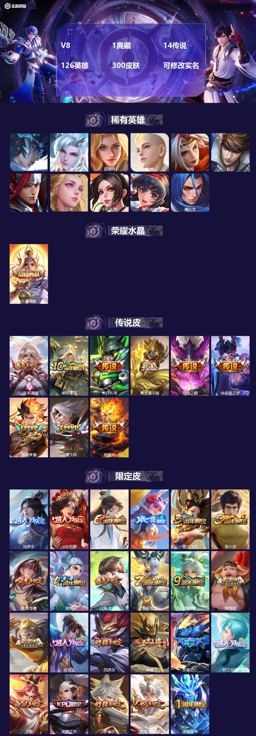 [14913424]v8 1典藏 14传说 126英雄 300皮肤 可修改实名 【英雄全皮】:敖隐全皮刘邦全皮猪八戒全皮影全皮 【稀有英雄】:敖隐小龙人大司命韩信韩跳跳夏洛特夏师傅艾琳橘右京橘子娜可露露鸟人不知火舞赵云金蝉唐僧戈娅 【荣耀水晶】:九