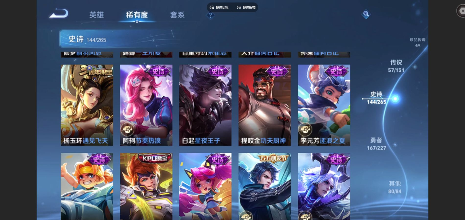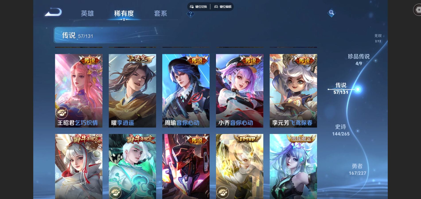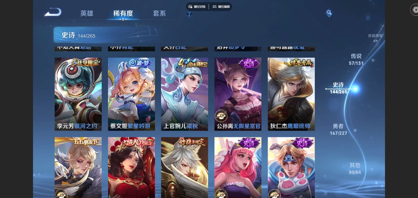 2328350-128英雄-457皮肤v10-4典藏2无双4珍品传说57传说 打野47段 发育路41段 万战金标韩信 金标孙悟空 芈月 4星传说幻舞叠翠 岁雨灵司 幻海之心 金色仲夏夜 【典藏】 神鉴启示录 武则天 大秦宣太后 九霄神辉 【无双】 器灵螭龙剑 雪境奇遇 【珍品传说】 器灵落星盏 时之奇旅孙策 江户川柯南 怪盗基德 【传说】 觅芳踪 凤求凰 星之鸣奏 续相思 幻光神呛 愿照