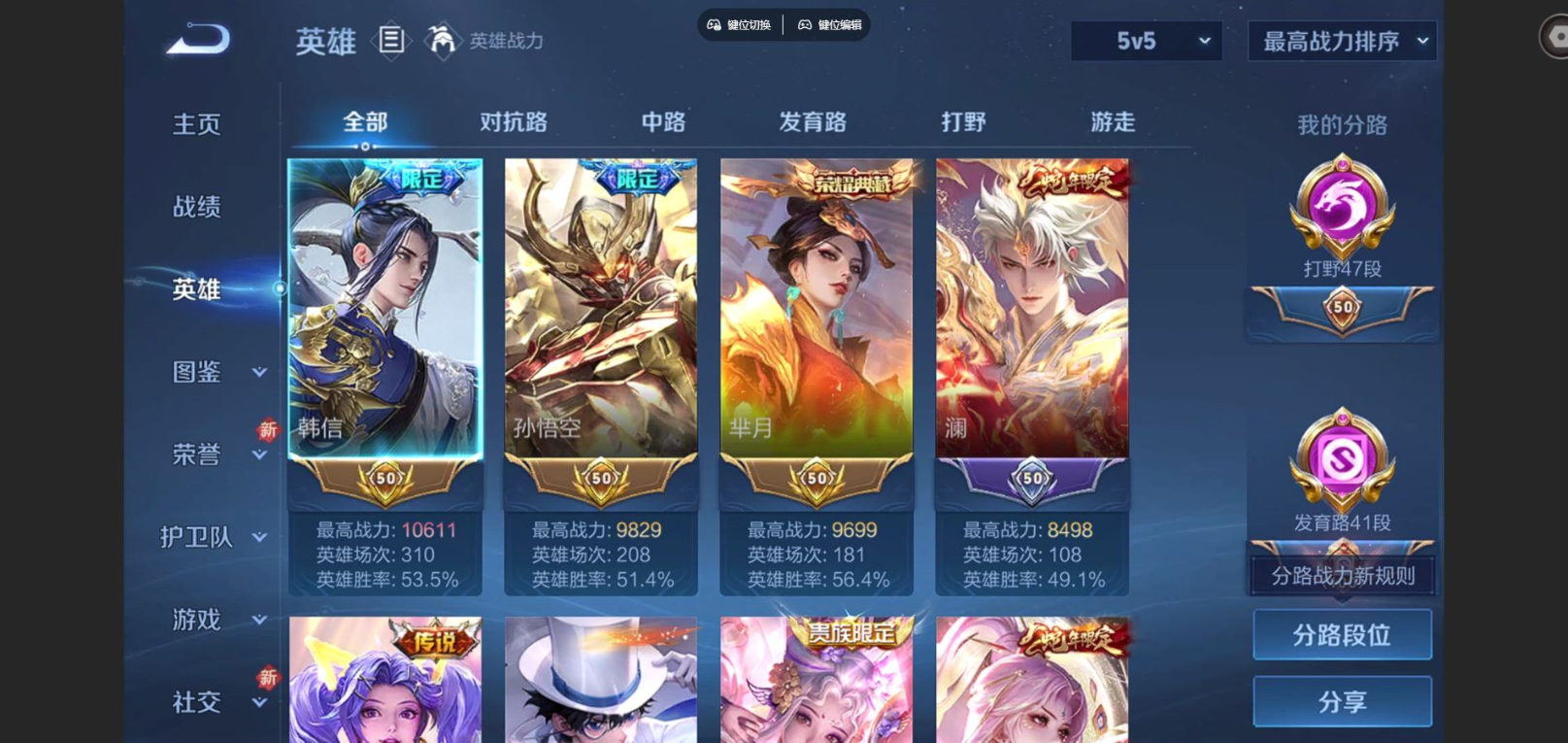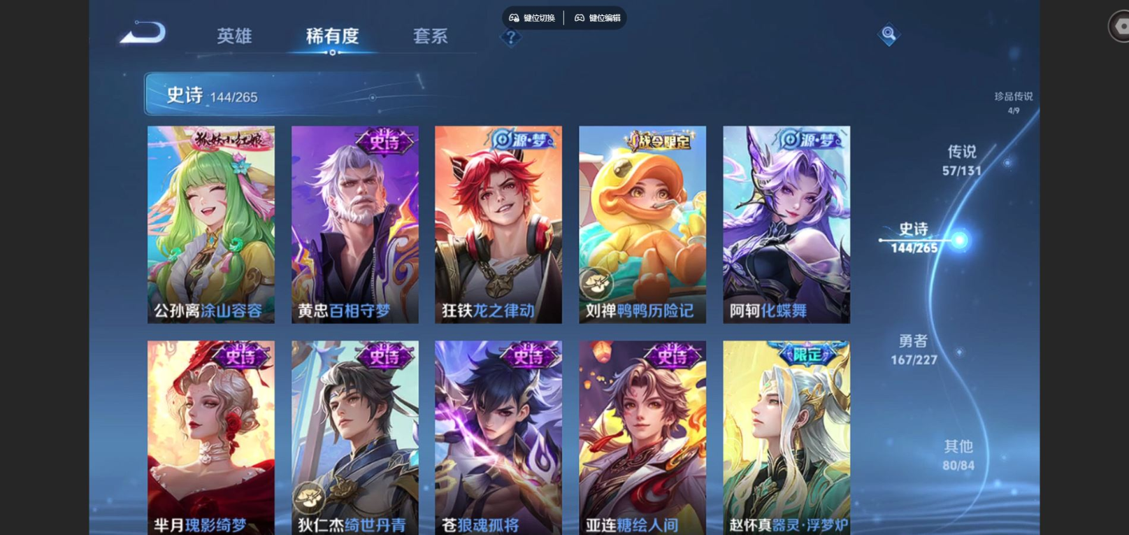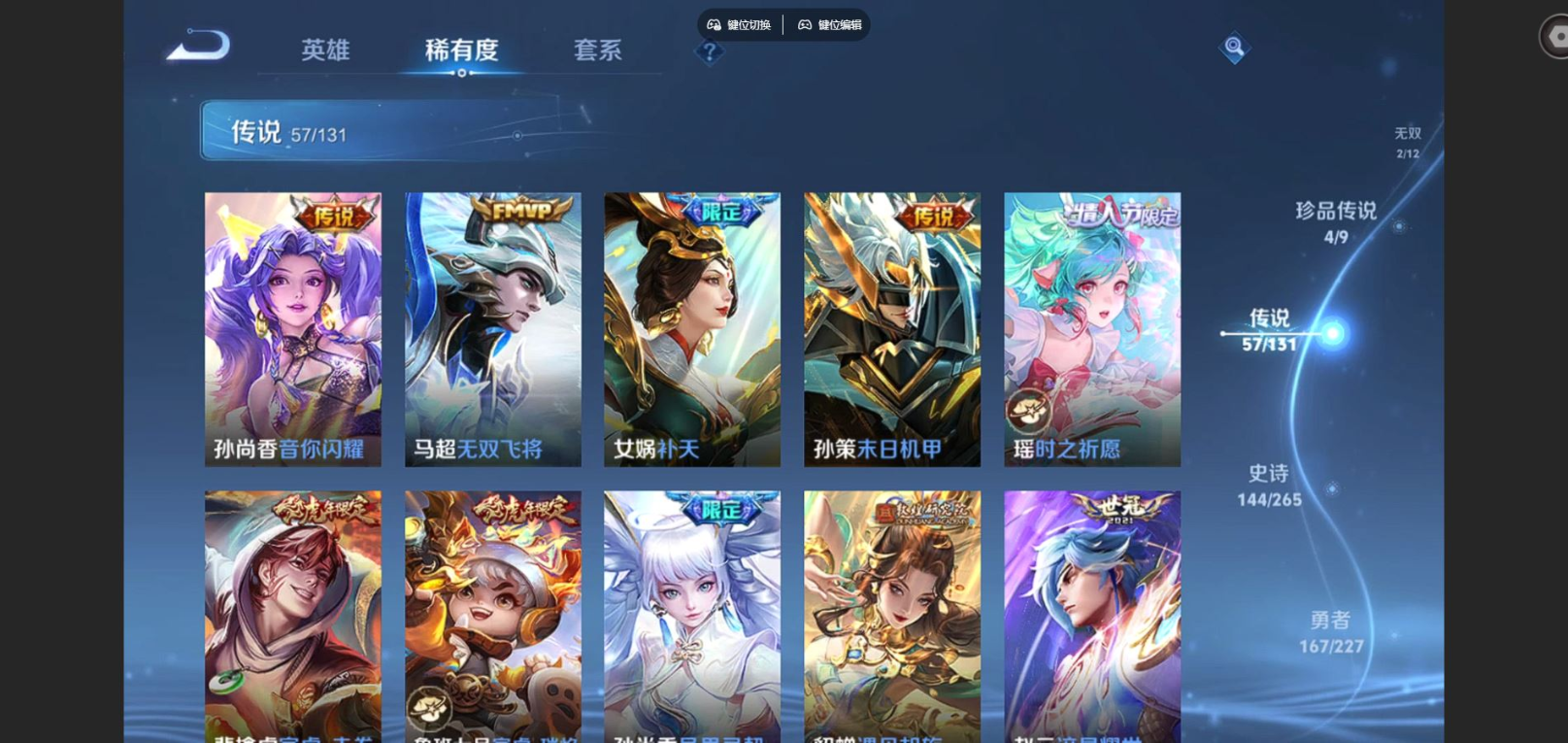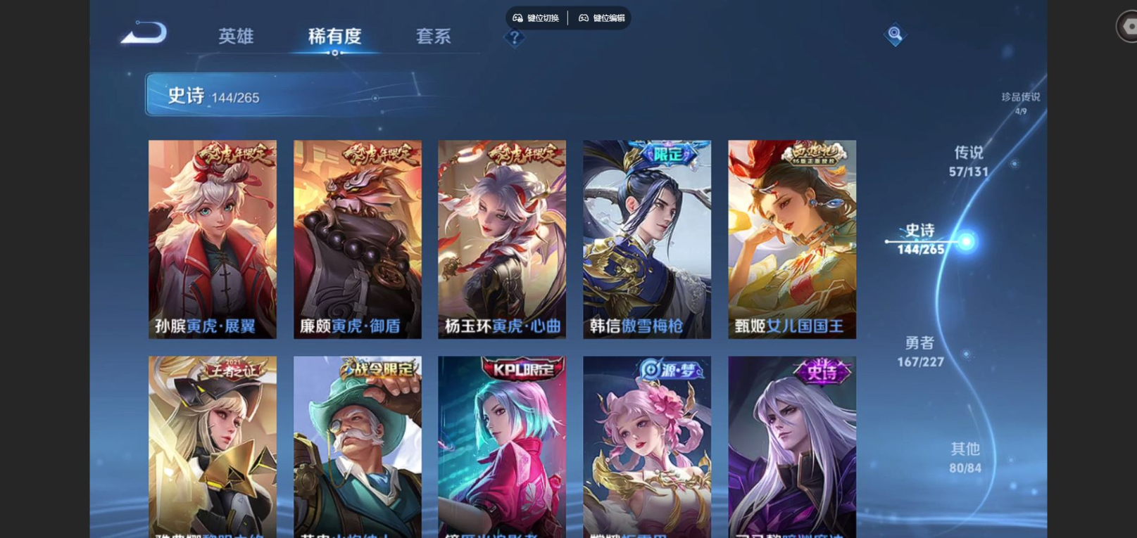 2328350-128英雄-457皮肤v10-4典藏2无双4珍品传说57传说 打野47段 发育路41段 万战金标韩信 金标孙悟空 芈月 4星传说幻舞叠翠 岁雨灵司 幻海之心 金色仲夏夜 【典藏】 神鉴启示录 武则天 大秦宣太后 九霄神辉 【无双】 器灵螭龙剑 雪境奇遇 【珍品传说】 器灵落星盏 时之奇旅孙策 江户川柯南 怪盗基德 【传说】 觅芳踪 凤求凰 星之鸣奏 续相思 幻光神呛 愿照