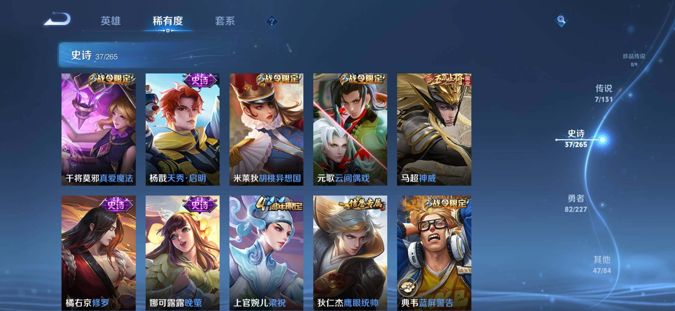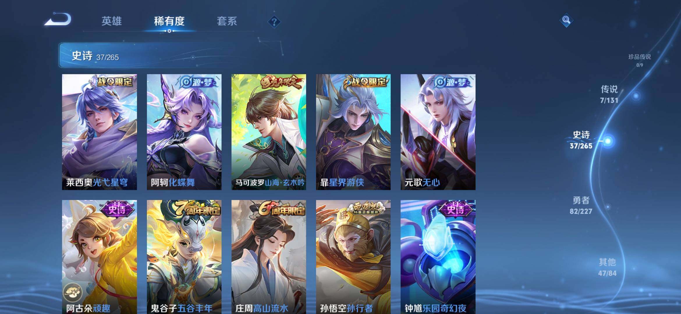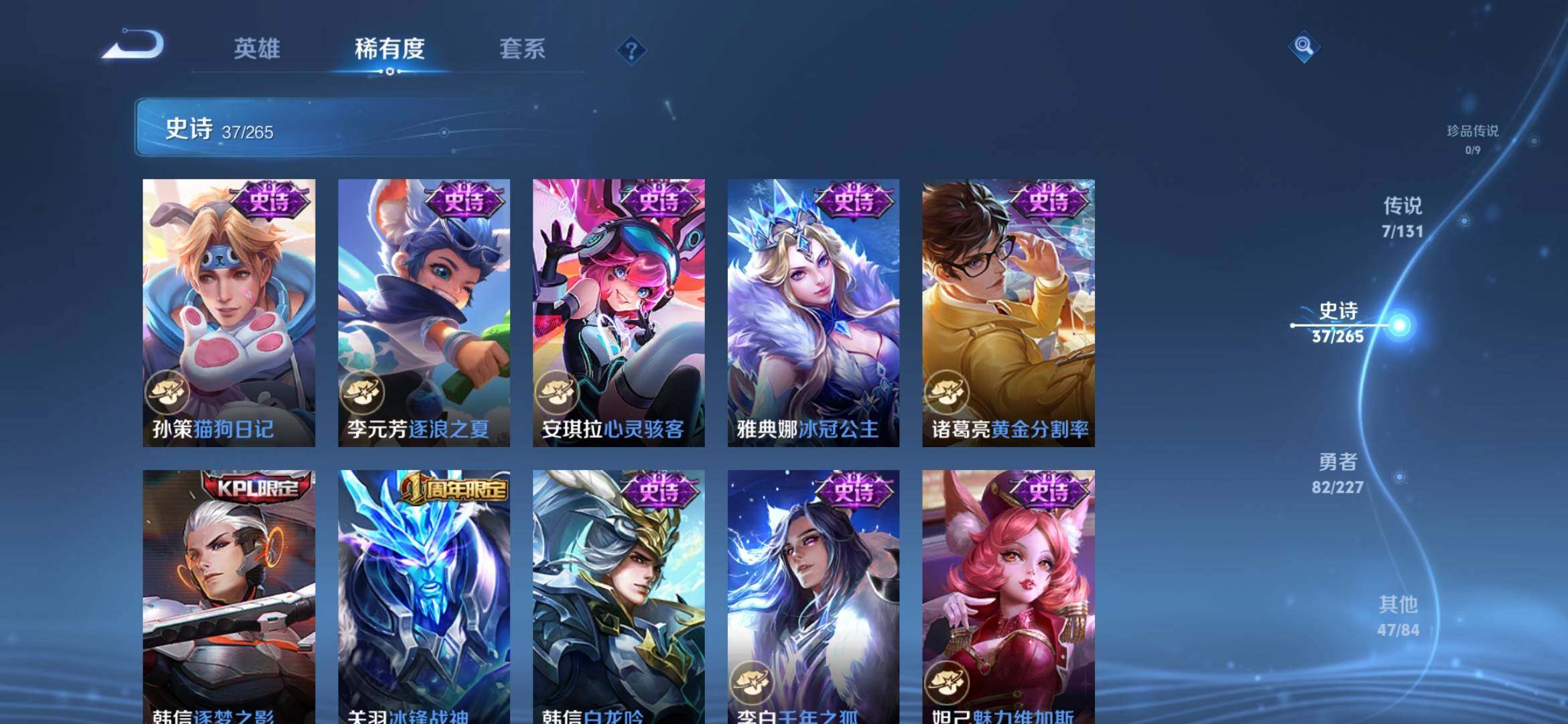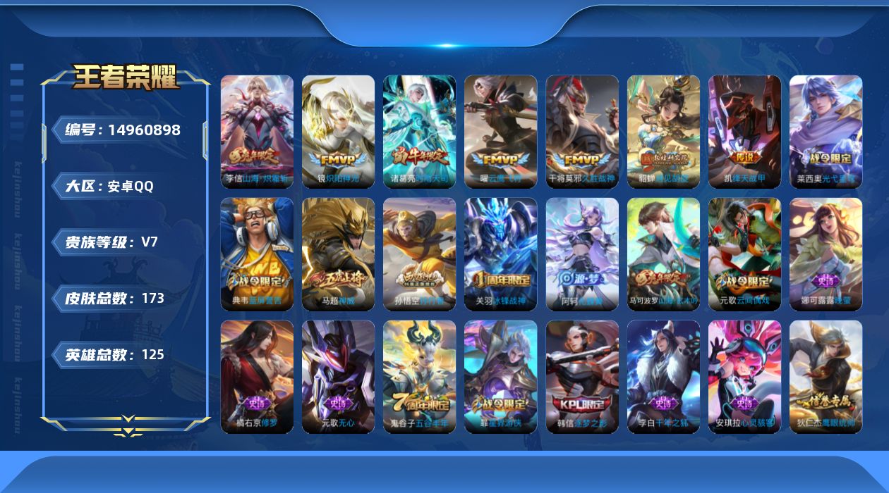 [14960898]安卓q-v7-最强王者段位-125英雄-173皮肤-7传说-37史诗 【英雄全皮】:空空儿全皮 【传说皮肤】:李信山海炽霜斩,貂蝉遇见胡旋,诸葛亮时雨天司,铠绛天战甲,镜炽阳神光,曜云鹰飞将,干将莫邪久胜战神 【限定皮肤】:姜子牙天穹之誓,狄仁杰阴阳师,赵云皇家上将,庄周高山流水,高渐离玩趣恶龙,元歌云间偶戏,元歌无心,典韦蓝屏警告,马可波罗山海玄木吟,狄仁杰魔术师,狄仁杰万华元夜,达摩星际陆战队,达摩沙漠行僧,项羽海滩派对,关羽冰锋战神,貂蝉遇见胡旋,程咬金演武夺筹,韩信逐梦之影,亚瑟潮玩骑士王,孙悟空孙行者,后羿圣弓游侠,李元芳云中旅人,钟馗驱傩正仪,干将莫邪真爱魔法,鬼谷子原初探秘者,鬼谷子五谷丰年,诸葛亮时雨天司,苏烈千军破阵,沈梦溪大漠名商,裴擒虎擒涛扼浪,米莱狄胡桃异想国,李信山海炽霜斩,上官婉儿梁祝,嫦娥暖冬兔眠,鲁班大师探海日志,桑启海盐诗旅,暃星界游侠,张良古海寻踪,鬼谷子天穹祈灯,刘邦剑破天穹,程咬金群星魔术团,周瑜熔金海岸 【年限皮肤】:诸葛亮时雨天司,马超神威,马可波罗山海玄木吟,李信山海炽霜斩 【赛季限定】:狄仁杰万华元夜,达摩沙漠行僧,程咬金演武夺筹,张良古海寻踪,李元芳云中旅人,钟馗驱傩正仪,鬼谷子原初探秘者,苏烈千军破阵,沈梦溪大漠名商,裴擒虎擒涛扼浪,鲁班大师探海日志,桑启海盐诗旅,鬼谷子天穹祈灯,刘邦剑破天穹,姜子牙天穹之誓 【战令限定】:元歌云间偶戏,典韦蓝屏警告,达摩星际陆战队,亚瑟潮玩骑士王,后羿圣弓游侠,干将莫邪真爱魔法,米莱狄胡桃异想国,嫦娥暖冬兔眠,暃星界游侠 【史诗皮肤】:赵云皇家上将,赵云未来纪元,貂蝉圣诞恋歌,狄仁杰魔术师,廉颇地狱岩魂,宫本武藏鬼剑武藏,孙尚香水果甜心,妲己魅力维加斯,李白千年之狐,韩信白龙吟,关羽冰锋战神,韩信逐梦之影,诸葛亮黄金分割率,雅典娜冰冠公主,安琪拉心灵骇客,李元芳逐浪之夏,孙策猫狗日记,典韦蓝屏警告,狄仁杰鹰眼统帅,上官婉儿梁祝,娜可露露晚萤,橘右京修罗,马超神威,元歌云间偶戏,米莱狄胡桃异想国,杨戬天秀启明,干将莫邪真爱魔法,钟馗乐园奇幻夜,孙悟空孙行者,庄周高山流水,鬼谷子五谷丰年,阿古朵顽趣,元歌无心,暃星界游侠,马可波罗山海玄木吟,阿轲化蝶舞,莱西奥光弋星穹 【其他皮肤】:项羽海滩派对,韩信教廷特使,露娜哥特玫瑰,达摩大发明家,赵云忍炎影,芈月红桃皇后,程咬金星际陆战队,