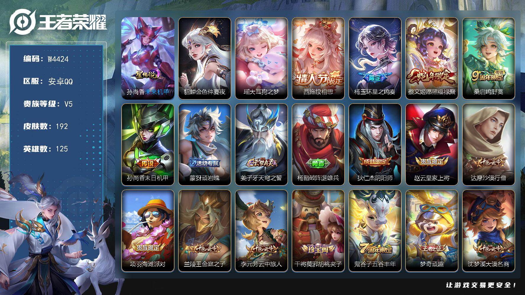 【w4424】5k多场次精品女号-12个性按键.(热门皮肤)大耳朵之梦.续相思.星之鸣奏.愿照福禄聚.幻珠鲛人.至美乘鲤谣.雪境奇遇.安卓q-可二次-贵5-125英雄-192皮肤-1珍品传说-1星元-5传说-50限定-贵族积分9120-营地id:1716104845(星元皮肤)未来机甲 【星元皮肤】:孙尚香未来机甲,貂蝉金色仲夏夜