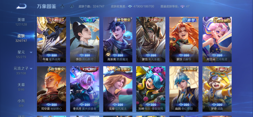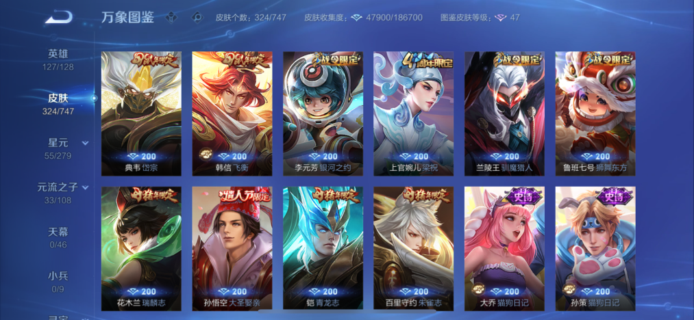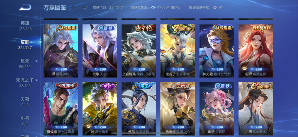 127英雄-324皮肤-【2水晶1珍品18传说2星传】苹果qq-127英雄-324皮肤【2水晶】 全息碎影 鸣剑·曳影【珍品传说】怪盗基德【星元皮肤】未来机甲金色仲夏夜【传说皮肤】逐花归海 寅虎·瑞焰 鹤羽星尊 愿照·九州拓 寅虎·瑞焰 李 诗剑行 枫霜尽 无双飞将 黄金狮子座 仲夏夜之梦 久胜战神 一念神魔 末日机甲 启明星使 时雨天司 怒海麟威 鸣野蒿【史诗皮肤】百解令 冰锋战神 飞衡 大圣娶