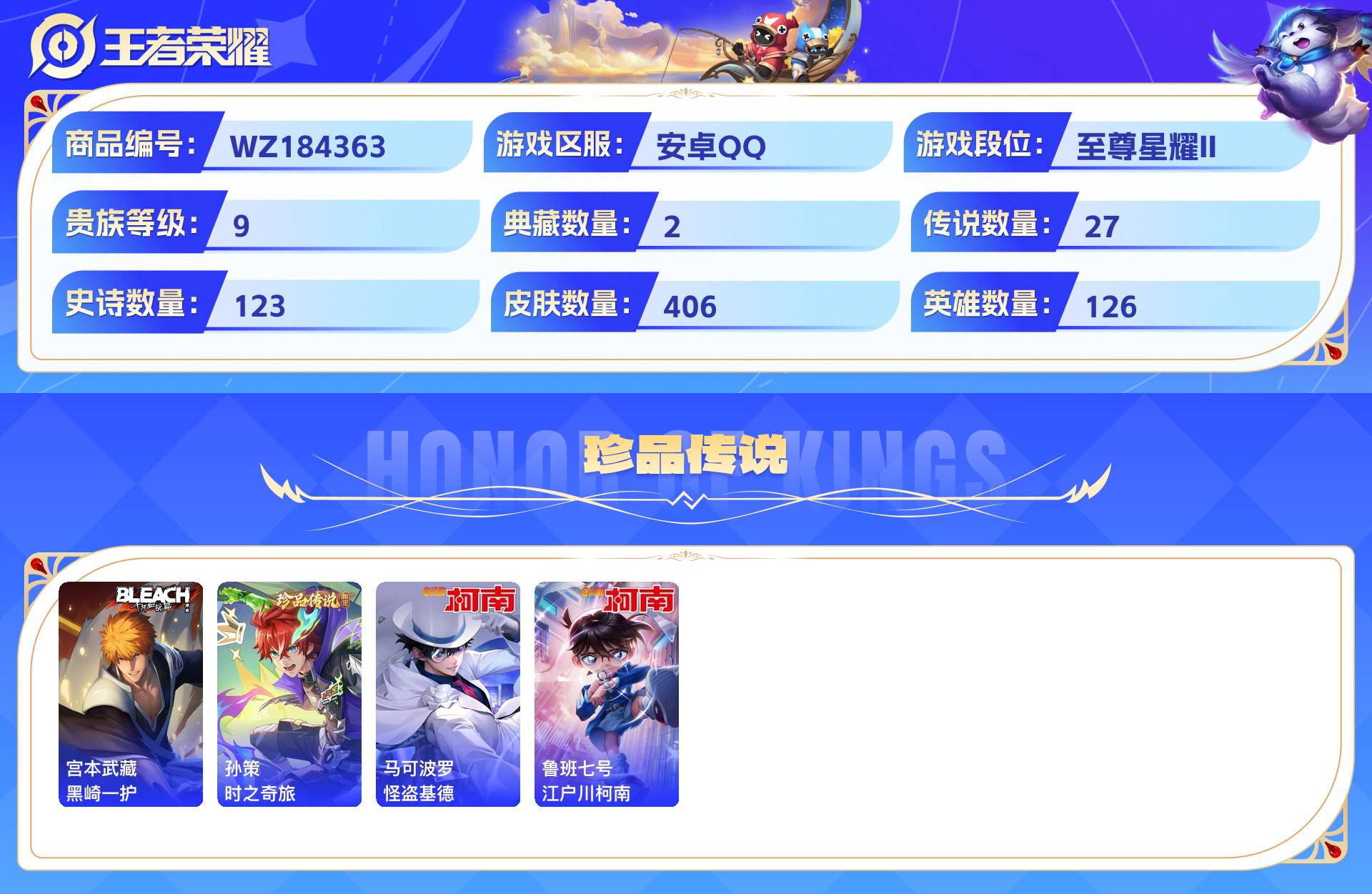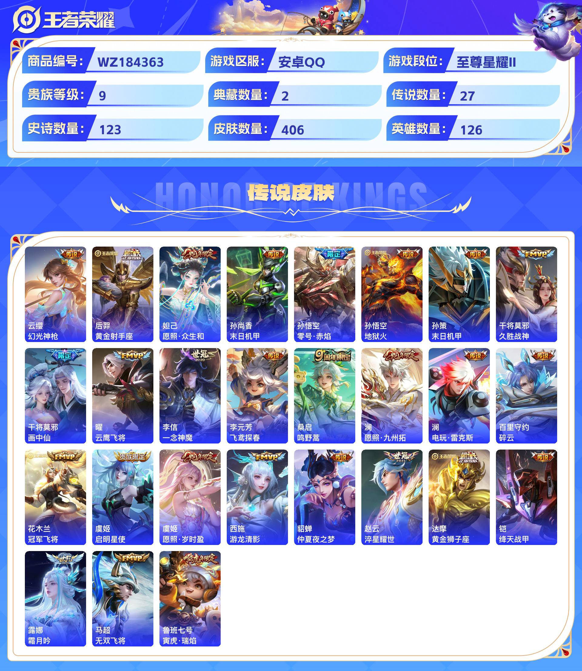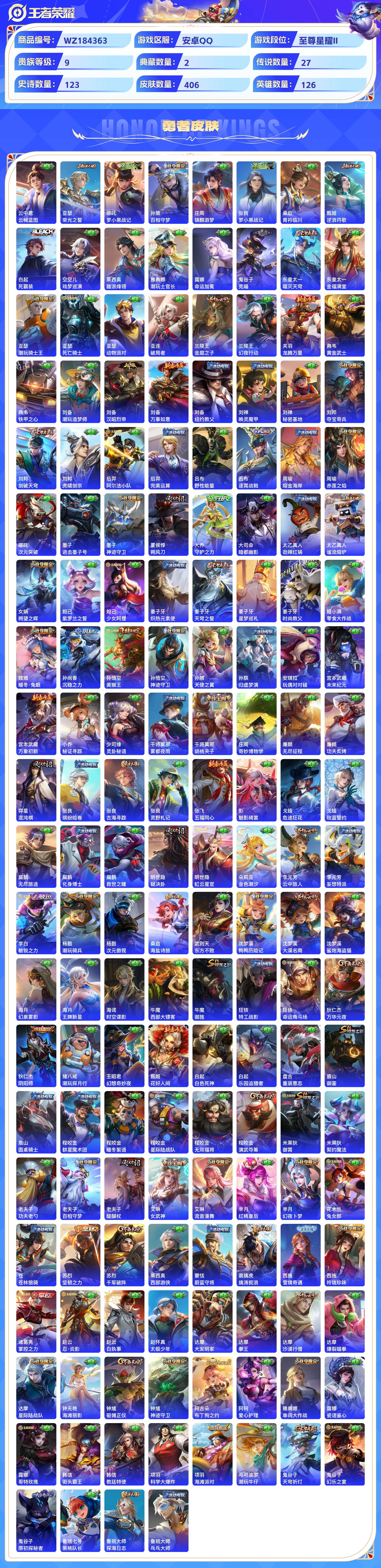 2279065-安卓qq 406皮 贵族9级 2典藏 4珍品传说 2无双 27传说 123史诗【荣耀典藏】全息碎影九霄神辉【珍品传说】黑崎一护时之奇旅怪盗基德江户川柯南【无双限定】神罪雪境奇遇【传说皮肤】幻光神呛黄金射手座愿照·众生和末日机甲零号·赤焰地狱火末日机甲久胜战神画中仙云鹰飞将一念神魔飞鸢探春鸣野蒿愿照·九州拓电玩·雷克斯碎云冠军飞将启明