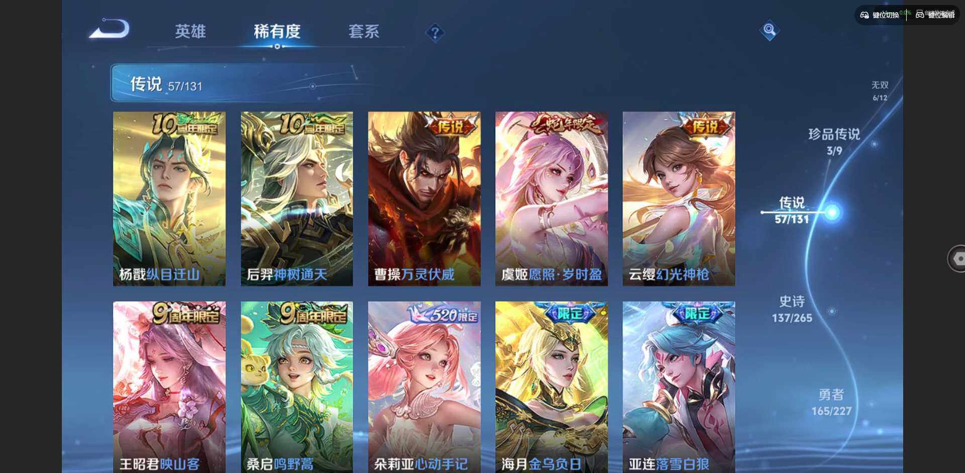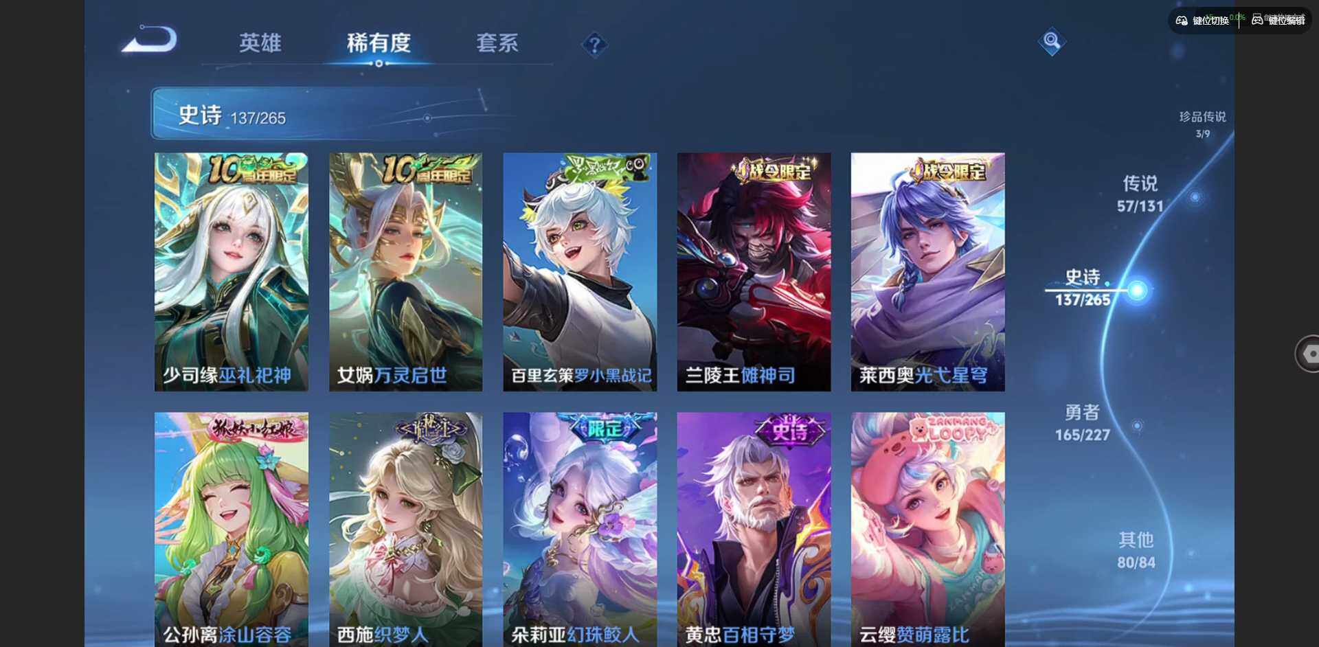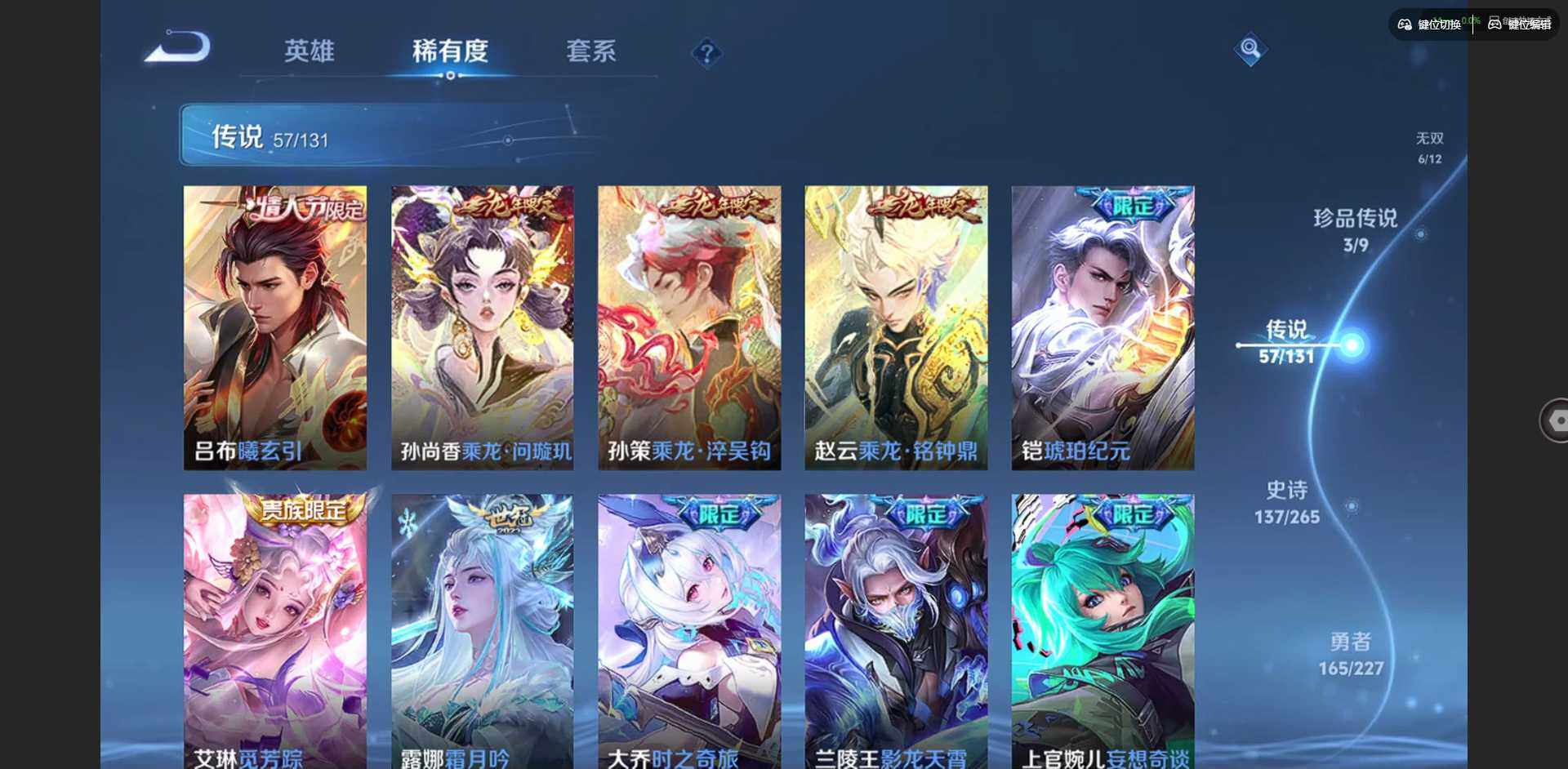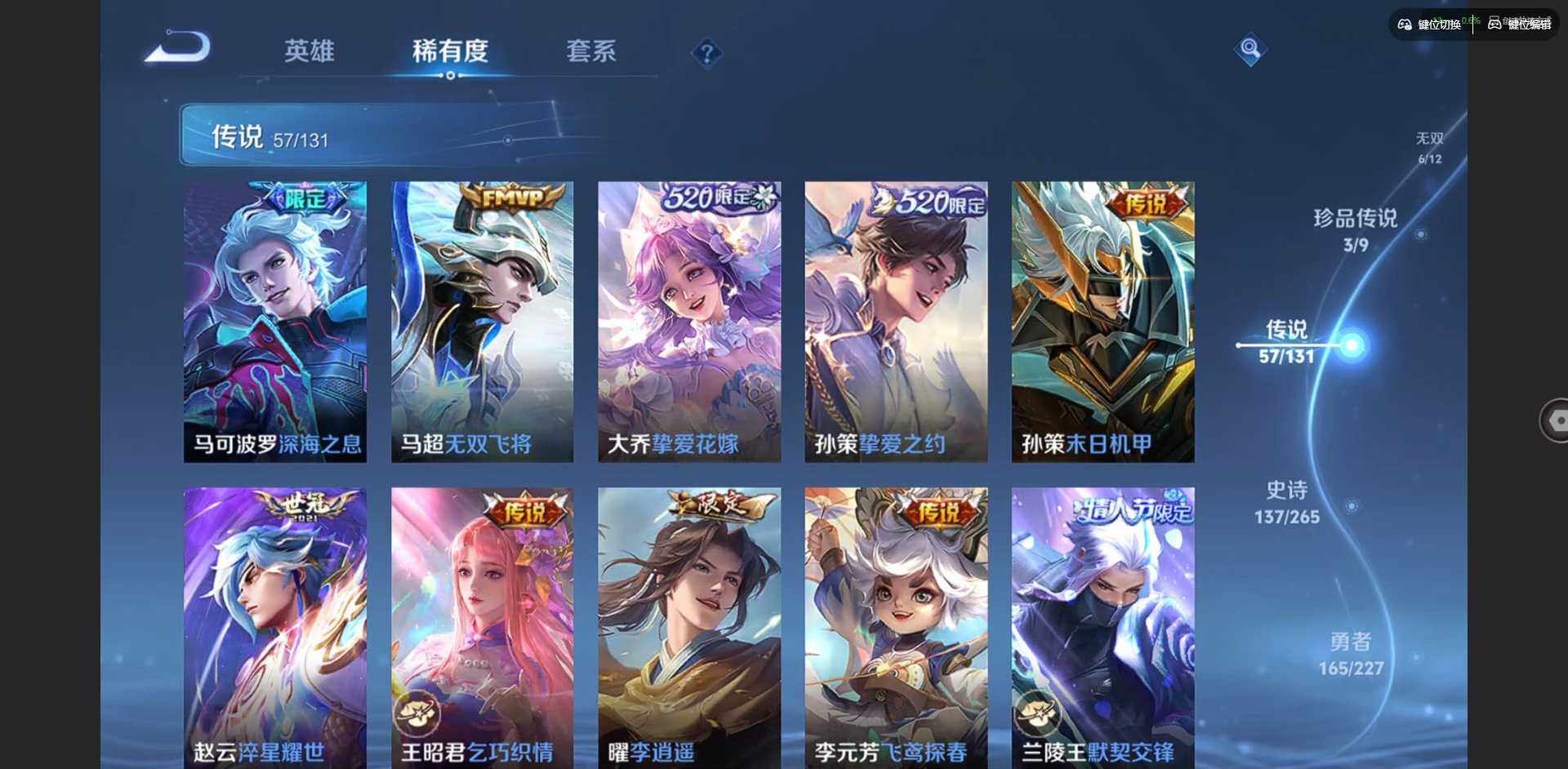 2328953-【金标李信 金标杨戬 金标花木兰 金标孙策 金标铠 金标赵云 朵莉亚全皮 孙策全皮 李信全皮 龙年限定全套】实名: 可修改 贵族等级: v10 英雄数: 128 皮肤数: 454 荣耀水晶: 武则天倪克斯神谕无限飓风号鸣剑·曳影星域神启九霄神辉银白咏叹调 无双皮: 碎月剑心小乔时之魔女花合斗离恨烟天机白泽神罪 珍品传说: 怪盗基德时之奇旅-孙策朽木白