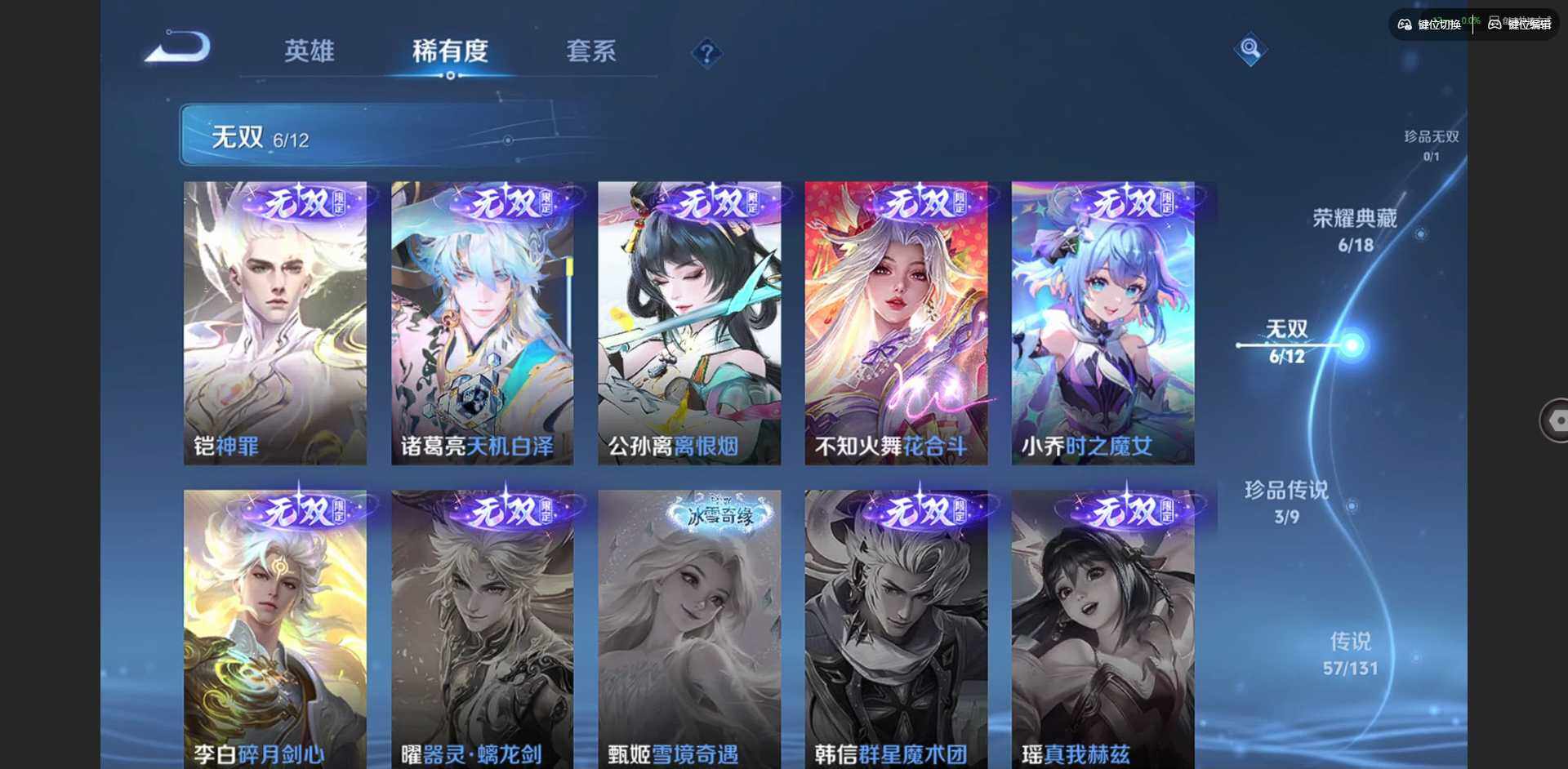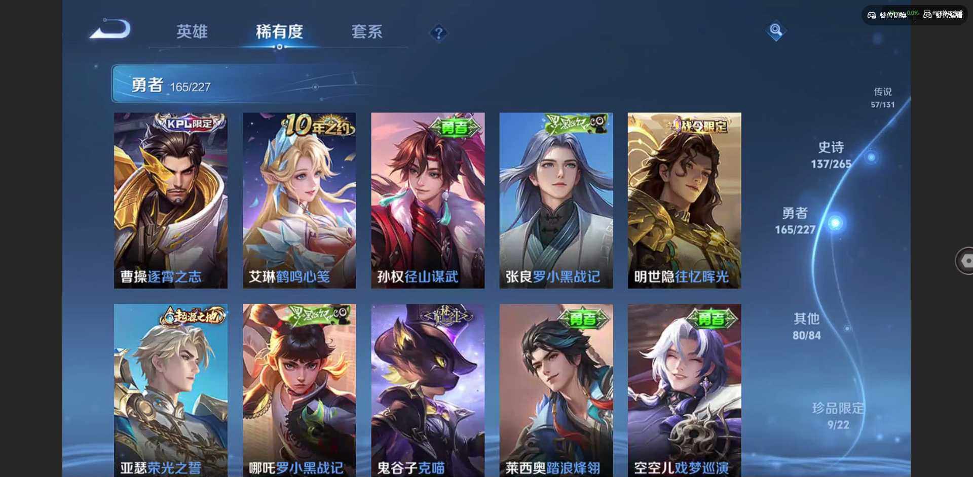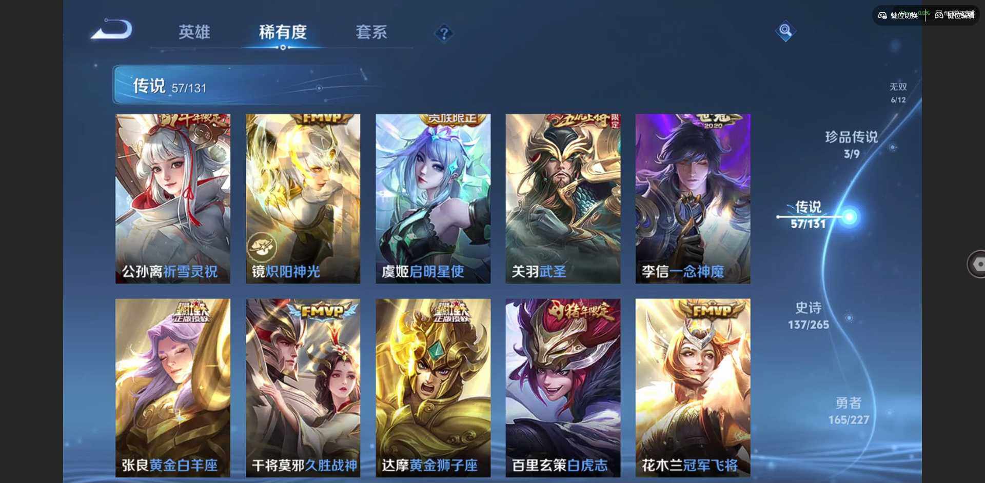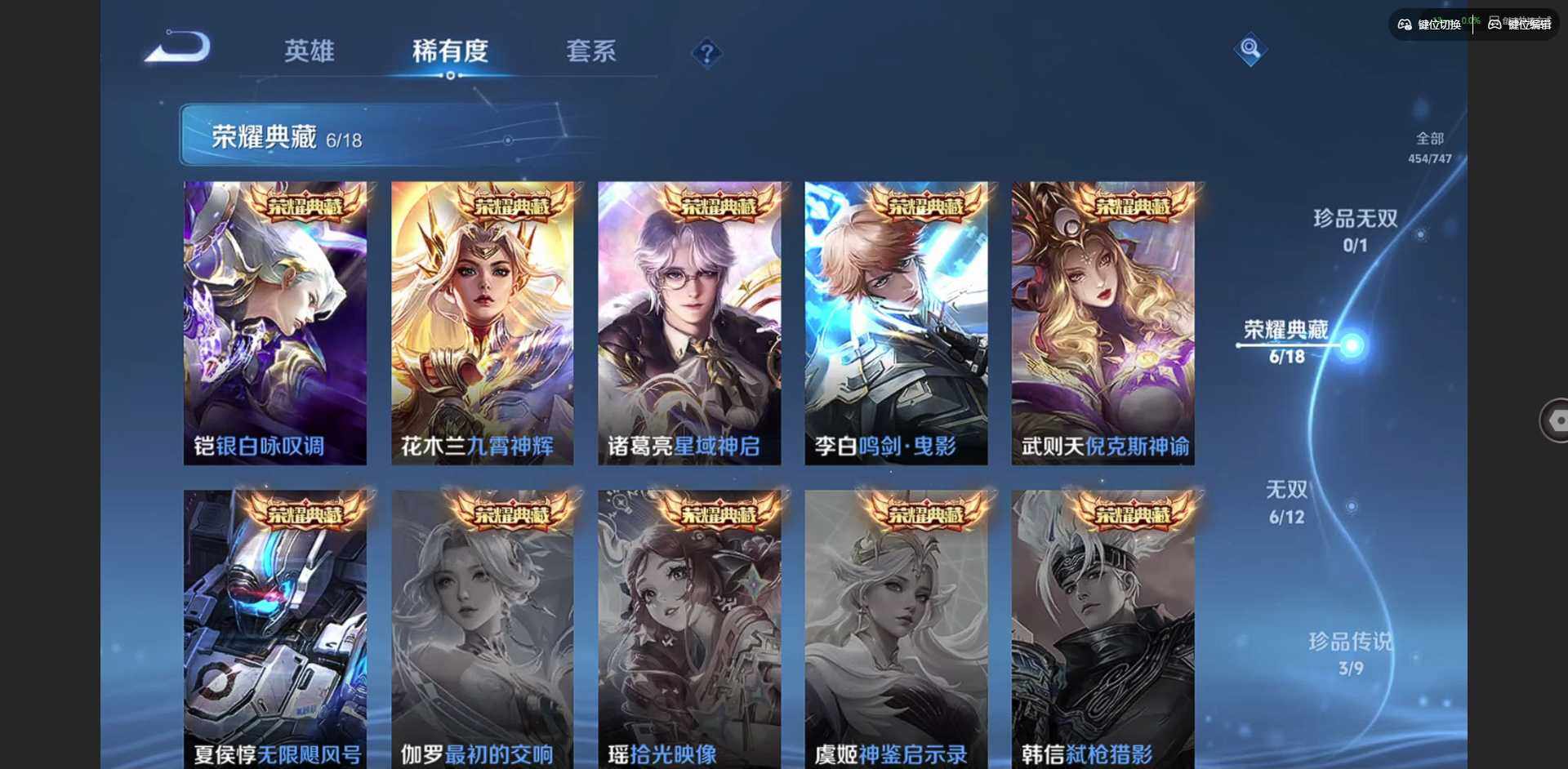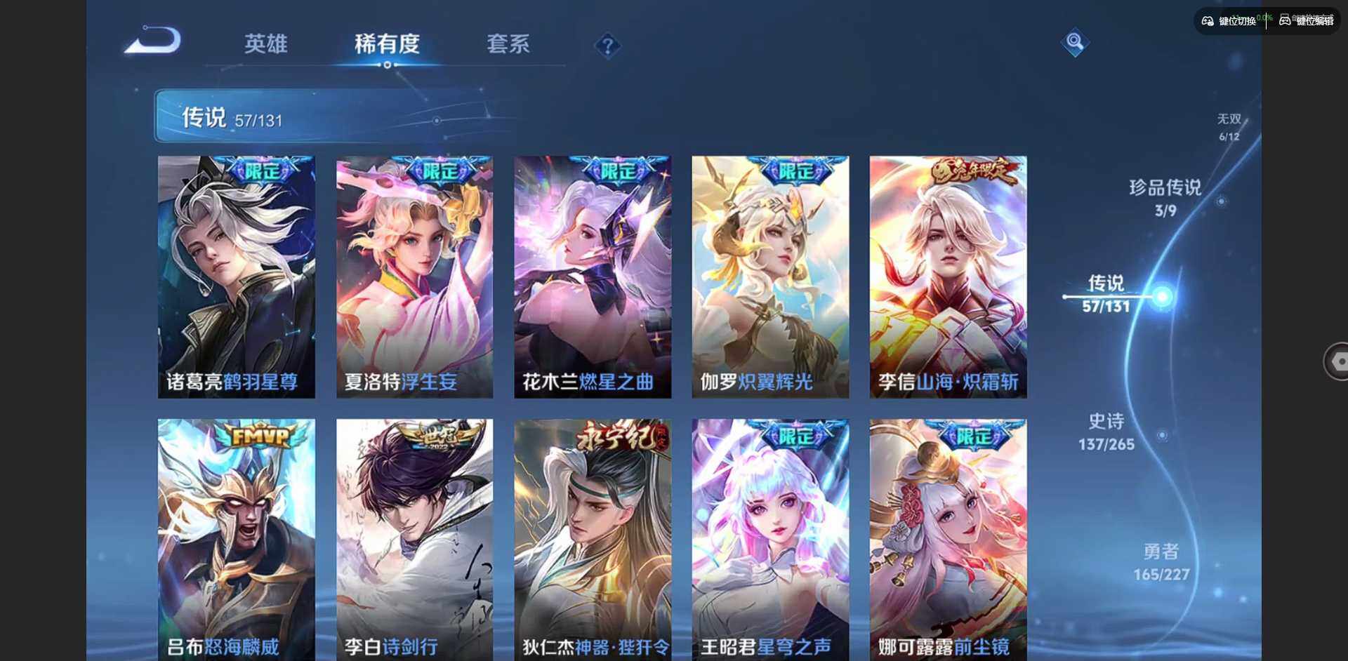 2328953-【金标李信 金标杨戬 金标花木兰 金标孙策 金标铠 金标赵云 朵莉亚全皮 孙策全皮 李信全皮 龙年限定全套】实名: 可修改 贵族等级: v10 英雄数: 128 皮肤数: 454 荣耀水晶: 武则天倪克斯神谕无限飓风号鸣剑·曳影星域神启九霄神辉银白咏叹调 无双皮: 碎月剑心小乔时之魔女花合斗离恨烟天机白泽神罪 珍品传说: 怪盗基德时之奇旅-孙策朽木白