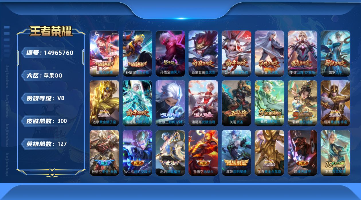 [14965760]【终身售后 找回包赔】苹果手q116区300皮2典藏21传说0无双 营地id414476775包人脸v8荣耀王者 [牛年全套]【荣耀典藏】:拾光映像全息碎影【星传说】:幽冥火,【优质限定皮肤】:山海·炽霜斩祈雪灵祝白虎志武圣神威至尊宝凤求凰【传说皮肤】:黄金白羊座神树通天鸣野蒿山海·炽霜斩太华遇见胡旋淬星耀世时雨天司祈雪灵祝默契交锋绛天战甲超时空战士启明星使零号·赤焰黄金狮子座白虎志武圣凤求凰黄金射手座武陵仙君地狱火【特殊英雄】:嬴政敖隐,【史诗皮肤】:暗渊魔法万灵启世星界战将涂山容容冰雪圆舞曲白蛇破空之剑遇见飞天暗夜贵公子绅士熊喵江河有灵地狱岩魂苍穹之光吟游魔法百木心呛水晶猎龙者火炮绅士傲雪梅呛匿光追影者蓝屏警告拒霜思真爱魔法朱雀志高山流水圣诞恋歌猪悟能孙行者时之奇旅幽灵船长冰冠公主未来纪元航海奇遇记天秀·启明乒乒小将蔷薇恋人逐梦之影女仆咖啡天狼溯光者缤纷独角兽胡桃异想国暗夜猫娘热力回旋末日机甲冰锋战神心灵战警王者之锤奔雷神使默契交锋云间偶戏乱世虎臣金属风暴御风骁将功夫厨神逐浪之夏白晶晶节奏热浪天狼运算者暗隐猎兽者纤云弄巧心灵骇客狂想玩偶喵星夜王子青龙志黄金分割率大圣娶亲李小龙时之恋人特工魅影暗影游猎紫霞仙子神威天狼绘梦者迷踪丽影烈魂箭羽风息晚萤乘风破浪嘻哈天王白龙吟龙胆千 星元:63星传说:1天幕:1按键:3签名:1贵族:8点卷:6皮肤碎片:158荣耀积分:250英雄碎片:596星传说:孙悟空幽冥火