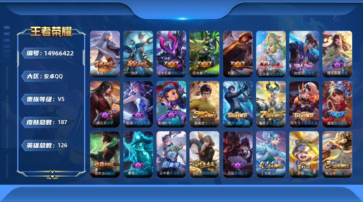 [14966422]qqy168【贵族5/最强王者段位/126英雄/187皮肤/6传说/46史诗/营地id:223002630】后羿神树通天,刘备时之恋人,伽罗太华,李白凤求凰,孙尚香末日机甲,宫本武藏地狱之眼,花木兰瑞麟志,孙悟空美猴王,李白凤求凰,伽罗太华,白起狰,姜子牙天穹之誓,狄仁杰阴阳师,虞姬凯尔特女王,赵云皇家上将,嬴政优雅恋人,嬴政白昼王子,庄周蜃楼王,庄周高山流水,高渐离死亡摇滚,孙膑妖精王,扁鹊炼金王,芈月重明,吕布猎兽之王,夏侯惇朔风刀,甄姬游园惊梦,曹操烛龙,典韦穷奇,狄仁杰魔术师,狄仁杰万华元夜,庄周蜃楼王,孙膑妖精王,扁鹊炼金王,白起狰,芈月重明,夏侯惇朔风刀,曹操烛龙,典韦穷奇,狄仁杰万华元夜,达摩沙漠行僧,老夫子醍醐杖,程咬金演武夺筹,嬴政优雅恋人,艾琳女武神,狂铁特工战影,详情看图