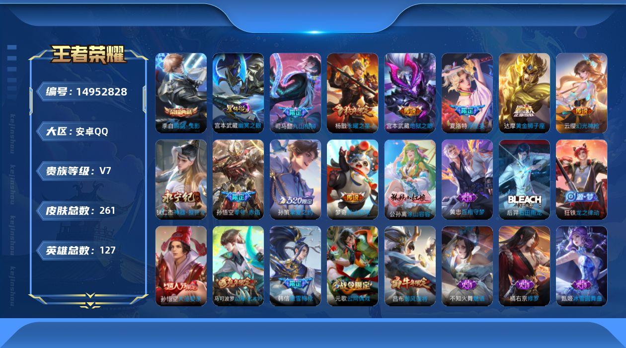 [14952828]安卓q-v7-最强王者段位-127英雄-260皮肤-1典藏皮肤-10传说-74史诗 【英雄全皮】:司马懿全皮,刘邦全皮,孙权全皮,蒙恬全皮,夏洛特全皮,影全皮 【荣耀典藏】:李白鸣剑曳影 【传说皮肤】:司马懿九山相柳,云缨幻光神呛,夏洛特浮生妄,狄仁杰神器狴犴令,孙策挚爱之约,孙悟空零号赤焰,达摩黄金狮子座,梦奇胖达荣荣,杨戬永曜之星,宫本武藏地狱之眼 【限定皮肤】:大乔绒语心约,狄仁杰阴阳师,赵云皇家上将,墨子神迹守卫,嬴政白昼王子,孙尚香蔷薇恋人,庄周高山流水,高渐离死亡摇滚,阿轲迷踪丽影,钟无艳超时空战士,扁鹊奇幻香踪,白起夜都怪侠,芈月幻夜卜梦,吕布御风骁将,元歌云间偶戏,元歌无心,甄姬落雪兰心,马可波罗山海玄木吟,狄仁杰魔术师,狄仁杰万华元夜,狄仁杰神器狴犴令,达摩沙漠行僧,项羽海滩派对,老夫子醍醐杖,老夫子航海奇遇记,程咬金演武夺筹,刘邦夺宝奇兵,韩信傲雪梅呛,王昭君午后时光,兰陵王金庭之子,亚瑟潮玩骑士王,孙悟空大圣娶亲,孙悟空零号赤焰,后羿圣弓游侠,李元芳银河之约,李元芳云中旅人,虞姬霸王别姬,钟馗驱傩正仪,杨玉环遇见飞天,杨戬永曜之星,杨戬潮玩骑兵,干将莫邪真爱魔法,雅典娜单词大作战,雅典娜黎明之约,太乙真人华丽摇滚,鬼谷子原初探秘者,鬼谷子五谷丰年,黄忠火炮绅士,苏烈千军破阵,百里玄策原初追逐者,弈星混沌棋,梦奇顽趣,沈梦溪星空之诺,沈梦溪大漠名商,明世隐疑决卦,明世隐吟游魔法,裴擒虎擒涛扼浪,狂铁电玩高手,云中君纤云弄巧,孙策挚爱之约,嫦娥拒霜思,蒙犽狂想玩偶喵,鲁班大师探海日志,桑启海盐诗旅,夏洛特浮生妄,艾琳女武神,张良古海寻踪,蒙恬荣光圣徽,高渐离燃音魔法,妲己灵卜魔法,鬼谷子天穹祈灯,沈梦溪龙舞盛年,刘邦剑破天穹,镜青焰无极,项羽苍威无极,刘备异域游侠,周瑜熔金海岸 【年限皮肤】:杨戬永曜之星,吕布御风骁将,马可波罗山海玄木吟 【赛季限定】:狄仁杰万华元夜,达摩沙漠行僧,老夫子醍醐杖,程咬金演武夺筹,兰陵王金庭之子,张良古海寻踪,李元芳云中旅人,钟馗驱傩正仪,雅典娜黎明之约,鬼谷子原初探秘者,苏烈千军破阵,百里玄策原初追逐者,弈星混沌棋,梦奇顽趣,沈梦溪大漠名商,明世隐疑决卦,裴擒虎擒涛扼浪,鲁班大师探海日志,桑启海盐诗旅,鬼谷子天穹祈灯,蒙恬荣光圣徽,刘邦剑破天穹 【战令限定】:墨子神迹守卫,嬴政白昼王子,阿轲迷踪丽影,钟无艳超时空