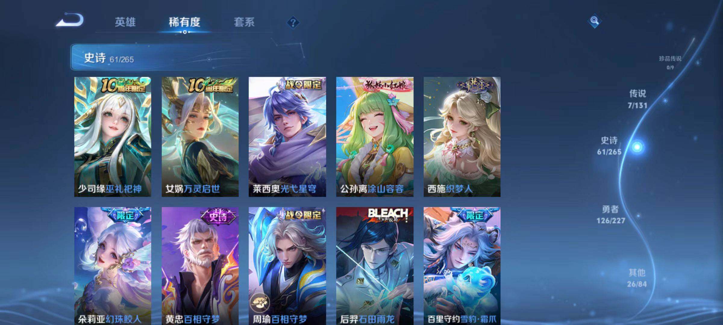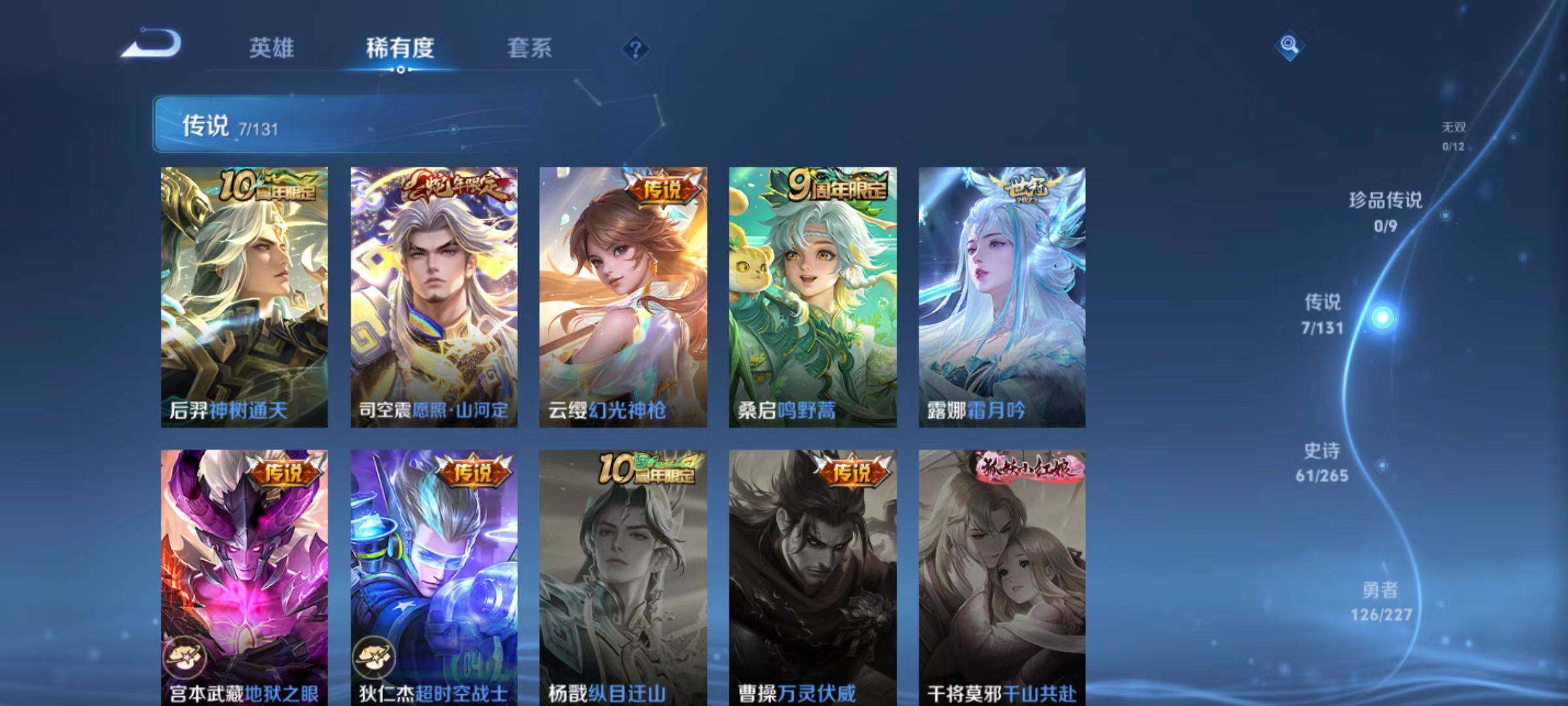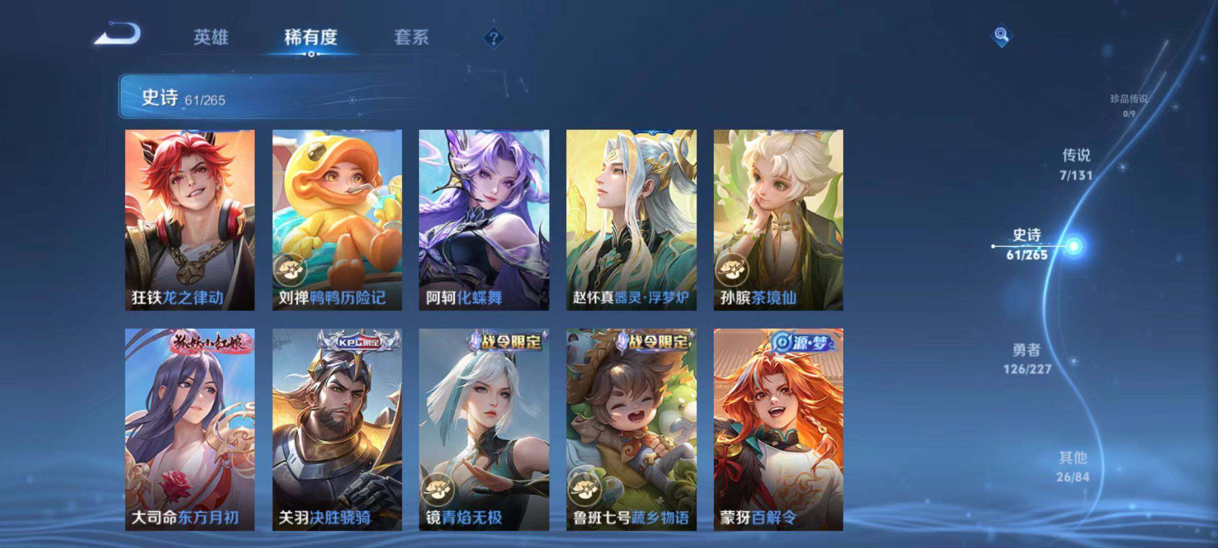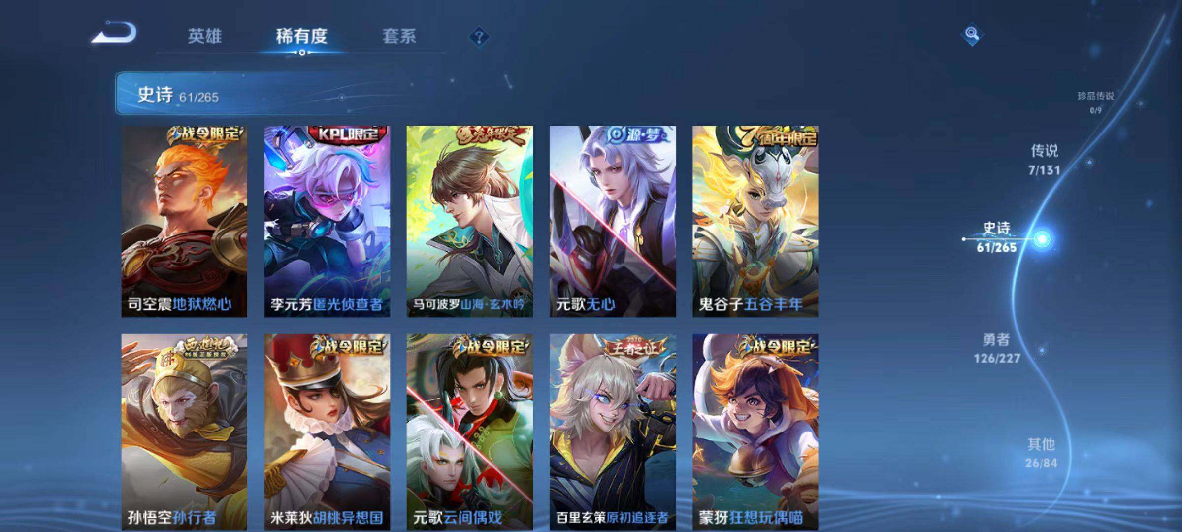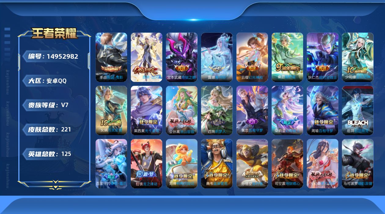 [14952982]安卓q-v7-最强王者段位-125英雄-221皮肤-1典藏皮肤-7传说-61史诗 【英雄全皮】:孙权全皮,司空震全皮,空空儿全皮 【荣耀典藏】:李白鸣剑曳影 【传说皮肤】:后羿神树通天,司空震愿照山河定,云缨幻光神呛,桑启鸣野蒿,露娜霜月吟,宫本武藏地狱之眼,狄仁杰超时空战士 【限定皮肤】:姜子牙天穹之誓,杨戬破阵退雄兵,狄仁杰阴阳师,赵云皇家上将,孙尚香蔷薇恋人,元歌云间偶戏,元歌无心,典韦蓝屏警告,马可波罗暗影游猎,马可波罗山海玄木吟,狄仁杰魔术师,狄仁杰万华元夜,达摩沙漠行僧,项羽海滩派对,老夫子醍醐杖,兰陵王金庭之子,孙悟空孙行者,李元芳匿光侦查者,李元芳云中旅人,钟馗驱傩正仪,杨戬潮玩骑兵,鬼谷子五谷丰年,苏烈千军破阵,百里玄策原初追逐者,沈梦溪大漠名商,明世隐疑决卦,米莱狄胡桃异想国,嫦娥暖冬兔眠,西施玲珑珍味,蒙犽狂想玩偶喵,鲁班大师探海日志,桑启海盐诗旅,艾琳女武神,司空震地狱燃心,张良古海寻踪,蒙犽百解令,妲己灵卜魔法,鬼谷子天穹祈灯,沈梦溪龙舞盛年,鲁班七号蔬乡物语,李元芳蔬乡物语,刘邦剑破天穹,程咬金群星魔术团,关羽决胜骁骑,镜青焰无极,项羽苍威无极,周瑜熔金海岸 【年限皮肤】:马可波罗山海玄木吟 【赛季限定】:狄仁杰万华元夜,达摩沙漠行僧,老夫子醍醐杖,兰陵王金庭之子,张良古海寻踪,李元芳云中旅人,钟馗驱傩正仪,苏烈千军破阵,百里玄策原初追逐者,沈梦溪大漠名商,明世隐疑决卦,鲁班大师探海日志,桑启海盐诗旅,鬼谷子天穹祈灯,刘邦剑破天穹,姜子牙天穹之誓 【战令限定】:元歌云间偶戏,典韦蓝屏警告,马可波罗暗影游猎,杨戬潮玩骑兵,米莱狄胡桃异想国,嫦娥暖冬兔眠,西施玲珑珍味,蒙犽狂想玩偶喵,司空震地狱燃心,妲己灵卜魔法,鲁班七号蔬乡物语,李元芳蔬乡物语,镜青焰无极,项羽苍威无极 【史诗皮肤】:鲁班七号电玩小子,阿轲暗夜猫娘,赵云皇家上将,甄姬冰雪圆舞曲,王昭君偶像歌手,狄仁杰魔术师,宫本武藏鬼剑武藏,孙尚香蔷薇恋人,孙尚香水果甜心,嬴政摇滚巨星,妲己魅力维加斯,妲己女仆咖啡,刘禅绅士熊喵,曹操幽灵船长,李白千年之狐,吕布末日机甲,张飞乱世虎臣,小乔缤纷独角兽,兰陵王暗隐猎兽者,百里守约特工魅影,铠曙光守护者,程咬金功夫厨神,白起星夜王子,阿轲节奏热浪,孙策猫狗日记,典韦蓝屏警告,伽罗箭羽风息,狄仁杰鹰眼统帅,公孙离无限星赏官,橘右京修罗,马可波罗