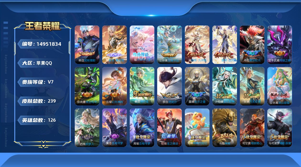[14951834]连体和平 苹果q-v7-最强王者段位-126英雄-239皮肤-1典藏皮肤-1无双-1珍品传说-11传说-69史诗 【英雄全皮】:孙权全皮,鬼谷子全皮,司空震全皮,空空儿全皮 【荣耀典藏】:韩信弑呛猎影 【无双皮肤】:曜器灵螭龙剑 【珍品传说】:瑶大耳狗之梦 【传说皮肤】:后羿神树通天,公孙离云诺千山,司空震愿照山河定,澜愿照九州拓,云缨幻光神呛,桑启鸣野蒿,马超琥珀纪元,李白诗剑行,露娜启示之音,孙尚香末日机甲,宫本武藏地狱之眼 【限定皮肤】:姜子牙天穹之誓,狄仁杰阴阳师,赵云皇家上将,嬴政优雅恋人,庄周高山流水,扁鹊奇幻香踪,芈月幻夜卜梦,吕布御风骁将,元歌无心,甄姬游园惊梦,马可波罗暗影游猎,马可波罗山海玄木吟,狄仁杰魔术师,狄仁杰万华元夜,达摩沙漠行僧,项羽海滩派对,老夫子醍醐杖,程咬金演武夺筹,露娜启示之音,兰陵王金庭之子,花木兰默契交锋,后羿圣弓游侠,李元芳云中旅人,钟馗驱傩正仪,杨玉环遇见飞天,干将莫邪胡桃夹子,干将莫邪真爱魔法,雅典娜黎明之约,鬼谷子原初探秘者,鬼谷子五谷丰年,黄忠火炮绅士,苏烈千军破阵,百里玄策原初追逐者,梦奇顽趣,沈梦溪大漠名商,裴擒虎李小龙,裴擒虎擒涛扼浪,鲁班大师探海日志,桑启海盐诗旅,艾琳女武神,艾琳流音漫舞,司空震地狱燃心,阿古朵江河有灵,张良古海寻踪,蒙恬荣光圣徽,鬼谷子天穹祈灯,马超琥珀纪元,沈梦溪龙舞盛年,刘邦剑破天穹,程咬金群星魔术团,周瑜熔金海岸 【年限皮肤】:吕布御风骁将,马超神威,马可波罗山海玄木吟 【赛季限定】:狄仁杰万华元夜,达摩沙漠行僧,老夫子醍醐杖,程咬金演武夺筹,兰陵王金庭之子,张良古海寻踪,李元芳云中旅人,钟馗驱傩正仪,雅典娜黎明之约,鬼谷子原初探秘者,苏烈千军破阵,百里玄策原初追逐者,梦奇顽趣,沈梦溪大漠名商,裴擒虎擒涛扼浪,鲁班大师探海日志,桑启海盐诗旅,鬼谷子天穹祈灯,蒙恬荣光圣徽,刘邦剑破天穹,姜子牙天穹之誓 【战令限定】:扁鹊奇幻香踪,芈月幻夜卜梦,马可波罗暗影游猎,艾琳流音漫舞,后羿圣弓游侠,干将莫邪真爱魔法,黄忠火炮绅士,司空震地狱燃心 【史诗皮肤】:鲁班七号电玩小子,露娜紫霞仙子,赵云皇家上将,赵云未来纪元,甄姬冰雪圆舞曲,王昭君偶像歌手,狄仁杰魔术师,廉颇地狱岩魂,宫本武藏鬼剑武藏,孙尚香水果甜心,嬴政优雅恋人,妲己魅力维加斯,妲己女仆咖啡,墨子金属风暴,曹操幽灵船长,李白千年之