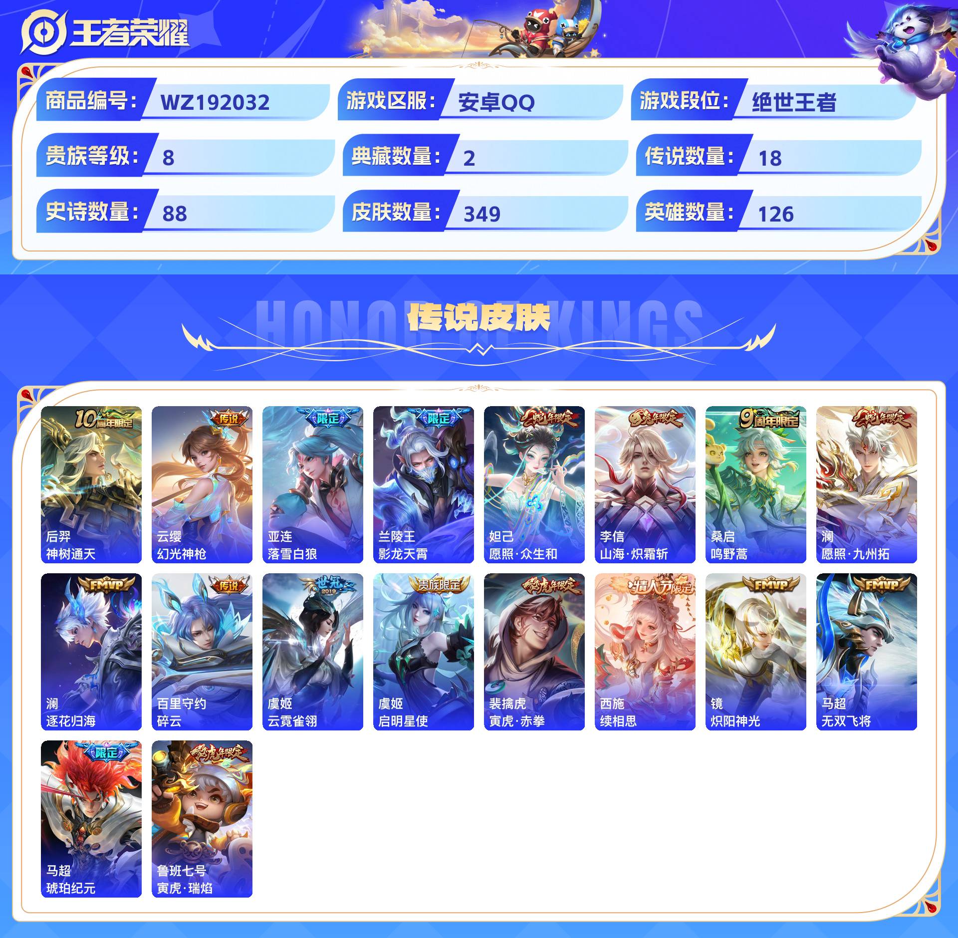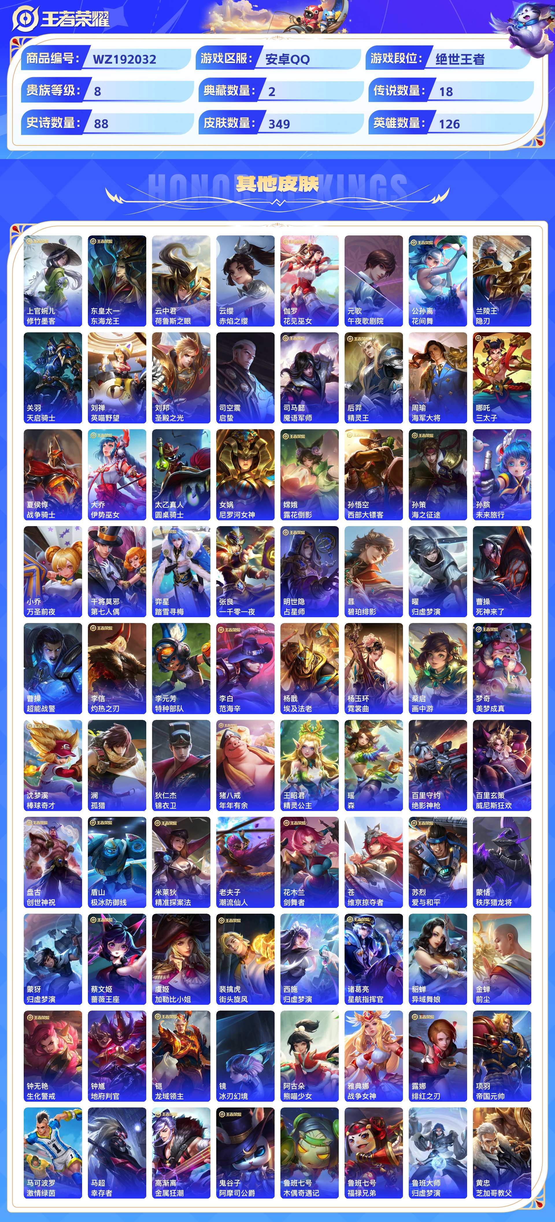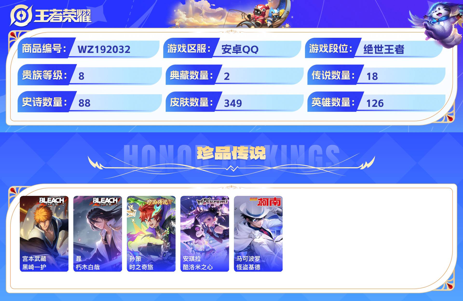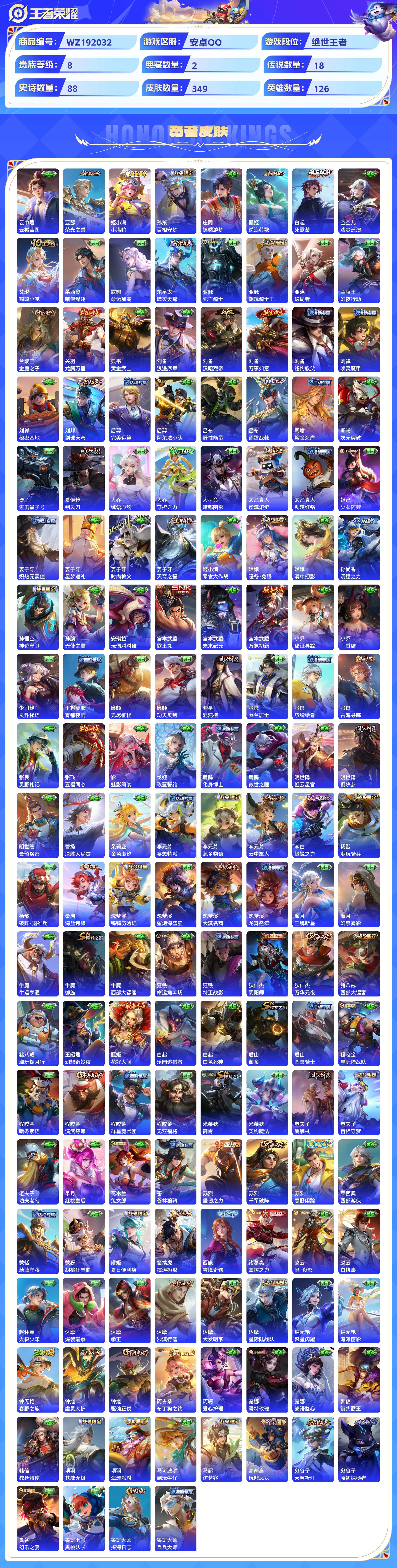 2301006-安卓qq 349皮 贵族8级 2典藏 5珍品传说 18传说 88史诗【荣耀典藏】鸣剑·曳影弑呛猎影【珍品传说】黑崎一护朽木白哉时之奇旅酷洛米之心怪盗基德【传说皮肤】神树通天幻光神呛落雪白狼影龙天霄愿照·众生和山海·炽霜斩鸣野蒿愿照·九州拓逐花归海碎云云霓雀翎启明星使寅虎·赤拳续相思炽阳神光无双飞将琥珀纪元寅虎·瑞焰【史诗皮肤】赞萌露