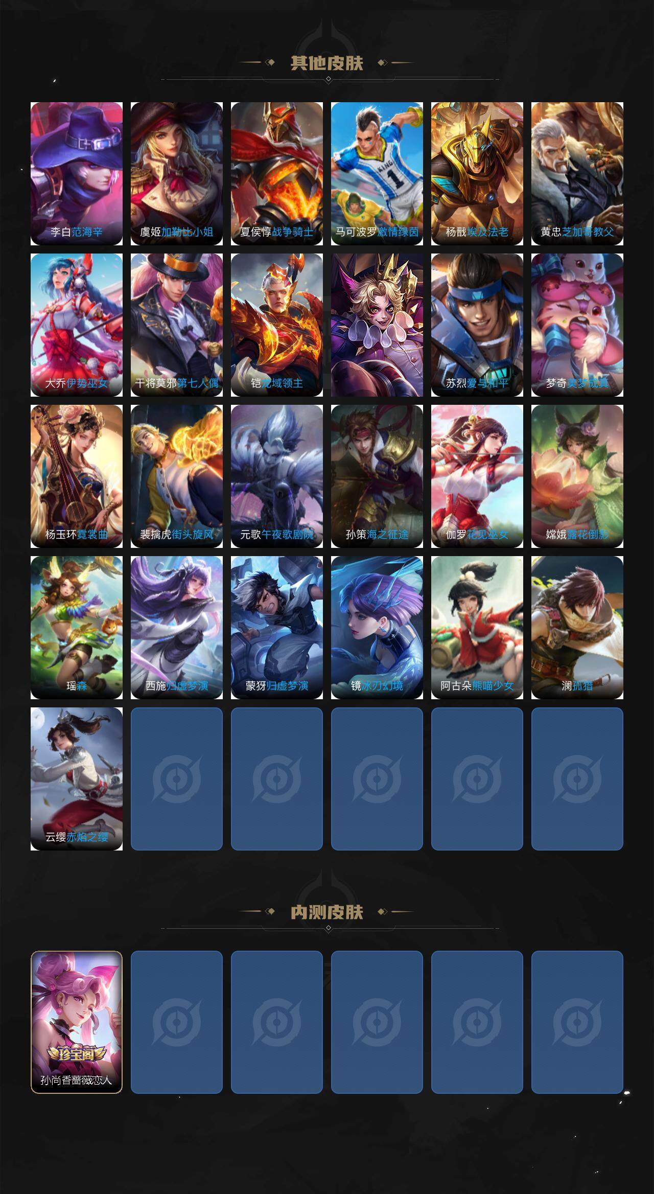 126英雄-142皮肤-贵族0/皮肤142/传说3/史诗30/英雄126/仲夏夜之梦 貂蝉/地狱之眼 宫本武藏/超时空战士 狄仁杰/狰 白起/阴阳师 狄仁杰/凯尔特女王 虞姬/皇家上将 赵云/白昼王子 嬴政/蔷薇恋人 孙尚香/狮舞东方 鲁班七号/蜃楼王 庄周/妖精王 孙膑/炼金王 扁鹊/重明 芈月/猎兽之王 吕布/朔风刀 夏侯惇/烛龙 曹操/穷奇 典韦/魔术师 狄仁杰/万华元夜 狄仁杰/沙漠行僧 达摩/海滩派对 项羽