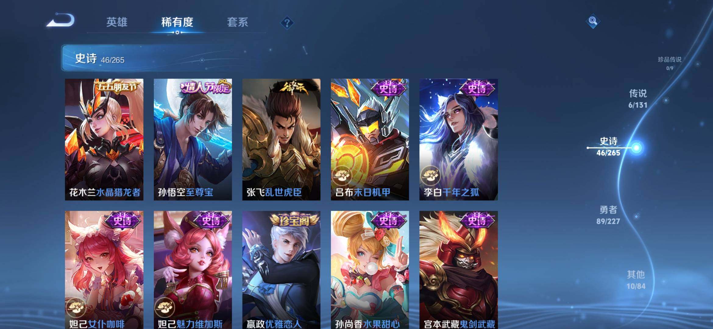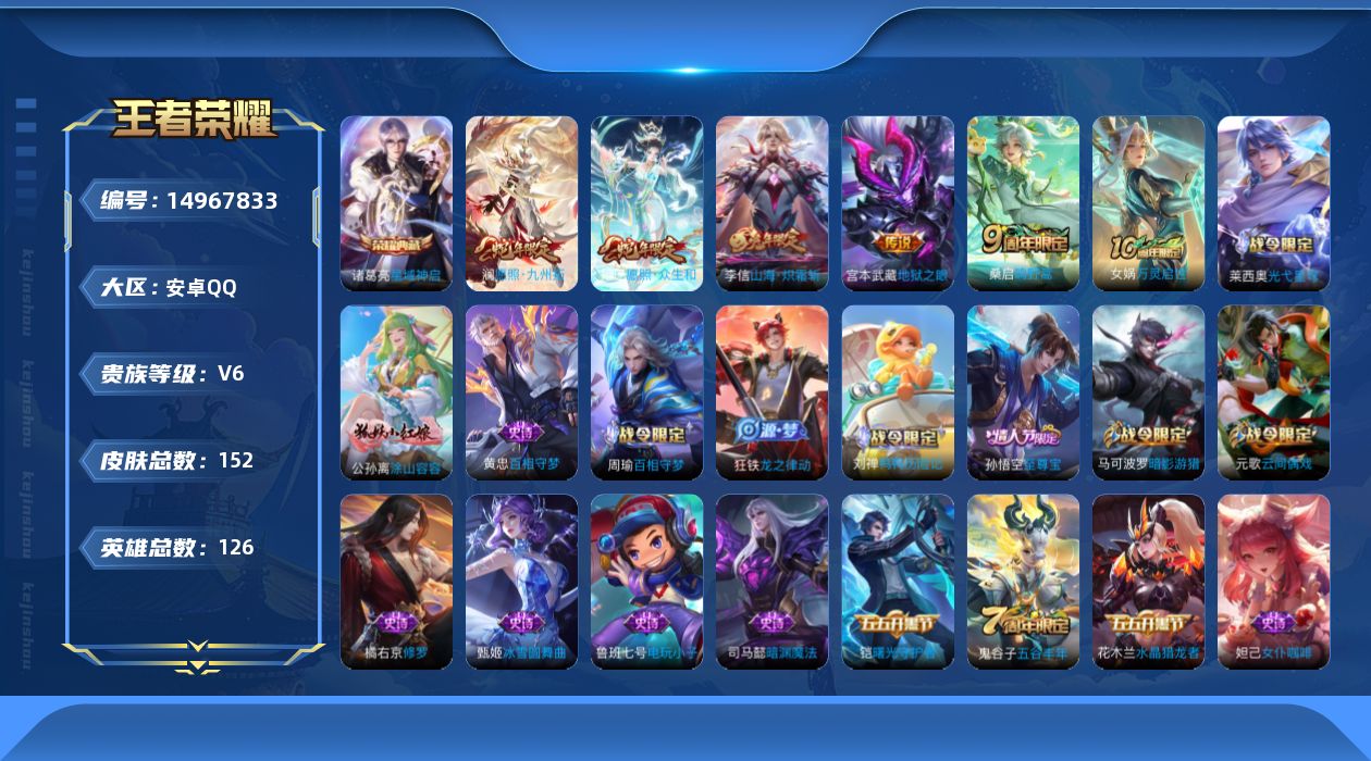 [14967833]安卓q-v6-最强王者段位-126英雄-152皮肤-1典藏皮肤-6传说-46史诗 【荣耀典藏】:诸葛亮星域神启 【传说皮肤】:后羿神树通天,妲己愿照众生和,澜愿照九州拓,桑启鸣野蒿,李信山海炽霜斩,宫本武藏地狱之眼 【限定皮肤】:姜子牙天穹之誓,狄仁杰阴阳师,赵云皇家上将,墨子降魔,嬴政优雅恋人,元歌云间偶戏,马可波罗暗影游猎,狄仁杰魔术师,项羽海滩派对,孙悟空至尊宝,李元芳云中旅人,杨戬潮玩骑兵,雅典娜黎明之约,鬼谷子五谷丰年,沈梦溪大漠名商,裴擒虎擒涛扼浪,米莱狄胡桃异想国,李信山海炽霜斩,鲁班大师探海日志,桑启海盐诗旅,张良古海寻踪,鬼谷子天穹祈灯,沈梦溪龙舞盛年 【年限皮肤】:李信山海炽霜斩 【赛季限定】:张良古海寻踪,李元芳云中旅人,雅典娜黎明之约,沈梦溪大漠名商,裴擒虎擒涛扼浪,鲁班大师探海日志,桑启海盐诗旅,鬼谷子天穹祈灯,姜子牙天穹之誓 【战令限定】:元歌云间偶戏,马可波罗暗影游猎,杨戬潮玩骑兵,米莱狄胡桃异想国 【史诗皮肤】:鲁班七号电玩小子,赵云皇家上将,赵云未来纪元,甄姬冰雪圆舞曲,王昭君偶像歌手,狄仁杰魔术师,宫本武藏鬼剑武藏,孙尚香水果甜心,嬴政优雅恋人,妲己魅力维加斯,妲己女仆咖啡,李白千年之狐,吕布末日机甲,张飞乱世虎臣,孙悟空至尊宝,花木兰水晶猎龙者,刘邦德古拉伯爵,夏侯惇乘风破浪,小乔缤纷独角兽,兰陵王暗隐猎兽者,百里守约特工魅影,铠曙光守护者,李元芳逐浪之夏,阿轲节奏热浪,孙策猫狗日记,伽罗箭羽风息,狄仁杰鹰眼统帅,小乔青蛇,橘右京修罗,马可波罗暗影游猎,元歌云间偶戏,米莱狄胡桃异想国,司马懿暗渊魔法,雅典娜黎明之约,鬼谷子五谷丰年,墨子降魔,马可波罗星界特工,百里守约百相守梦,孙膑茶境仙,刘禅鸭鸭历险记,狂铁龙之律动,周瑜百相守梦,黄忠百相守梦,公孙离涂山容容,莱西奥光弋星穹,女娲万灵启世 【其他皮肤】:项羽海滩派对,韩信教廷特使,韩信街头霸王,阿轲爱心护理,赵云忍炎影,白起白色死神,扁鹊化身博士,扁鹊救世之瞳,宫本武藏未来纪元,安琪拉玩偶对对碰,孙膑天使之翼,典韦黄金武士,亚瑟死亡骑士,达摩拳王,花木兰兔女郎,甄姬花好人间,后羿阿尔法小队,狄仁杰阴阳师,刘备纽约教父,刘备汉昭烈帝,关羽龙腾万里,钟无艳海滩丽影,老夫子功夫老勺,孙尚香沉稳之力,诸葛亮掌控之力,李白敏锐之力,苏烈坚韧之力,大乔守护之力,明世隐虹云星官,小乔丁香结