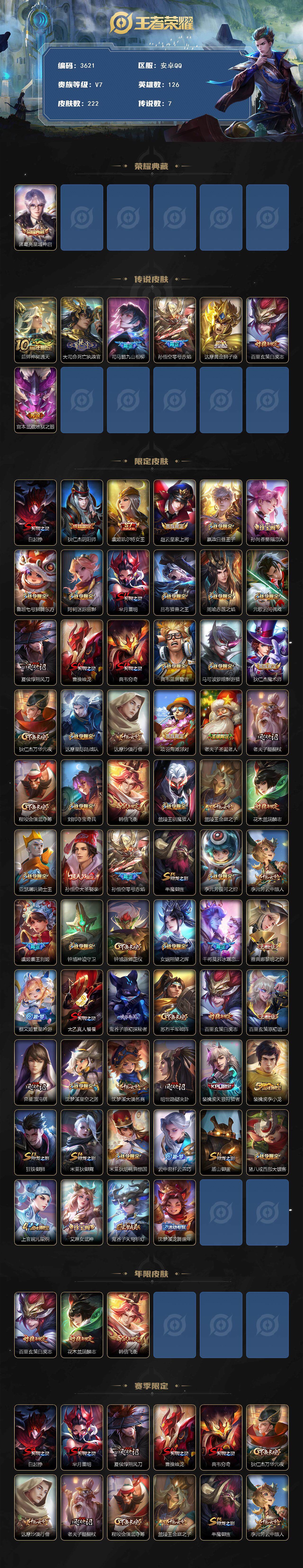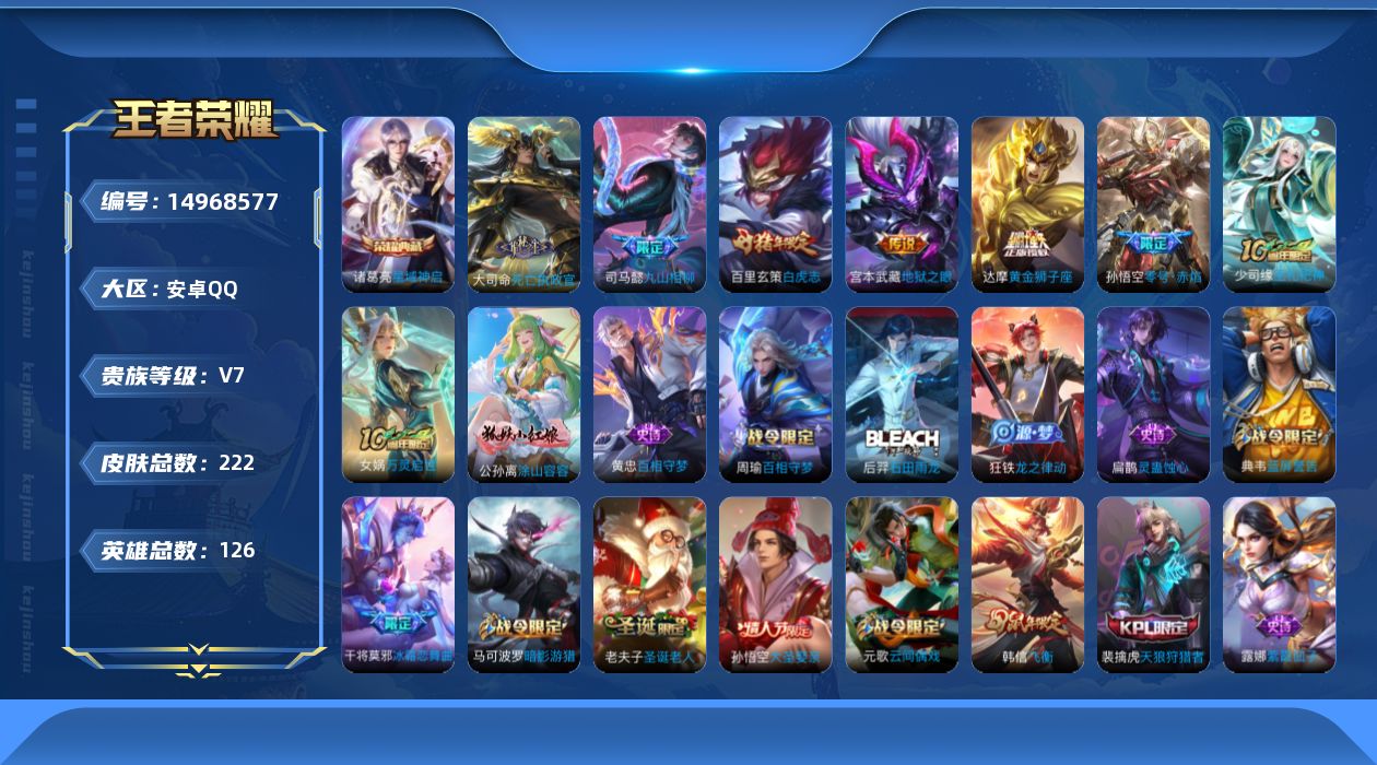 [14968577]安卓q-v7-最强王者段位-126英雄-222皮肤-1典藏皮肤-7传说-62史诗 【英雄全皮】:孙权全皮 【荣耀典藏】:诸葛亮星域神启 【传说皮肤】:后羿神树通天,大司命死亡执政官,司马懿九山相柳,孙悟空零号赤焰,达摩黄金狮子座,百里玄策白虎志,宫本武藏地狱之眼 【限定皮肤】:白起狰,狄仁杰阴阳师,虞姬凯尔特女王,赵云皇家上将,嬴政白昼王子,孙尚香蔷薇恋人,鲁班七号狮舞东方,阿轲迷踪丽影,芈月重明,吕布猎兽之王,周瑜赤莲之焰,元歌云间偶戏,夏侯惇朔风刀,曹操烛龙,典韦穷奇,典韦蓝屏警告,马可波罗暗影游猎,狄仁杰魔术师,狄仁杰万华元夜,达摩星际陆战队,达摩沙漠行僧,项羽海滩派对,老夫子圣诞老人,老夫子醍醐杖,程咬金演武夺筹,刘邦夺宝奇兵,韩信飞衡,兰陵王驯魔猎人,兰陵王金庭之子,花木兰瑞麟志,亚瑟潮玩骑士王,孙悟空大圣娶亲,孙悟空零号赤焰,牛魔御旌,李元芳银河之约,李元芳云中旅人,虞姬霸王别姬,钟馗神迹守卫,钟馗驱傩正仪,女娲朔望之晖,干将莫邪冰霜恋舞曲,雅典娜黎明之约,蔡文姬繁星吟游,太乙真人饕餮,鬼谷子原初探秘者,苏烈千军破阵,百里玄策白虎志,百里玄策原初追逐者,弈星混沌棋,沈梦溪星空之诺,沈梦溪大漠名商,明世隐疑决卦,裴擒虎天狼狩猎者,裴擒虎李小龙,狂铁御狮,米莱狄御霄,米莱狄胡桃异想国,云中君纤云弄巧,盾山御銮,猪八戒西部大镖客,上官婉儿梁祝,艾琳女武神,鬼谷子天穹祈灯,沈梦溪龙舞盛年 【年限皮肤】:百里玄策白虎志,花木兰瑞麟志,韩信飞衡 【赛季限定】:白起狰,芈月重明,夏侯惇朔风刀,曹操烛龙,典韦穷奇,狄仁杰万华元夜,达摩沙漠行僧,老夫子醍醐杖,程咬金演武夺筹,兰陵王金庭之子,牛魔御旌,李元芳云中旅人,虞姬凯尔特女王,钟馗驱傩正仪,雅典娜黎明之约,太乙真人饕餮,鬼谷子原初探秘者,苏烈千军破阵,百里玄策原初追逐者,弈星混沌棋,沈梦溪大漠名商,明世隐疑决卦,狂铁御狮,米莱狄御霄,盾山御銮,鬼谷子天穹祈灯 【战令限定】:嬴政白昼王子,鲁班七号狮舞东方,阿轲迷踪丽影,吕布猎兽之王,周瑜赤莲之焰,元歌云间偶戏,典韦蓝屏警告,马可波罗暗影游猎,达摩星际陆战队,刘邦夺宝奇兵,兰陵王驯魔猎人,亚瑟潮玩骑士王,李元芳银河之约,钟馗神迹守卫,女娲朔望之晖,沈梦溪星空之诺,米莱狄胡桃异想国,猪八戒西部大镖客 【史诗皮肤】:项羽苍穹之光,露娜紫霞仙子,阿轲暗夜猫娘,赵云皇家上将,