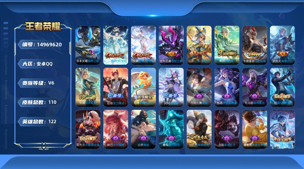 [14969620]【终身售后 找回包赔】安卓手q494区110皮0典藏8传说0无双 营地id1623566431包人脸v6至圣王者星元皮肤:貂蝉-荧星流火 【星传说】:幽冥之眼,【优质限定皮肤】:山海·琳琅生【传说皮肤】:千山共赴海洋之心地狱之眼久胜战神愿照·千秋盛愿照·众生和山海·琳琅生鸣野蒿【特殊英雄】:嬴政敖隐,【史诗皮肤】:龙之律动金属风暴水晶猎龙者星界战将乱世虎臣曙光守护者暗渊魔法热力回旋万物之道万灵启世幽灵船长鬼剑武藏星夜王子心灵战警摇滚巨星青蛇鸭鸭历险记化蝶舞黄金分割率冰雪圆舞曲魔术师皇家上将地狱岩魂魅语未来纪元缤纷独角兽唤灵魅影女仆咖啡德古拉伯爵冰冠公主鹰眼统帅水果甜心顽岩魄魅力维加斯黎明之约圣诞恋歌猫狗日记 星元:9星传说:1按键:4签名:1贵族:6点卷:4皮肤碎片:28荣耀积分:15英雄碎片:55星传说:宫本武藏幽冥之眼