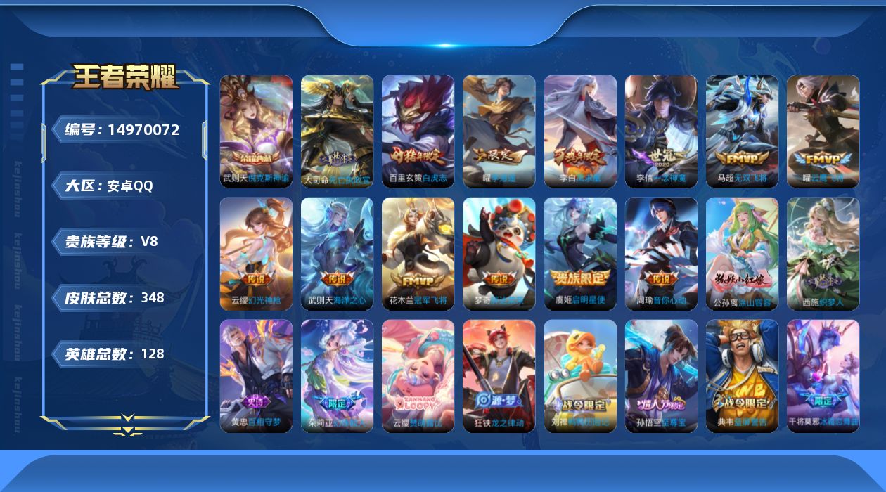 [14970072]v8 1典藏 13传说 128英雄 348皮肤 典藏英雄武则天 可修改实名 【英雄全皮】:敖隐全皮刘邦全皮阿轲全皮影全皮 【稀有英雄】:敖隐小龙人大司命嬴政始皇帝韩信韩跳跳夏洛特夏师傅艾琳橘右京橘子娜可露露鸟人不知火舞赵云金蝉唐僧戈娅 【荣耀水晶】:倪克斯神谕宇宙婆娘 【传说皮】:死亡执政官幻光神呛李海洋之心一念神魔冠军飞将云鹰飞将小将军无双飞将音你心动-周瑜胖达荣荣 【珍宝阁皮】:妄想食味 【赛季/战令皮】:擒涛扼浪s31剑破天穹s35天穹祈灯s34天穹之誓s36蔡文姬夏日便利店虞姬夏日便利店狮心王s3蜃楼王s4妖精王s5炼金王s6凯尔特女王s7狰s8饕餮s9烛龙s10重明s11穷奇s12御狮s13御霄s14御旌s15御銮s16朔风刀s17混沌棋s18疑决卦s19醍醐杖s20原初探秘者s21万华元夜s22演武夺筹s23猎兽之王白昼王子朔望之晖蓝屏警告神迹守卫-钟馗狮舞东方赤莲之焰驯魔猎人星空之诺银河之约夺宝奇兵迷踪丽影单词大作战狂想玩偶喵潮玩骑士王云间偶戏星际陆战队-达摩胡桃异想国沙漠行僧s26金庭之子s27 【史诗皮】:赞萌露比化蝶舞鸭鸭历险记-刘禅龙之律动幻珠鲛人百相守梦-黄忠织梦人破空之剑蒙犽顽岩魄埋骨钱涂山容容遇见神鹿紫霞仙子苍穹之光白龙吟黄金分割率特工魅影千年之狐永昼龙骑士小龙虾冰冠公主青蛇偶像歌手晚萤无限星赏官魅语白蛇暗夜猫娘末日机甲-吕布猫狗日记-孙策猫狗日记-大乔时之恋人-孙尚香乱世虎臣节奏热浪修罗女仆咖啡摇滚巨星水果甜心绅士熊喵天才门将星夜王子心灵骇客时之奇旅-安琪拉功夫厨神德古拉伯爵暗隐猎兽者幽灵船长鬼剑武藏暗渊魔法心灵战警舞动绿茵地狱岩魂诗语江南纤云弄巧繁星吟游呼啦呼啦缤纷独角兽乘风破浪逐浪之夏龙鼓争鸣水晶猎龙者曙光守护者热力回旋唤灵魅影金属风暴原初追逐者圣诞狂欢圣诞恋歌鹰眼统帅王者之锤暗夜贵公子魅力维加斯赏金猎