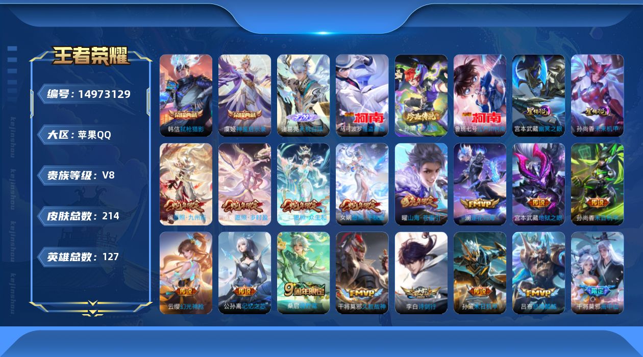[14973129]v8-214皮肤-2典藏皮肤-1无双-3珍品传说-22传说-58史诗tt1547 【英雄全皮】:蒙恬全皮,空空儿全皮,影全皮 【荣耀典藏】:韩信弑呛猎影,虞姬神鉴启示录 【无双皮肤】:诸葛亮天机白泽 【珍品传说】:马可波罗怪盗基德,鲁班七号江户川柯南,孙策时之奇旅 【传说皮肤】:后羿神树通天,女娲愿照千秋盛,妲己愿照众生和,澜愿照九州拓,虞姬愿照岁时盈,云缨幻光神呛,嬴政玄雷天君,桑启鸣野蒿,澜逐花归海,张飞百相守梦,公孙离记忆之芯,干将莫邪画中仙,项羽无限倾心,曜山海苍雷引,吕布怒海麟威,李白诗剑行,孙策末日机甲,李元芳飞鸢探春,虞姬启明星使,干将莫邪久胜战神,孙尚香末日机甲,宫本武藏地狱之眼 【限定皮肤】:狄仁杰阴阳师,赵云皇家上将,扁鹊奇幻香踪,元歌无心,马可波罗暗影游猎,马可波罗山海玄木吟,狄仁杰魔术师,项羽海滩派对,项羽无限倾心,关羽百相守梦,露娜一生所爱,孙悟空至尊宝,刘备百相守梦,张飞百相守梦,李元芳云中旅人,虞姬启明星使,杨玉环遇见飞天,杨戬潮玩骑兵,干将莫邪画中仙,雅典娜黎明之约,沈梦溪匿光破解者,裴擒虎擒涛扼浪,上官婉儿梁祝,嫦娥暖冬兔眠,曜山海苍雷引,鲁班大师探海日志,桑启海盐诗旅,暃星界游侠,艾琳流音漫舞,司空震地狱燃心,阿古朵江河有灵,张良古海寻踪,蒙恬荣光圣徽,妲己灵卜魔法,鬼谷子天穹祈灯,沈梦溪龙舞盛年,刘邦剑破天穹 【年限皮肤】:马可波罗山海玄木吟,曜山海苍雷引 【赛季限定】:张良古海寻踪,李元芳云中旅人,雅典娜黎明之约,裴擒虎擒涛扼浪,鲁班大师探海日志,桑启海盐诗旅,鬼谷子天穹祈灯,蒙恬荣光圣徽,刘邦剑破天穹 【战令限定】:扁鹊奇幻香踪,马可波罗暗影游猎,艾琳流音漫舞,杨戬潮玩骑兵,嫦娥暖冬兔眠,司空震地狱燃心,暃星界游侠,妲己灵卜魔法 【史诗皮肤】:露娜紫霞仙子,赵云皇家上将,赵云未来纪元,貂蝉圣诞恋歌,甄姬冰雪圆舞曲,狄仁杰魔术师,宫本武藏鬼剑武藏,孙尚香水果甜心,嬴政暗夜贵公子,嬴政摇滚巨星,妲己魅力维加斯,墨子金属风暴,吕布圣诞狂欢,曹操幽灵船长,李白千年之狐,孙悟空至尊宝,花木兰水晶猎龙者,夏侯惇乘风破浪,小乔缤纷独角兽,兰陵王暗隐猎兽者,雅典娜冰冠公主,安琪拉心灵骇客,百里守约特工魅影,刘禅天才门将,李元芳逐浪之夏,白起星夜王子,阿轲节奏热浪,杨玉环遇见飞天,露娜一生所爱,狄仁杰鹰眼统帅,上官婉儿梁祝,不知火舞魅语,橘