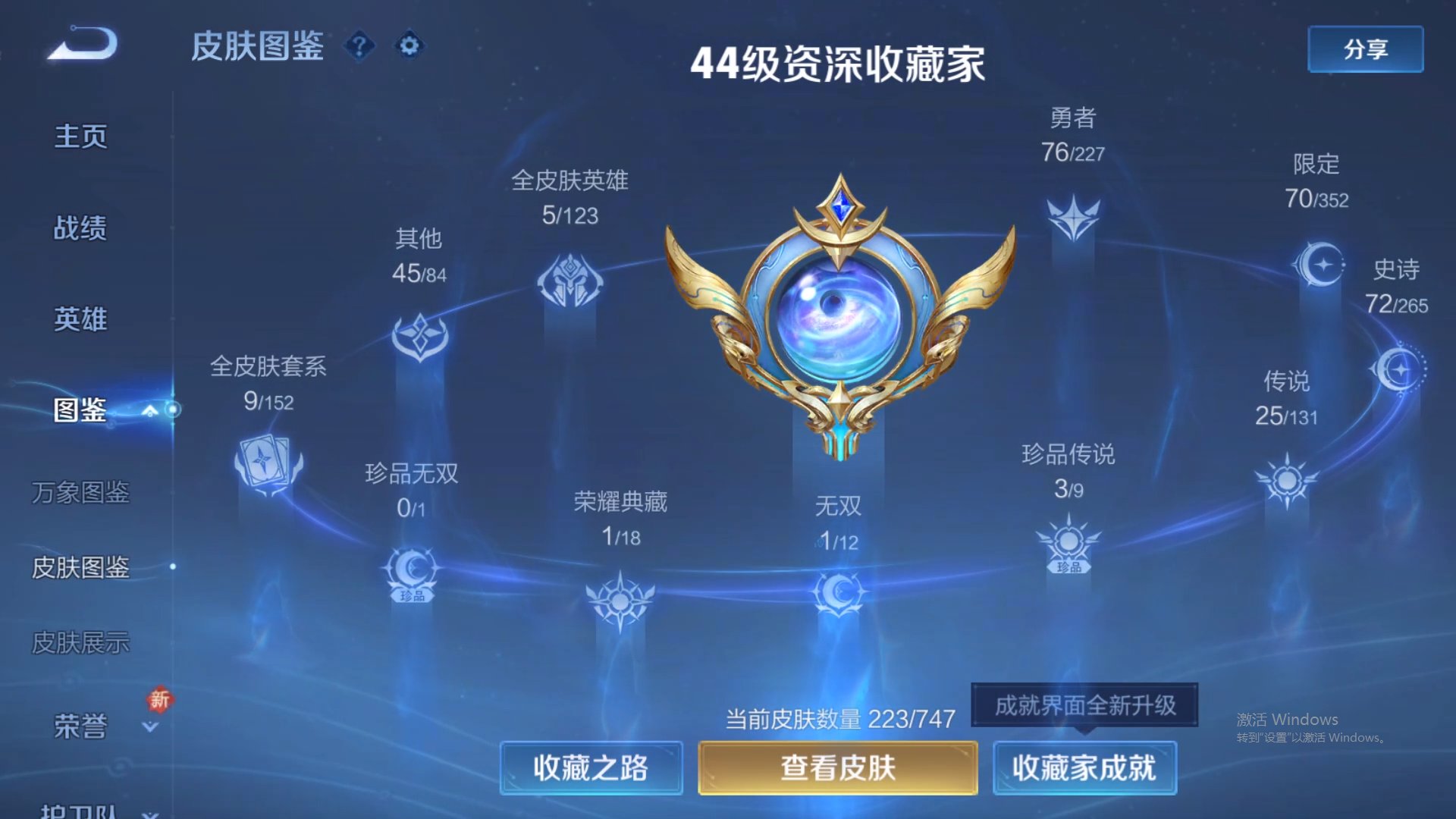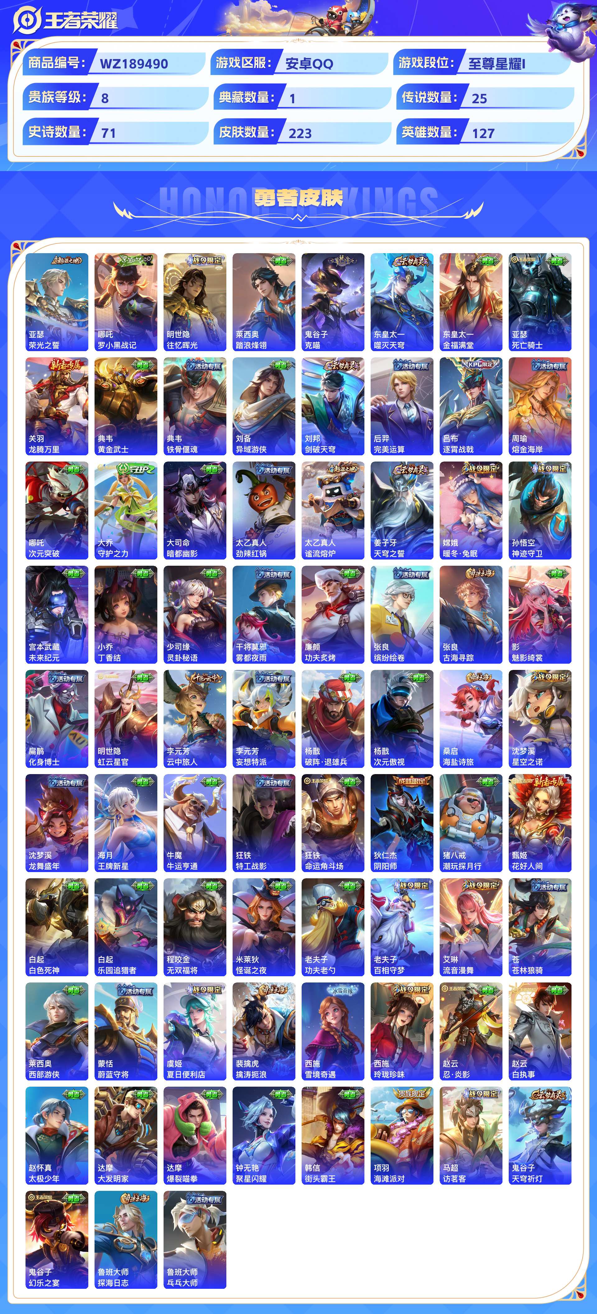 2293059-安卓qq 223皮 贵族8级 1典藏 3珍品传说 1无双 25传说 71史诗【荣耀典藏】鸣剑·曳影【珍品传说】时之奇旅怪盗基德江户川柯南【无双限定】真我赫兹【传说皮肤】幻光神呛战鼓燎原时之恋人浮生妄玄雷天君零号·赤焰齐天大圣末日机甲音你心动山海·苍雷引云鹰飞将一念神魔山海·炽霜斩鸣野蒿逐花归海映山客云霓雀翎启明星使淬星耀世黄金狮子座