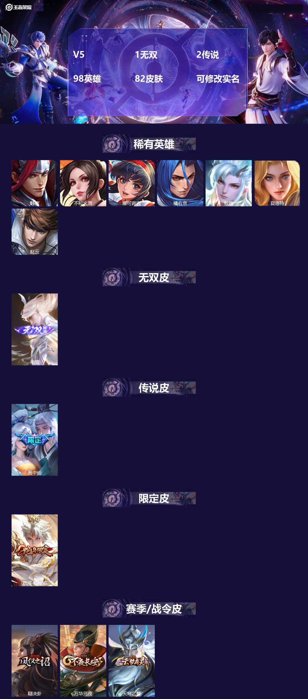 [14935283]v5 1无双 2传说 98英雄 82皮肤 可修改实名 【英雄全皮】:敖隐全皮 【稀有英雄】:敖隐小龙人韩信韩跳跳夏洛特夏师傅橘右京橘子娜可露露鸟人不知火舞赵云 【无双皮】:神罪 【传说皮】:画中仙 【赛季/战令皮】:天穹之誓s36疑决卦s