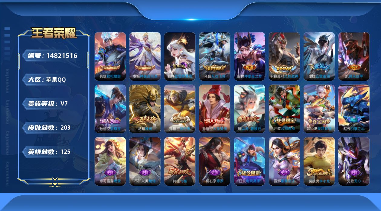 [14821516]v7-125英雄-203皮肤-2典藏-5传说-59史诗,cc8093 【英雄全皮】:戈娅全皮 【荣耀典藏】:韩信弑呛猎影,虞姬神鉴启示录 【传说皮肤】:马超无双飞将,铠绛天战甲,干将莫邪久胜战神,虞姬云霓雀翎,貂蝉仲夏夜之梦 【限定皮肤】:姜子牙天穹之誓,狄仁杰阴阳师,赵云皇家上将,赵云引擎之心,孙尚香蔷薇恋人,钟无艳超时空战士,扁鹊奇幻香踪,白起夜都怪侠,芈月幻夜卜梦,元歌云间偶戏,元歌无心,甄姬落雪兰心,狄仁杰魔术师,狄仁杰万华元夜,达摩沙漠行僧,项羽海滩派对,老夫子醍醐杖,程咬金演武夺筹,韩信飞衡,王昭君午后时光,兰陵王金庭之子,亚瑟潮玩骑士王,孙悟空至尊宝,孙悟空大圣娶亲,孙悟空孙行者,后羿圣弓游侠,李元芳云中旅人,钟馗驱傩正仪,杨戬潮玩骑兵,干将莫邪胡桃夹子,干将莫邪真爱魔法,鬼谷子原初探秘者,鬼谷子五谷丰年,黄忠火炮绅士,苏烈千军破阵,沈梦溪大漠名商,明世隐吟游魔法,裴擒虎李小龙,裴擒虎擒涛扼浪,狂铁电玩高手,瑶山海碧波行,上官婉儿梁祝,嫦娥暖冬兔眠,西施玲珑珍味,鲁班大师探海日志,桑启海盐诗旅,暃星界游侠,戈娅驭风魔法,阿古朵江河有灵,张良古海寻踪,高渐离燃音魔法,妲己灵卜魔法,鬼谷子天穹祈灯,姬小满妄想食味,沈梦溪龙舞盛年,刘邦剑破天穹,周瑜熔金海岸 【年限皮肤】:韩信飞衡,马超神威,瑶山海碧波行 【赛季限定】:狄仁杰万华元夜,达摩沙漠行僧,老夫子醍醐杖,程咬金演武夺筹,兰陵王金庭之子,张良古海寻踪,李元芳云中旅人,钟馗驱傩正仪,鬼谷子原初探秘者,苏烈千军破阵,沈梦溪大漠名商,裴擒虎擒涛扼浪,鲁班大师探海日志,桑启海盐诗旅,鬼谷子天穹祈灯,刘邦剑破天穹,姜子牙天穹之誓 【战令限定】:钟无艳超时空战士,扁鹊奇幻香踪,白起夜都怪侠,芈月幻夜卜梦,元歌云间偶戏,甄姬落雪兰心,王昭君午后时光,亚瑟潮玩骑士王,后羿圣弓游侠,杨戬潮玩骑兵,干将莫邪真爱魔法,黄忠火炮绅士,明世隐吟游魔法,狂铁电玩高手,嫦娥暖冬兔眠,西施玲珑珍味,暃星界游侠,戈娅驭风魔法,高渐离燃音魔法,妲己灵卜魔法 【史诗皮肤】:露娜紫霞仙子,赵云皇家上将,赵云未来纪元,貂蝉圣诞恋歌,狄仁杰魔术师,廉颇地狱岩魂,宫本武藏鬼剑武藏,孙尚香蔷薇恋人,孙尚香水果甜心,嬴政摇滚巨星,妲己魅力维加斯,妲己女仆咖啡,墨子金属风暴,吕布圣诞狂欢,曹操幽灵船长,李白千年之狐,孙悟空至尊宝,赵云引擎之心,花木兰