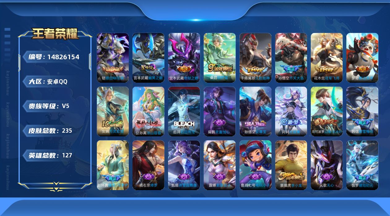 [14826154]v6-127英雄-235皮肤-1典藏皮肤-7传说-70史诗-sy1018 【荣耀典藏】:铠银白咏叹调 【传说皮肤】:后羿神树通天,桑启鸣野蒿,孙悟空齐天大圣,干将莫邪久胜战神,花木兰冠军飞将,梦奇胖达荣荣,宫本武藏地狱之眼 【限定皮肤】:蒙犽顽岩魄,姜子牙天穹之誓,狄仁杰阴阳师,赵云皇家上将,孙尚香蔷薇恋人,庄周高山流水,高渐离死亡摇滚,高渐离玩趣恶龙,芈月重明,芈月幻夜卜梦,元歌无心,夏侯惇朔风刀,甄姬游园惊梦,曹操烛龙,典韦穷奇,马可波罗山海玄木吟,狄仁杰魔术师,狄仁杰万华元夜,达摩沙漠行僧,项羽海滩派对,老夫子醍醐杖,老夫子航海奇遇记,程咬金演武夺筹,韩信傲雪梅呛,兰陵王金庭之子,孙悟空至尊宝,孙悟空齐天大圣,牛魔御旌,后羿圣弓游侠,李元芳云中旅人,钟馗驱傩正仪,杨玉环遇见飞天,干将莫邪真爱魔法,雅典娜黎明之约,太乙真人华丽摇滚,鬼谷子原初探秘者,鬼谷子五谷丰年,黄忠火炮绅士,苏烈千军破阵,百里玄策原初追逐者,弈星混沌棋,沈梦溪大漠名商,明世隐疑决卦,裴擒虎李小龙,裴擒虎擒涛扼浪,狂铁御狮,米莱狄御霄,云中君纤云弄巧,盾山御銮,上官婉儿梁祝,嫦娥拒霜思,鲁班大师探海日志,桑启海盐诗旅,阿古朵江河有灵,张良古海寻踪,蒙犽百解令,蒙恬荣光圣徽,高渐离燃音魔法,妲己灵卜魔法,鬼谷子天穹祈灯,伽罗琥珀纪元,百里玄策超元猎域,沈梦溪龙舞盛年,刘邦剑破天穹,周瑜熔金海岸 【年限皮肤】:马可波罗山海玄木吟 【赛季限定】:芈月重明,夏侯惇朔风刀,曹操烛龙,典韦穷奇,狄仁杰万华元夜,达摩沙漠行僧,老夫子醍醐杖,程咬金演武夺筹,兰陵王金庭之子,张良古海寻踪,牛魔御旌,李元芳云中旅人,钟馗驱傩正仪,雅典娜黎明之约,鬼谷子原初探秘者,苏烈千军破阵,百里玄策原初追逐者,弈星混沌棋,沈梦溪大漠名商,明世隐疑决卦,裴擒虎擒涛扼浪,狂铁御狮,米莱狄御霄,盾山御銮,鲁班大师探海日志,桑启海盐诗旅,鬼谷子天穹祈灯,蒙恬荣光圣徽,刘邦剑破天穹,姜子牙天穹之誓 【战令限定】:芈月幻夜卜梦,老夫子航海奇遇记,后羿圣弓游侠,干将莫邪真爱魔法,黄忠火炮绅士,高渐离燃音魔法,妲己灵卜魔法 【史诗皮肤】:鲁班七号电玩小子,露娜紫霞仙子,赵云皇家上将,貂蝉圣诞恋歌,甄姬冰雪圆舞曲,王昭君偶像歌手,狄仁杰魔术师,廉颇地狱岩魂,宫本武藏鬼剑武藏,孙尚香蔷薇恋人,孙尚香水果甜心,嬴政摇滚巨星,妲己魅力维加斯,妲己女