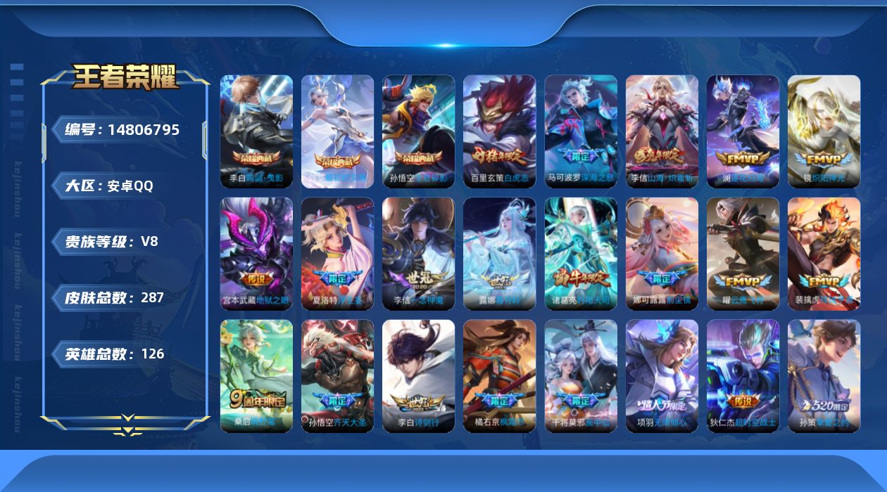 [14806795]v8-126英雄-287皮肤-3典藏皮肤-26传说-86史诗 cc8413 【英雄全皮】:橘右京全皮,李信全皮,蒙恬全皮,夏洛特全皮 【荣耀典藏】:孙悟空全息碎影,李白鸣剑曳影,伽罗最初的交响 【传说皮肤】:后羿神树通天,裴擒虎祥瑞亨通,桑启鸣野蒿,澜逐花归海,露娜霜月吟,夏洛特浮生妄,干将莫邪画中仙,项羽无限倾心,孙悟空齐天大圣,李信山海炽霜斩,李白诗剑行,百里守约碎云,橘右京枫霜尽,娜可露露前尘镜,马可波罗深海之息,孙策挚爱之约,周瑜音你心动,诸葛亮时雨天司,铠绛天战甲,镜炽阳神光,虞姬启明星使,曜云鹰飞将,李信一念神魔,百里玄策白虎志,宫本武藏地狱之眼,狄仁杰超时空战士 【限定皮肤】:蔡文姬夏日便利店,虞姬夏日便利店,姜子牙天穹之誓,狄仁杰阴阳师,赵云皇家上将,庄周高山流水,高渐离玩趣恶龙,钟无艳超时空战士,扁鹊奇幻香踪,芈月幻夜卜梦,元歌无心,甄姬落雪兰心,马可波罗深海之息,狄仁杰魔术师,狄仁杰万华元夜,达摩沙漠行僧,项羽海滩派对,项羽无限倾心,老夫子醍醐杖,韩信飞衡,王昭君午后时光,娜可露露前尘镜,橘右京枫霜尽,孙悟空至尊宝,孙悟空孙行者,孙悟空齐天大圣,后羿圣弓游侠,李元芳云中旅人,虞姬启明星使,钟馗驱傩正仪,杨玉环遇见飞天,杨戬潮玩骑兵,干将莫邪真爱魔法,干将莫邪画中仙,雅典娜单词大作战,鬼谷子原初探秘者,鬼谷子五谷丰年,诸葛亮时雨天司,黄忠火炮绅士,苏烈千军破阵,百里玄策白虎志,百里玄策原初追逐者,弈星混沌棋,沈梦溪大漠名商,明世隐疑决卦,裴擒虎李小龙,裴擒虎擒涛扼浪,狂铁电玩高手,云中君纤云弄巧,李信山海炽霜斩,孙策挚爱之约,上官婉儿梁祝,嫦娥拒霜思,嫦娥暖冬兔眠,西施玲珑珍味,蒙犽狂想玩偶喵,鲁班大师探海日志,桑启海盐诗旅,夏洛特浮生妄,暃星界游侠,戈娅驭风魔法,艾琳流音漫舞,司空震地狱燃心,阿古朵江河有灵,张良古海寻踪,蒙犽百解令,蒙恬荣光圣徽,高渐离燃音魔法,妲己灵卜魔法,鬼谷子天穹祈灯,伽罗琥珀纪元,姬小满妄想食味,沈梦溪龙舞盛年,鲁班七号蔬乡物语,李元芳蔬乡物语,刘邦剑破天穹,程咬金群星魔术团,镜青焰无极,项羽苍威无极,刘备异域游侠,周瑜熔金海岸 【年限皮肤】:百里玄策白虎志,诸葛亮时雨天司,韩信飞衡,李信山海炽霜斩 【赛季限定】:狄仁杰万华元夜,达摩沙漠行僧,老夫子醍醐杖,张良古海寻踪,李元芳云中旅人,钟馗驱傩正仪,鬼谷子原初探秘者,