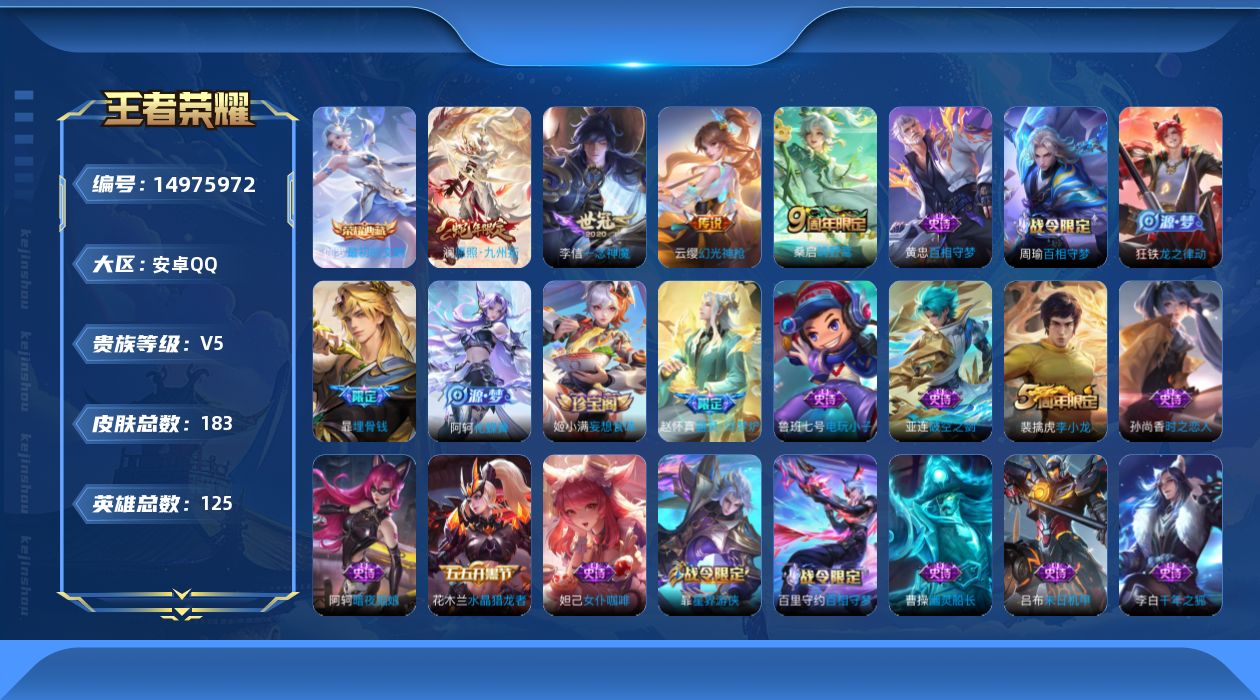 [14975972]-v5-183皮肤-1典藏-4传说-49史诗 sr4052 【荣耀典藏】:伽罗最初的交响 【内测皮肤】:艾琳女武神,狂铁特工战影 【传说皮肤】:李信一念神魔,桑启鸣野蒿,云缨幻光神呛,澜愿照九州拓 【限定皮肤】:暃埋骨钱,蒙犽顽岩魄,姜子牙天穹之誓,杨戬破阵退雄兵,狄仁杰阴阳师,赵云皇家上将,狄仁杰万华元夜,达摩沙漠行僧,项羽海滩派对,老夫子醍醐杖,程咬金演武夺筹,后羿圣弓游侠,李元芳银河之约,钟馗驱傩正仪,鬼谷子原初探秘者,百里玄策原初追逐者,沈梦溪大漠名商,裴擒虎李小龙,裴擒虎擒涛扼浪,云中君纤云弄巧,鲁班大师探海日志,桑启海盐诗旅,暃星界游侠,艾琳女武神,阿古朵江河有灵,张良古海寻踪,高渐离燃音魔法,妲己灵卜魔法,鬼谷子天穹祈灯,姬小满妄想食味,沈梦溪龙舞盛年,鲁班七号蔬乡物语,李元芳蔬乡物语,刘邦剑破天穹,程咬金群星魔术团,镜青焰无极,项羽苍威无极,周瑜熔金海岸 【赛季限定】:狄仁杰万华元夜,达摩沙漠行僧,老夫子醍醐杖,程咬金演武夺筹,张良古海寻踪,钟馗驱傩正仪,鬼谷子原初探秘者,百里玄策原初追逐者,沈梦溪大漠名商,裴擒虎擒涛扼浪,鲁班大师探海日志,桑启海盐诗旅,鬼谷子天穹祈灯,刘邦剑破天穹,姜子牙天穹之誓 【战令限定】:后羿圣弓游侠,李元芳银河之约,暃星界游侠,高渐离燃音魔法,妲己灵卜魔法,鲁班七号蔬乡物语,李元芳蔬乡物语,镜青焰无极,项羽苍威无极 【史诗皮肤】:鲁班七号电玩小子,项羽苍穹之光,阿轲暗夜猫娘,赵云皇家上将,貂蝉圣诞恋歌,宫本武藏鬼剑武藏,孙尚香水果甜心,嬴政摇滚巨星,妲己魅力维加斯,妲己女仆咖啡,曹操幽灵船长,李白千年之狐,吕布末日机甲,张飞乱世虎臣,花木兰水晶猎龙者,刘邦德古拉伯爵,小乔缤纷独角兽,兰陵王暗隐猎兽者,亚瑟心灵战警,雅典娜冰冠公主,安琪拉心灵骇客,百里守约特工魅影,刘禅天才门将,白起星夜王子,阿轲节奏热浪,孙策猫狗日记,伽罗箭羽风息,狄仁杰鹰眼统帅,李元芳银河之约,孙尚香时之恋人,百里玄策原初追逐者,裴擒虎李小龙,云中君纤云弄巧,暃星界游侠,阿古朵江河有灵,妲己灵卜魔法,高渐离燃音魔法,姬小满妄想食味,鲁班七号蔬乡物语,镜青焰无极,蒙犽顽岩魄,暃埋骨钱,亚连破空之剑,百里守约百相守梦,牛魔星界战将,赵怀真器灵浮梦炉,阿轲化蝶舞,狂铁龙之律动,周瑜百相守梦,黄忠百相守梦 【其他皮肤】:项羽海滩派对,韩信教廷特使,韩信街头霸
