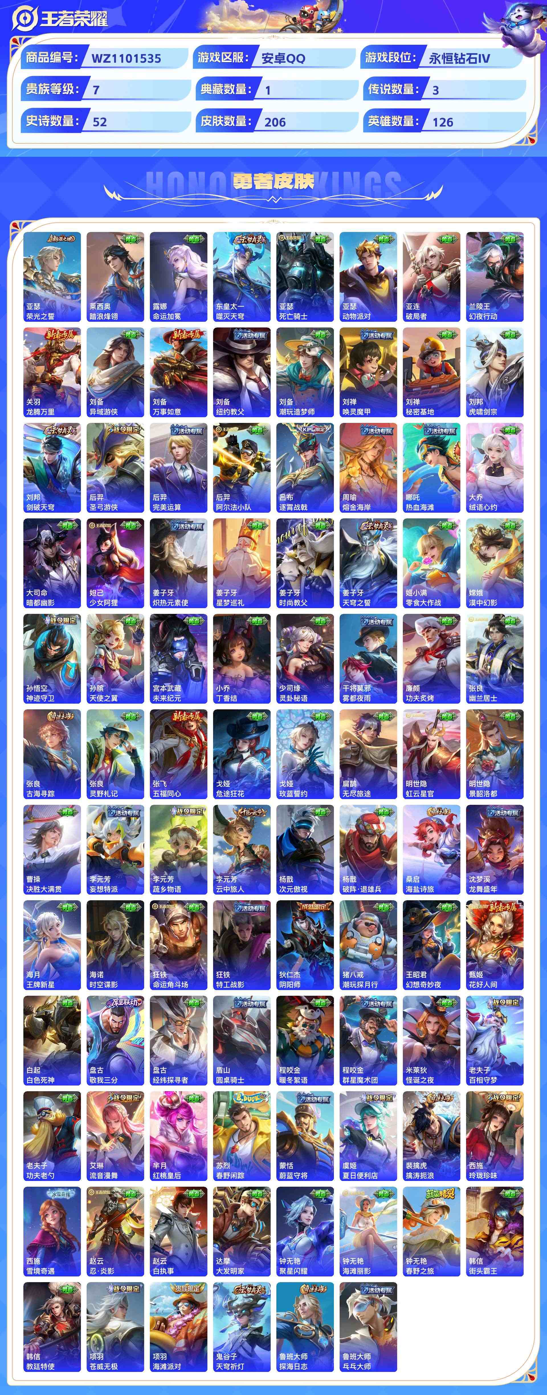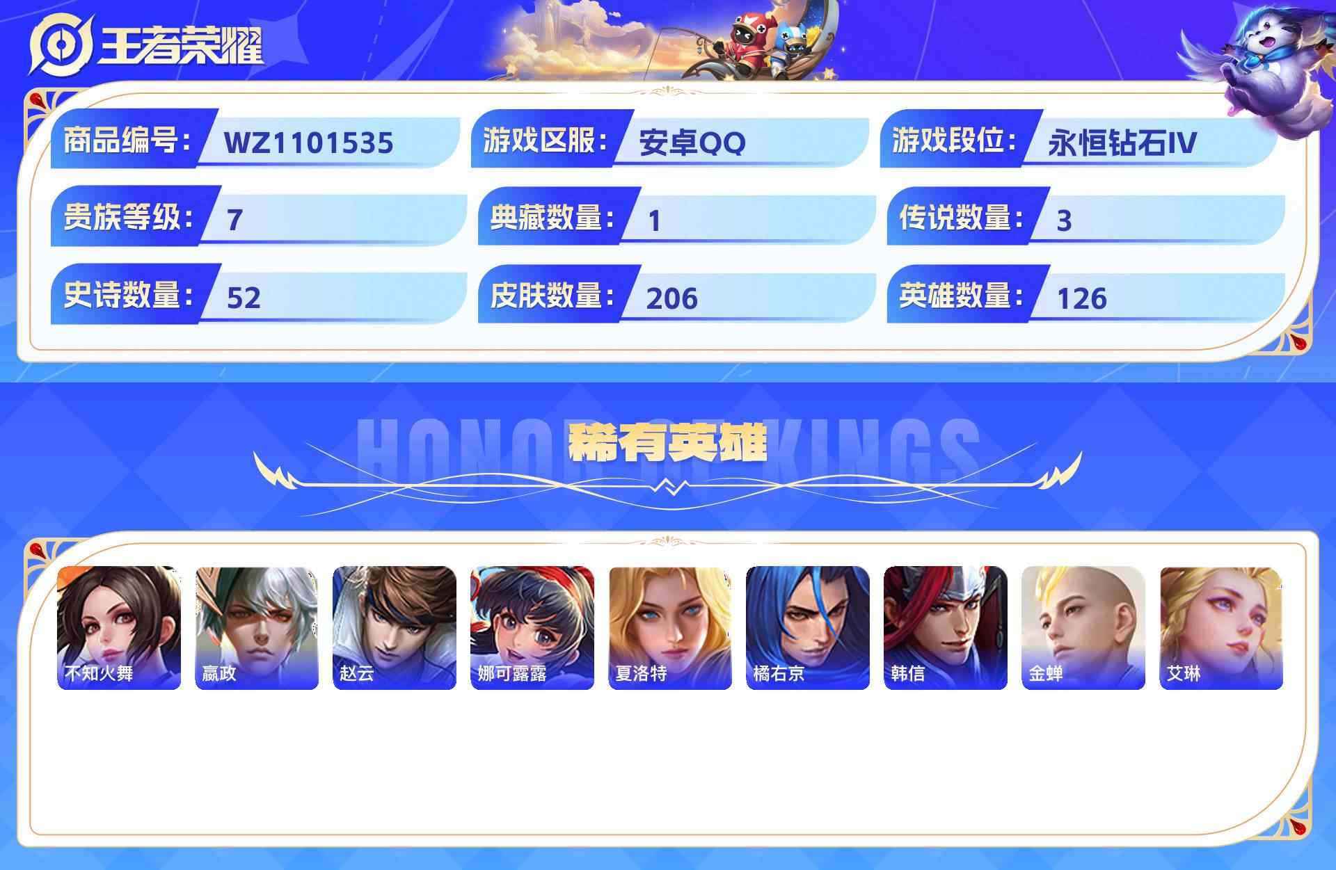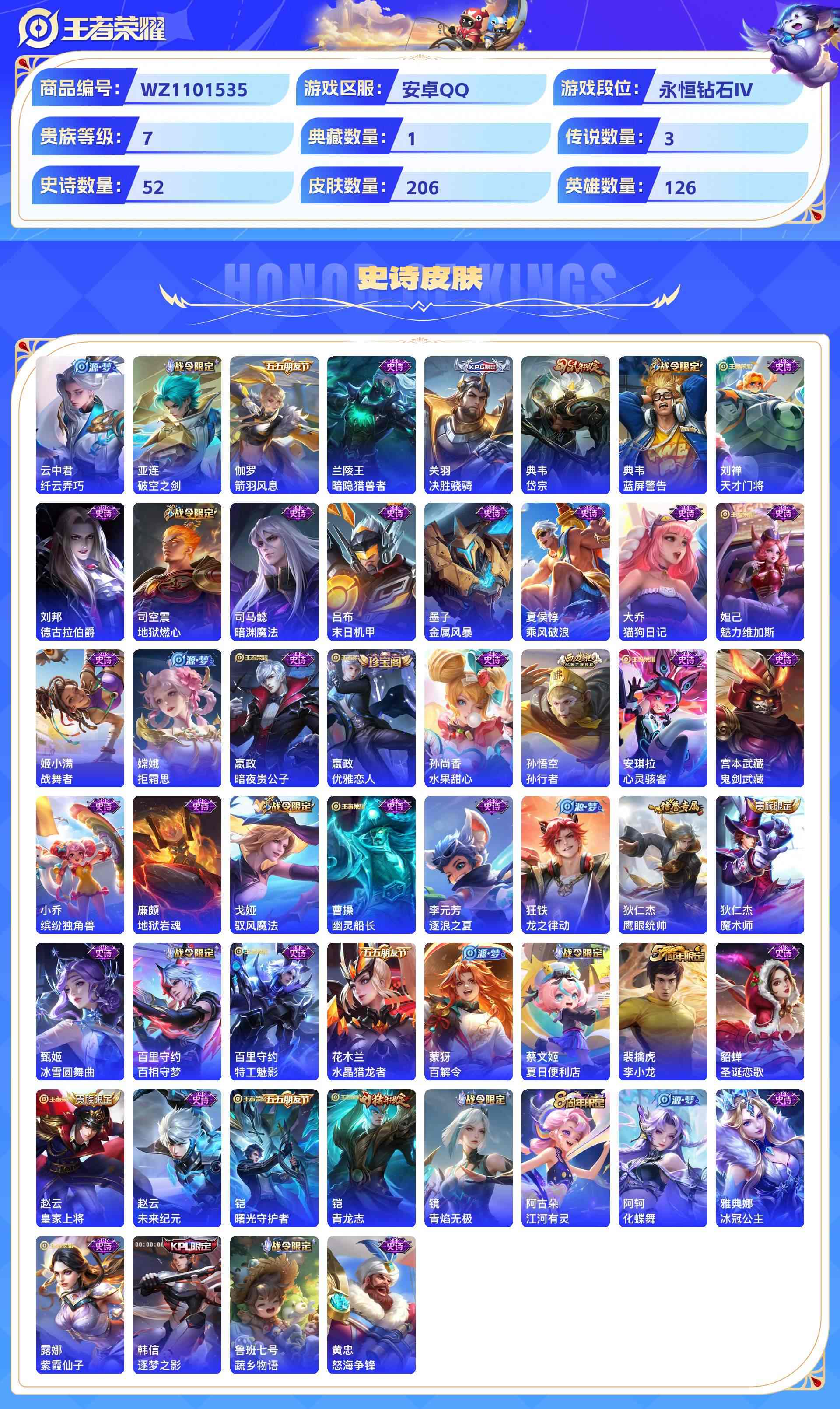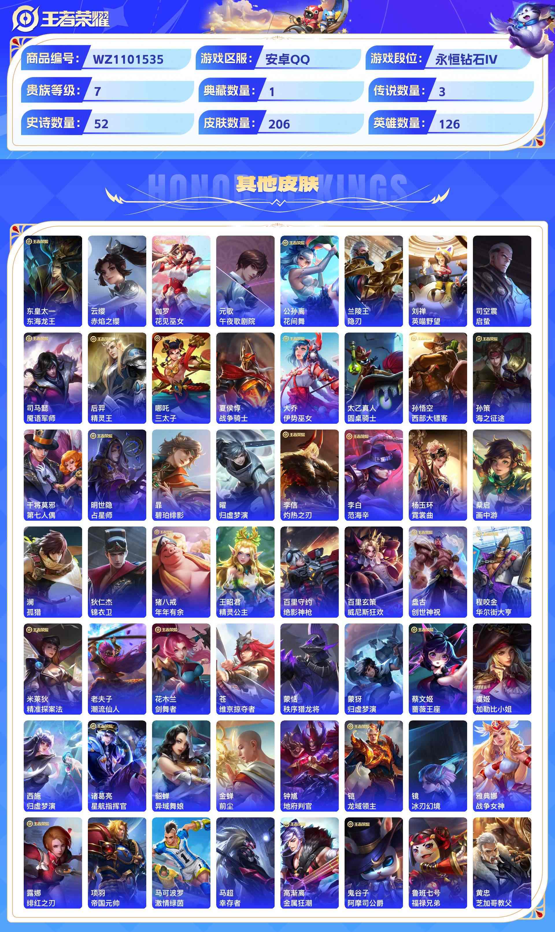 wz1101535|精品号安卓qq 贵族7级 206皮 1典藏(弑呛猎影) 3传说(时之恋人鸣野蒿绛天战甲) 52史诗(纤云弄巧破空之剑箭羽风息暗隐猎兽者决胜骁骑岱宗蓝屏警告天才门将)3个性按键