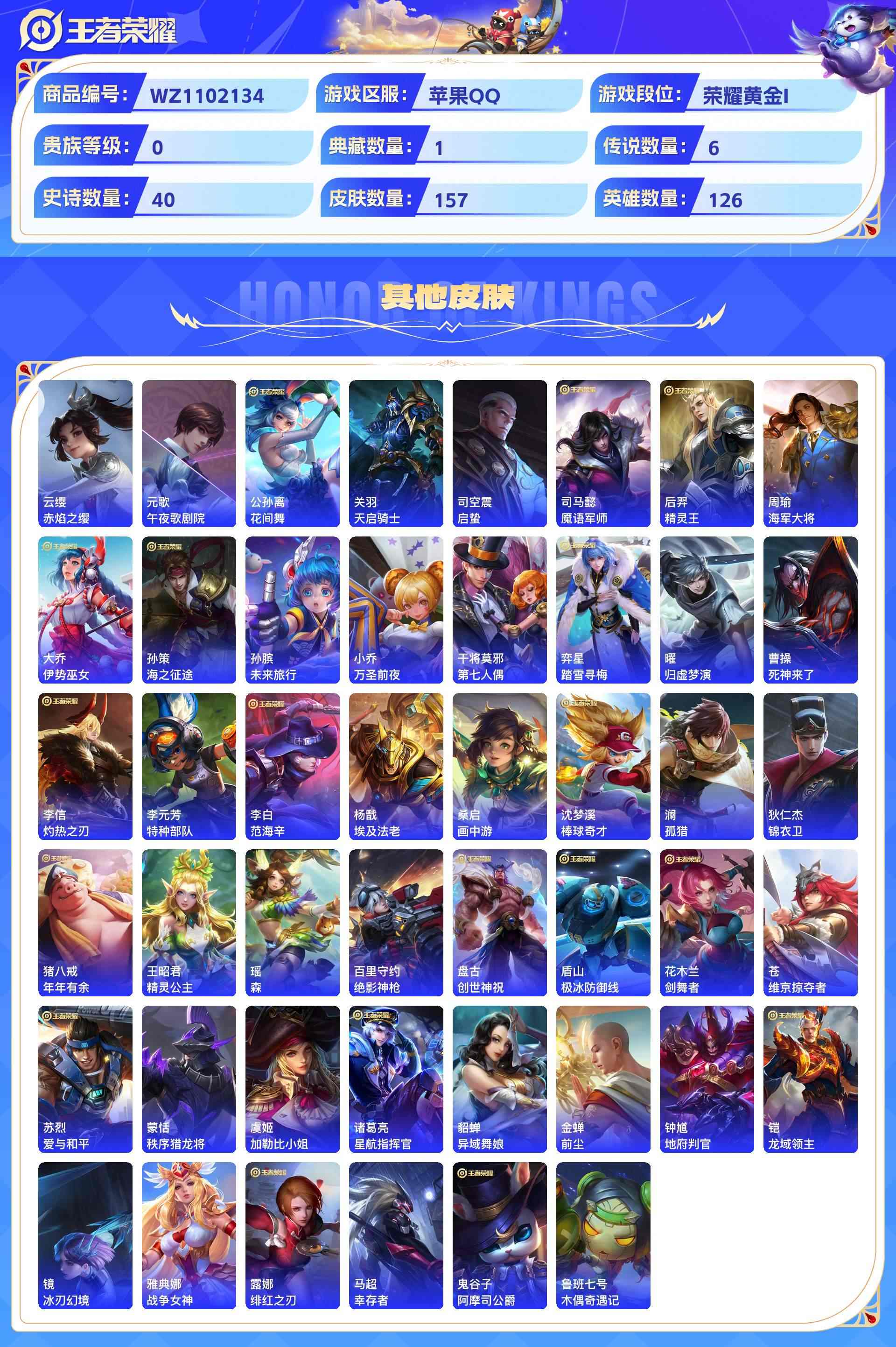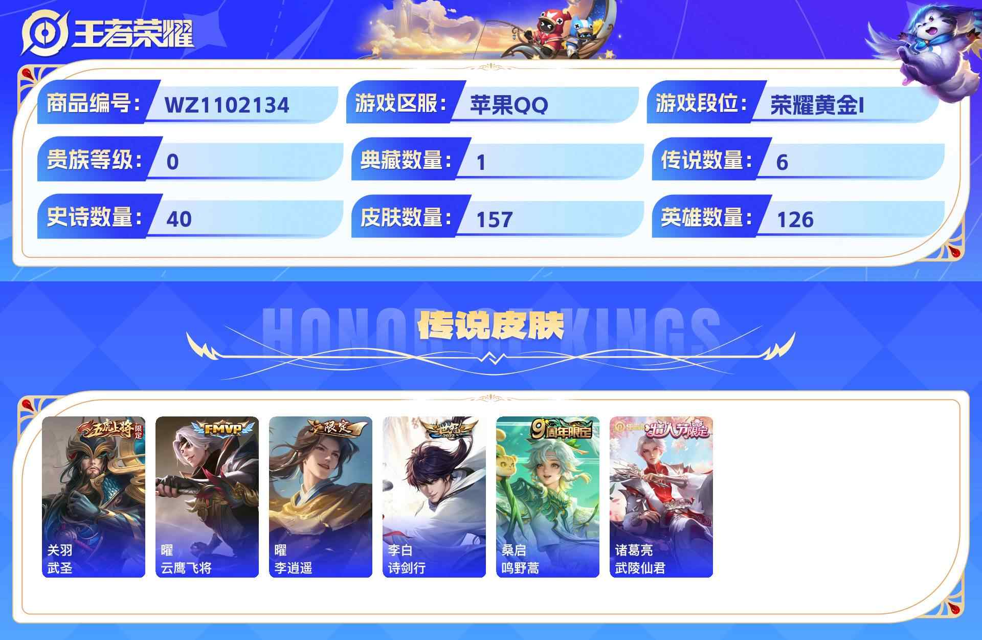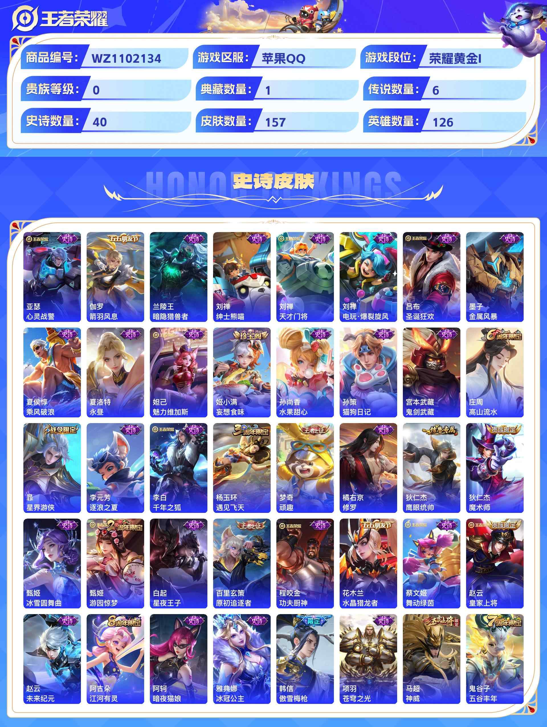 wz1102134|精品号可二次苹果qq 贵族7级 157皮 1典藏(鸣剑·曳影) 6传说(武圣云鹰飞将李 诗剑行鸣野蒿武陵仙君) 40史诗2个性按键