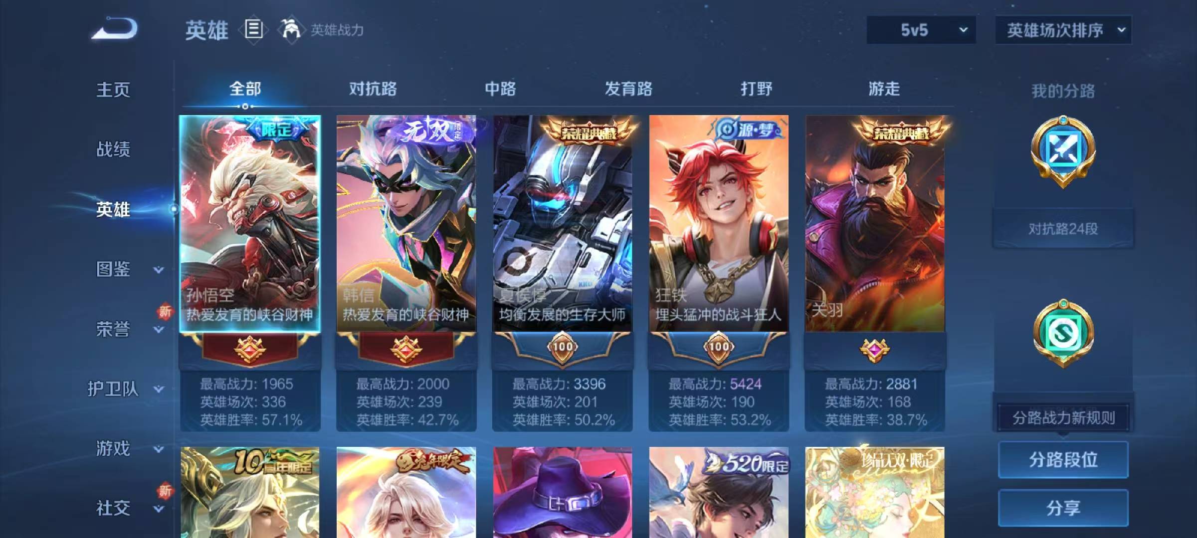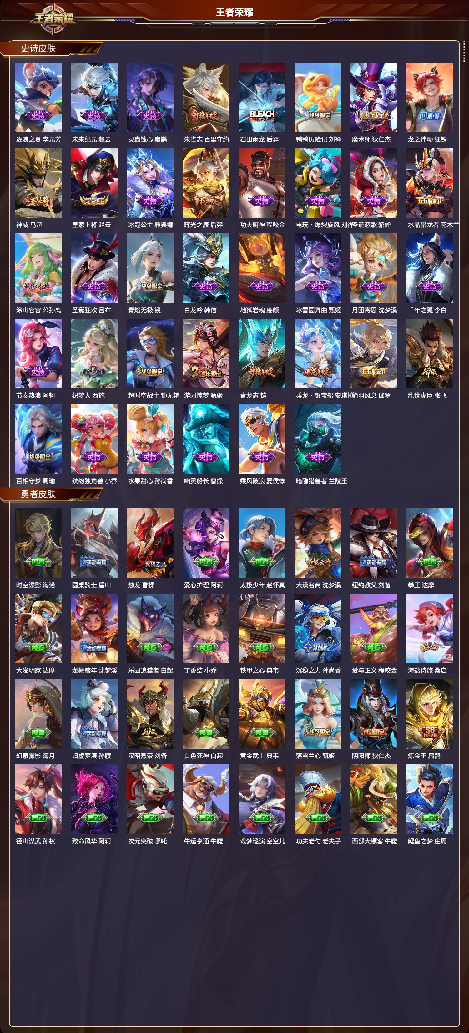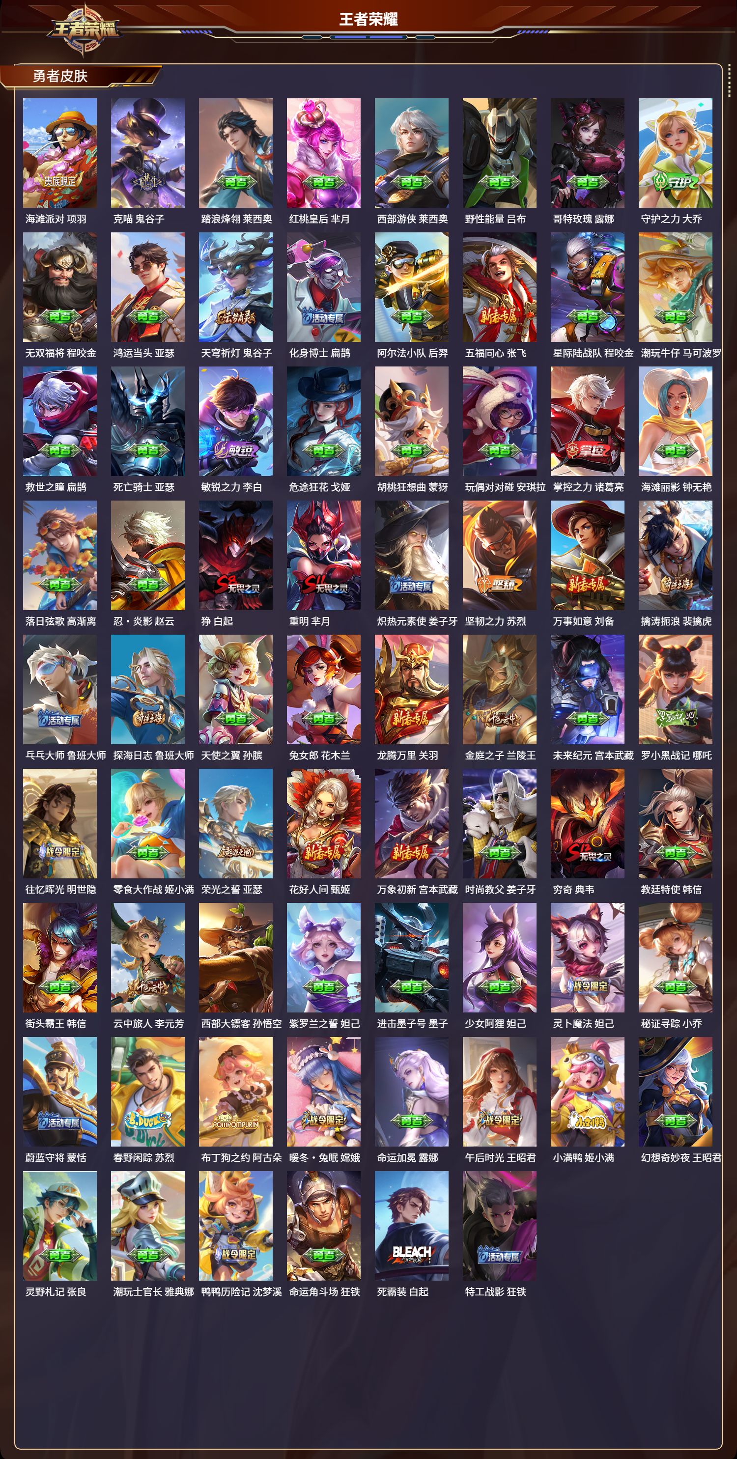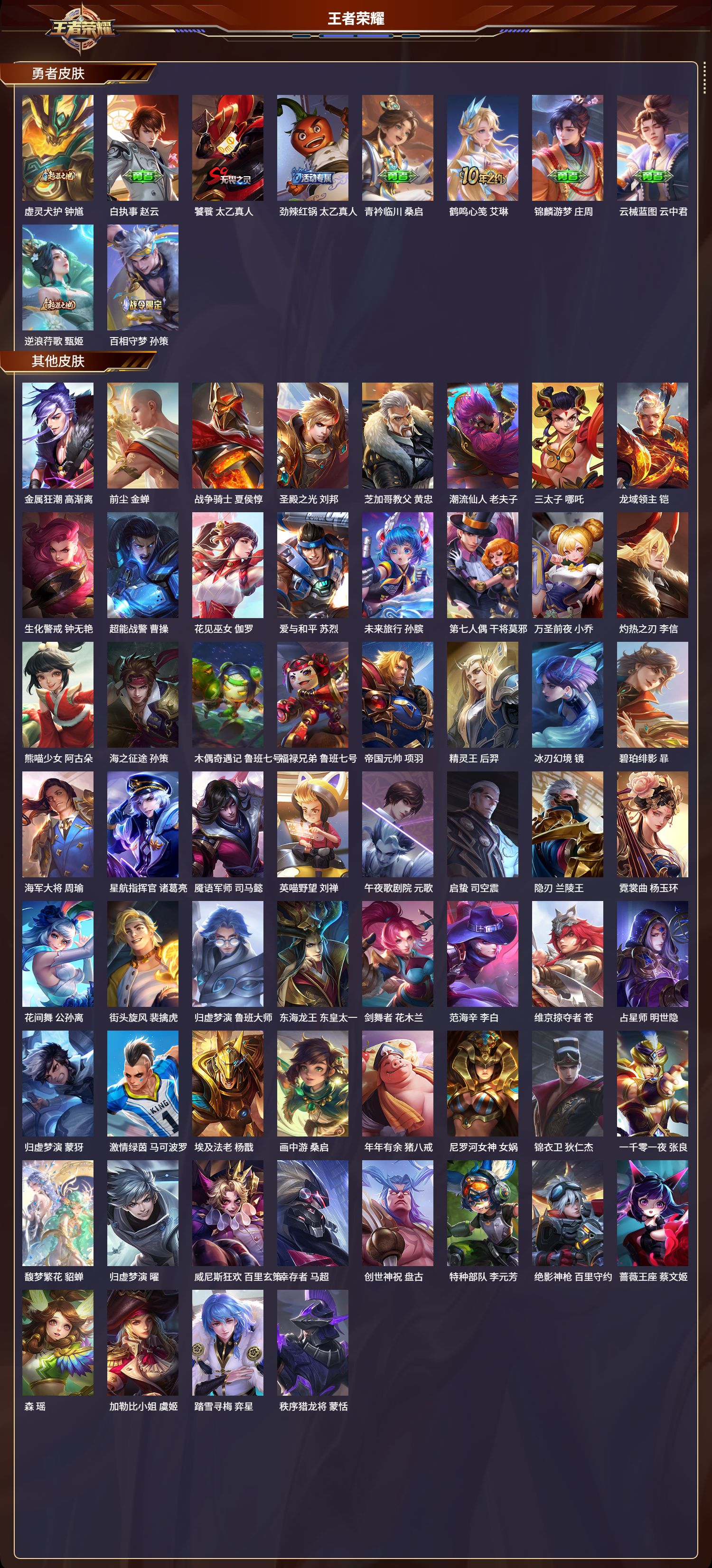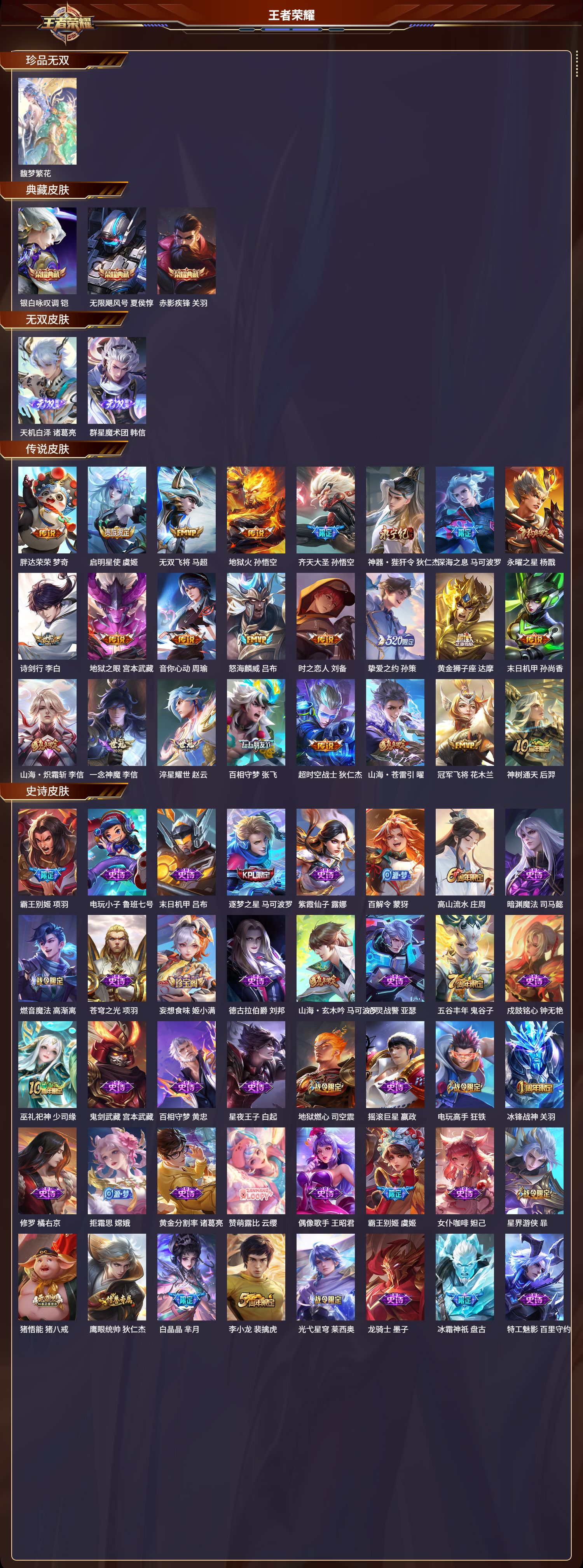 安卓qq/荣耀王者/289皮肤/127英雄/3典藏/1珍品无双/2无双/0珍品传说/24传说/78史诗/9稀有英雄【1 珍品无双】馥梦繁花【3 典藏皮肤】银白咏叹调 铠无限飓风号 夏侯惇赤影疾锋 关羽【2 无双皮肤】天机白泽 诸葛亮群星魔术团 韩信【24 传说皮肤】胖达荣荣 梦奇启明星使 虞姬无双飞将 马超地狱火 孙悟空齐天大圣 孙悟空神器·狴犴令 狄仁杰