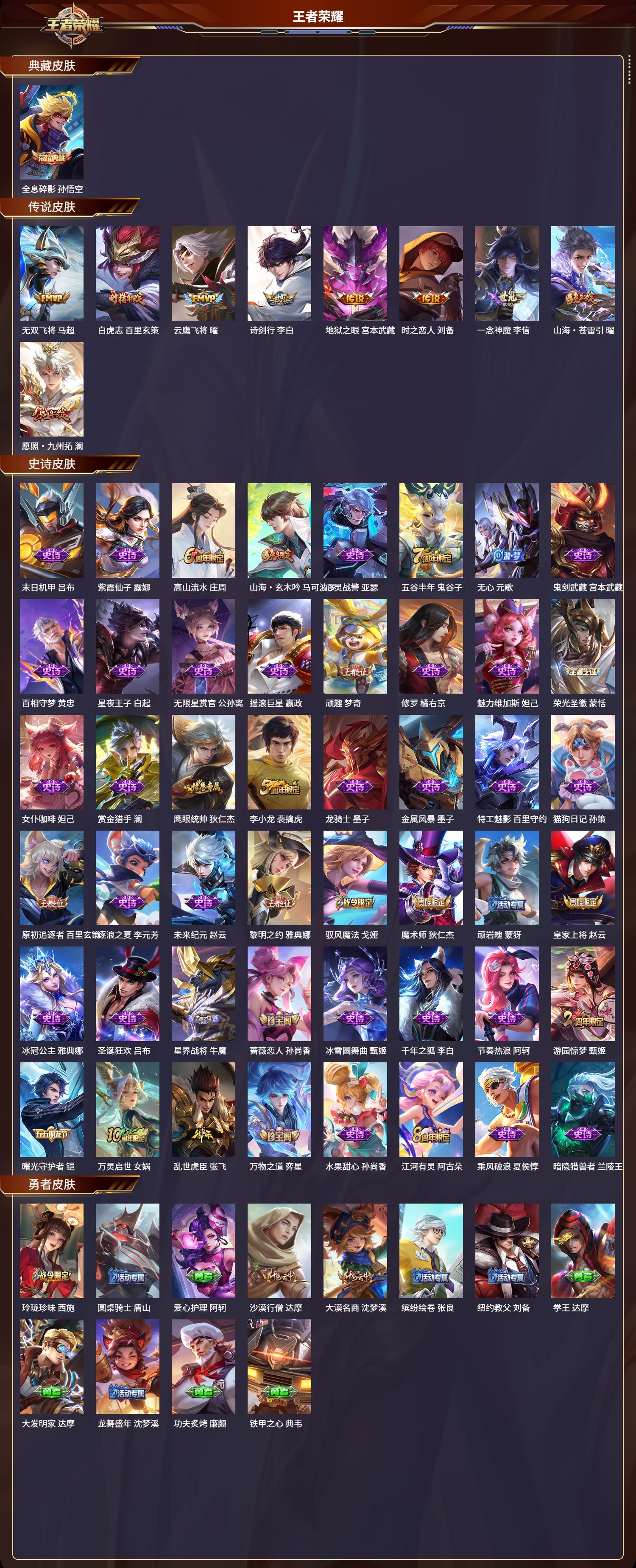 苹果qq/至尊星耀/239皮肤/125英雄/1典藏/0珍品无双/0无双/0珍品传说/9传说/48史诗/7稀有英雄【1 典藏皮肤】全息碎影 孙悟空【9 传说皮肤】无双飞将 马超白虎志 百里玄策云鹰飞将 曜诗剑行 李白地狱之眼 宫本武藏时之恋人 刘备一念神魔 李信山海·苍雷引 曜愿照·九州拓 澜【48 史诗皮肤】末日机甲 吕布紫霞仙子 露娜高山流水 庄周山
