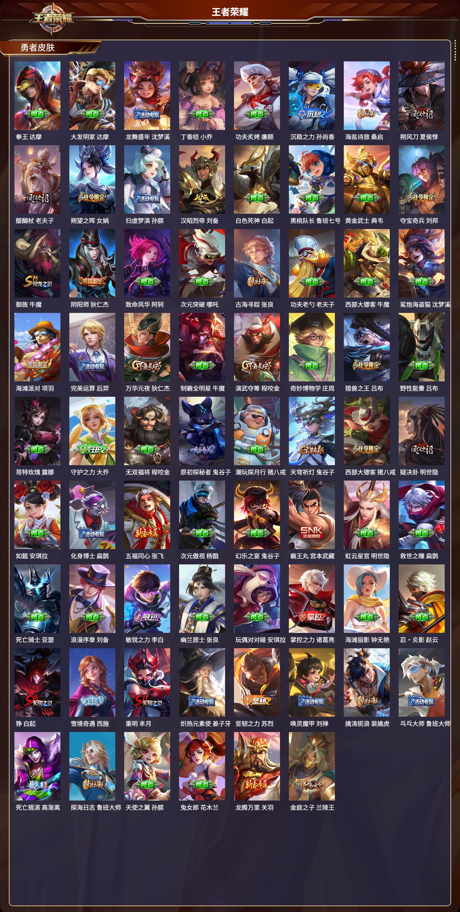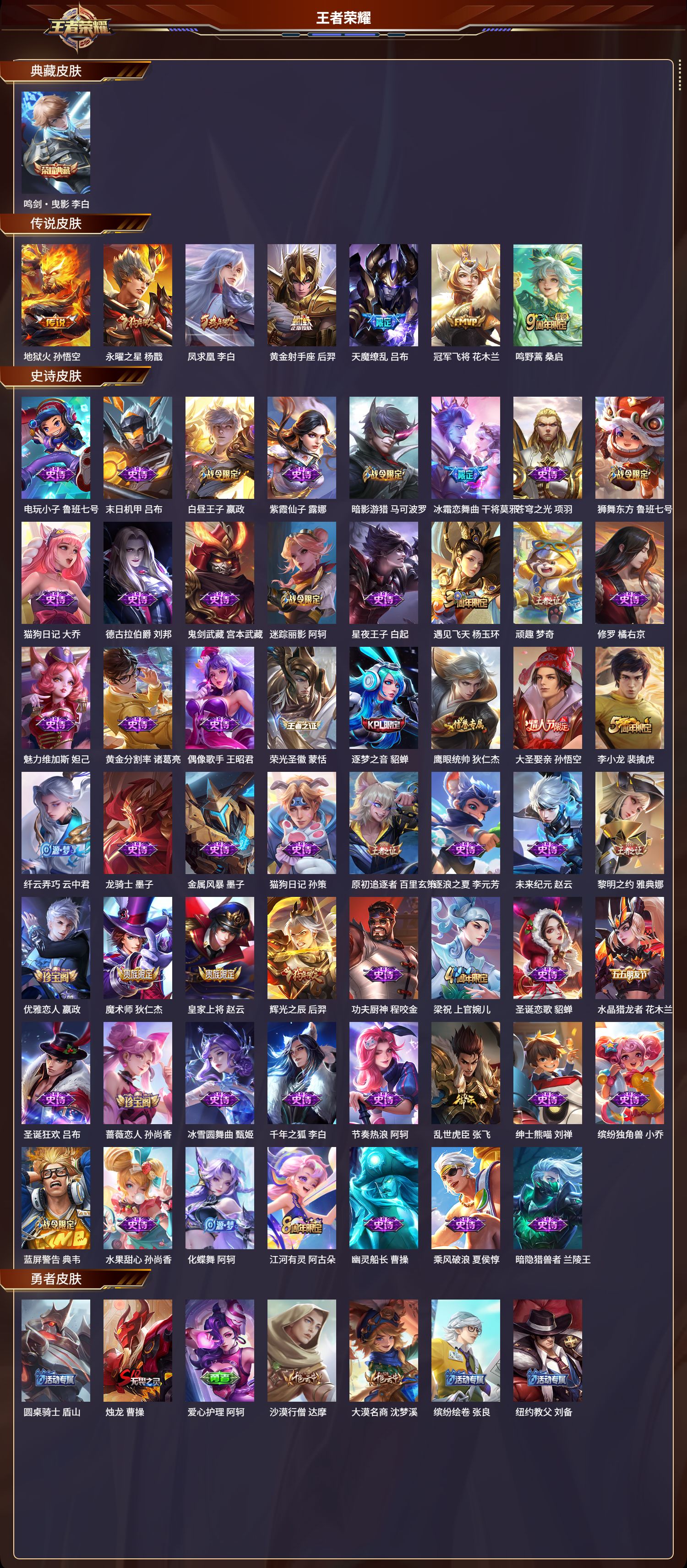 苹果qq/最强王者/212皮肤/126英雄/1典藏/0珍品无双/0无双/0珍品传说/7传说/55史诗/8稀有英雄【1 典藏皮肤】鸣剑·曳影 李白【7 传说皮肤】地狱火 孙悟空永曜之星 杨戬凤求凰 李白黄金射手座 后羿天魔缭乱 吕布冠军飞将 花木兰鸣野蒿 桑启【55 史诗皮肤】电玩小子 鲁班七号末日机甲 吕布白昼王子 嬴政紫霞仙子 露娜暗影游猎 马可波罗