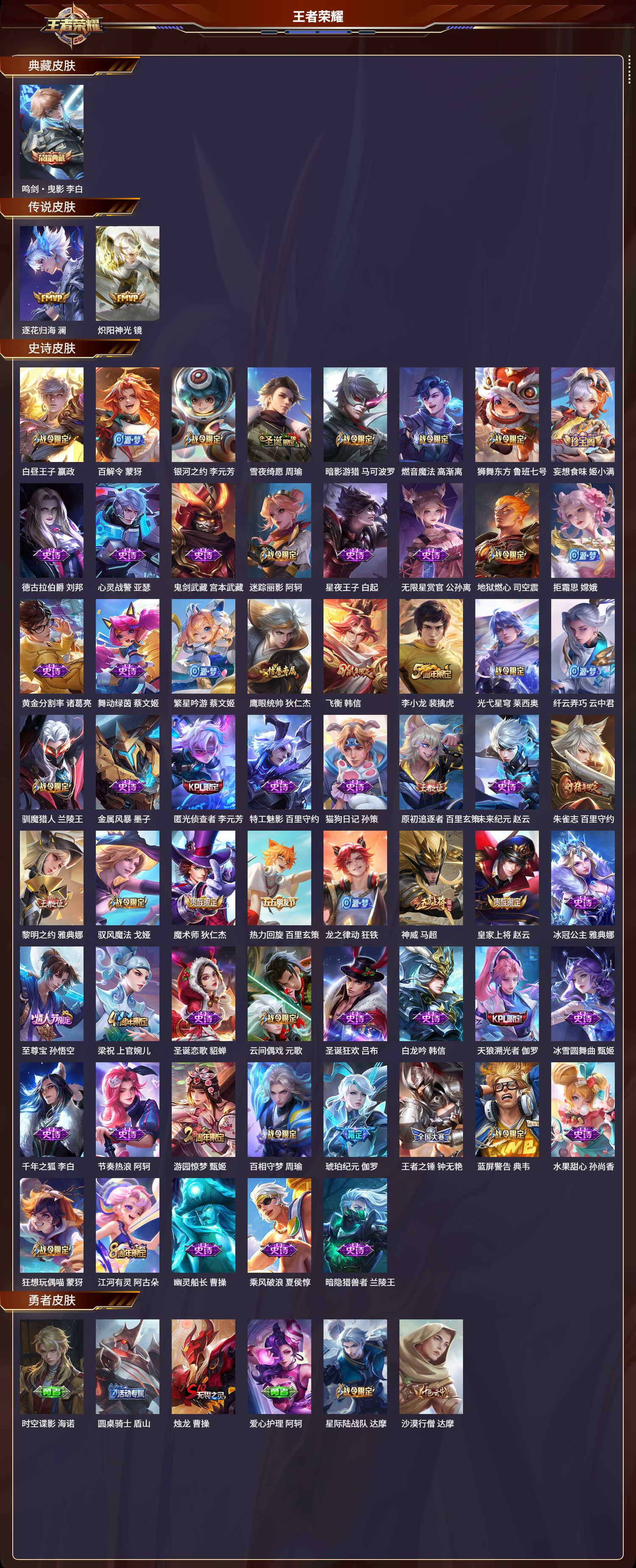 安卓qq/永恒钻石/201皮肤/125英雄/1典藏/0珍品无双/0无双/0珍品传说/2传说/61史诗/8稀有英雄【1 典藏皮肤】鸣剑·曳影 李白【2 传说皮肤】逐花归海 澜炽阳神光 镜【61 史诗皮肤】白昼王子 嬴政百解令 蒙犽银河之约 李元芳雪夜绮愿 周瑜暗影游猎 马可波罗燃音魔法 高渐离狮舞东方 鲁班七号妄想食味 姬小满德古拉伯爵 刘邦心灵战警 亚瑟