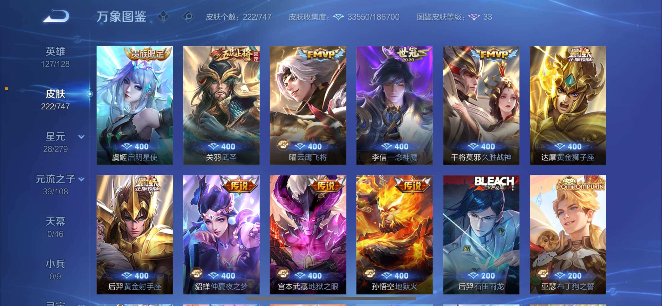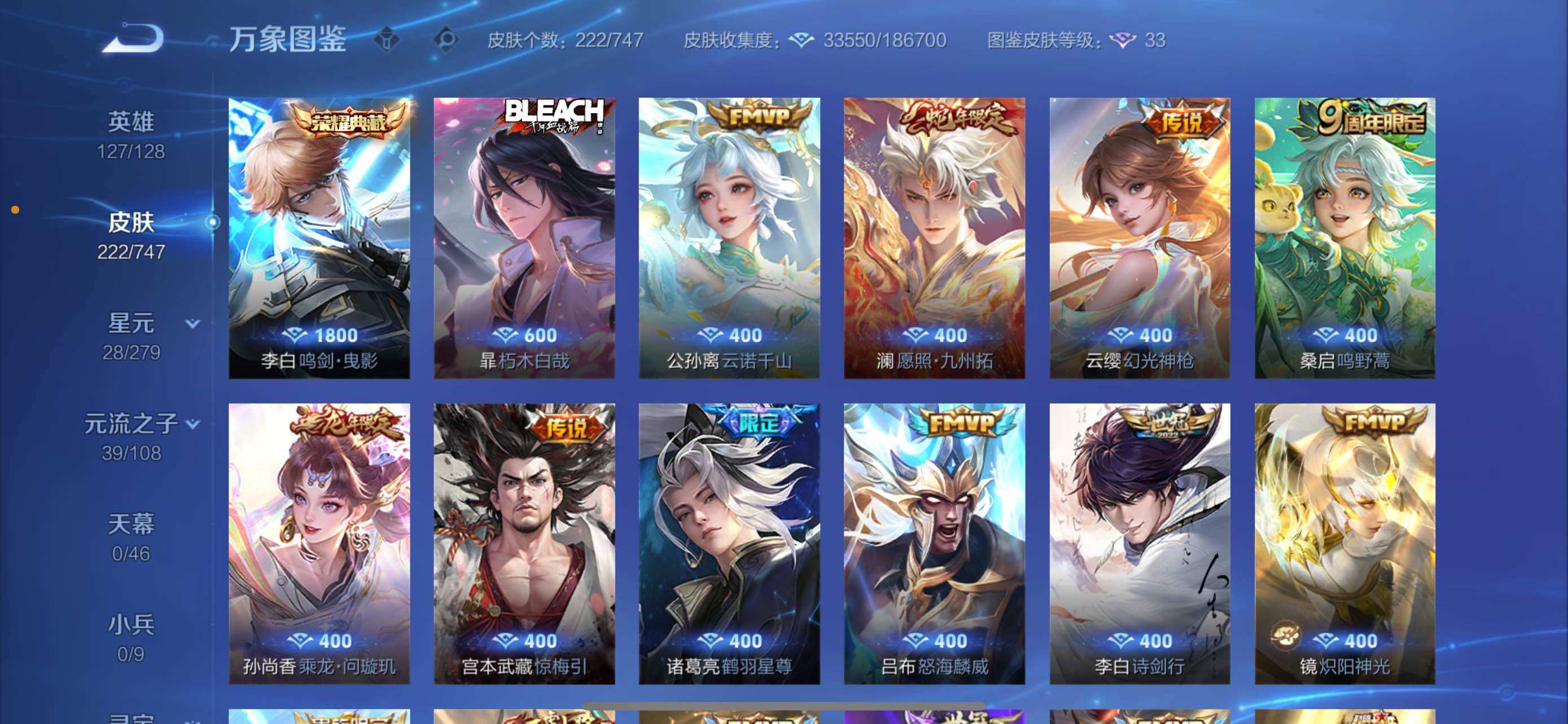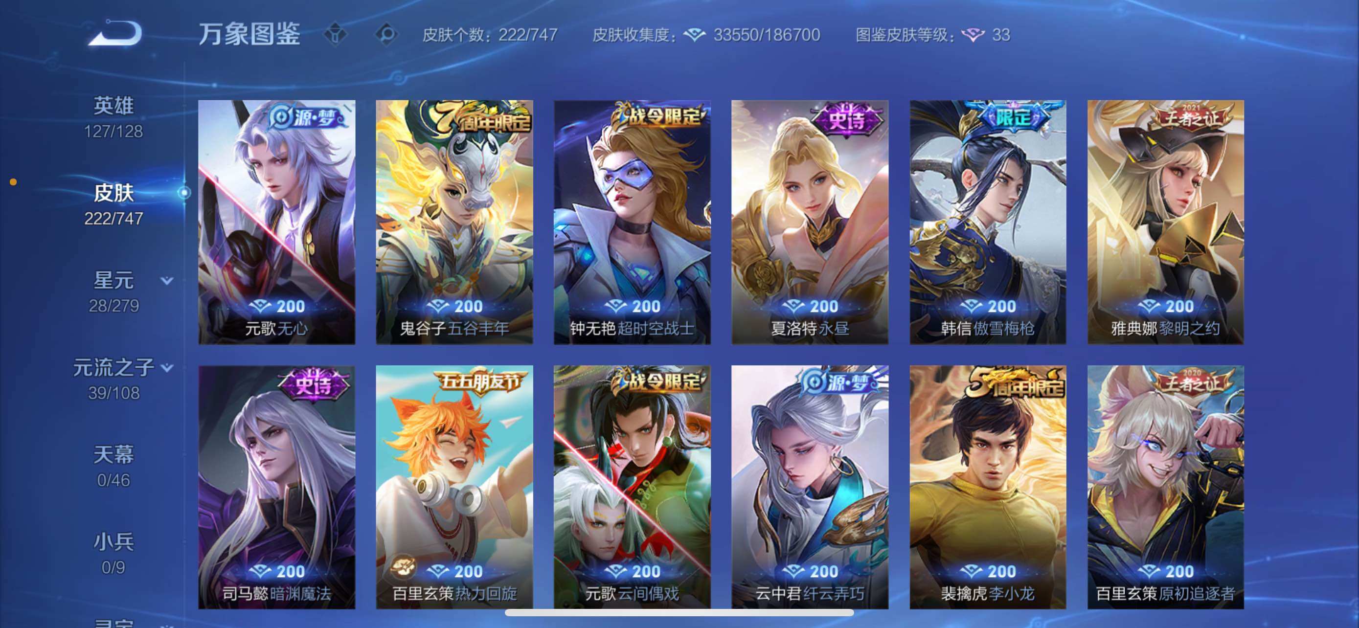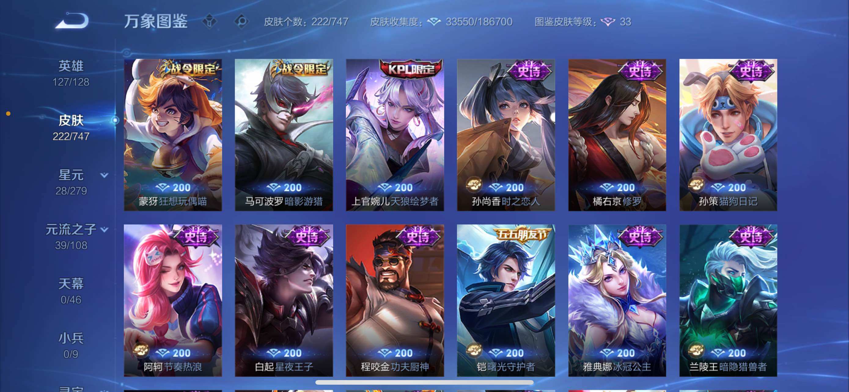 【精氪质量v8·万战金标暃·金标赵怀真·鸣剑曳影·朽木白哉·武圣·乘龙问璇玑·云诺千山·愿照九州拓·鹤羽星尊·怒海麟威·诗剑行·可二次】w9449-苹果q-127英雄-222皮肤-16王者印记-200铭文-贵族积分5w【贵族8】【1典藏·1珍品传说·2星传说·20传说·16按键】【因赛季更新游戏段付以上号为准!】 【英雄全皮】:蒙恬全皮,影全皮 【荣耀典藏】:李白鸣剑曳影 【星元皮肤】:宫