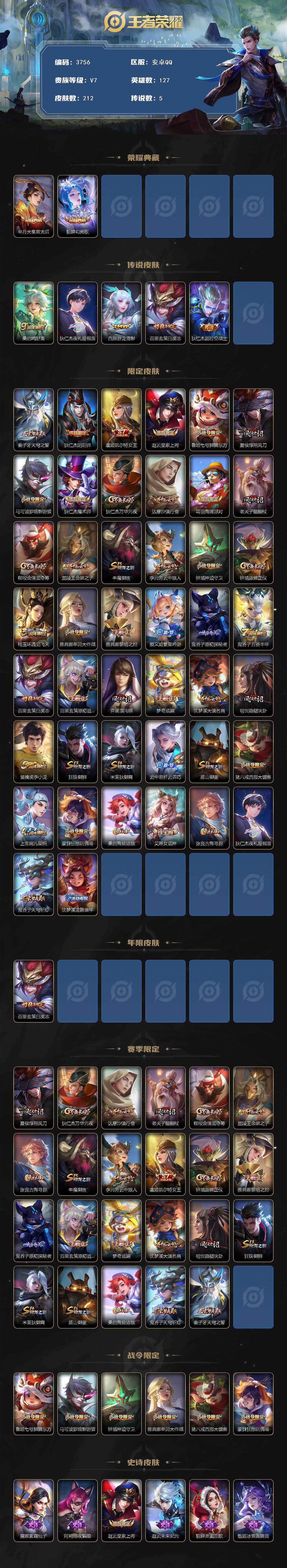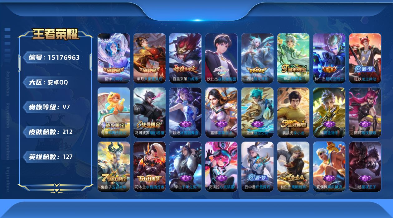 [15176963]安卓q-v7-最强王者段位-127英雄-212皮肤-2典藏皮肤-5传说-49史诗 【英雄全皮】:钟馗全皮 【荣耀典藏】:芈月大秦宣太后,貂蝉幻阙歌 【传说皮肤】:桑启鸣野蒿,狄仁杰夜礼服假面,西施游龙清影,百里玄策白虎志,狄仁杰超时空战士 【限定皮肤】:姜子牙天穹之誓,狄仁杰阴阳师,虞姬凯尔特女王,赵云皇家上将,鲁班七号狮舞东方,夏侯惇朔风刀,马可波罗暗影游猎,狄仁杰魔术师,狄仁杰万华元夜,达摩沙漠行僧,项羽海滩派对,老夫子醍醐杖,程咬金演武夺筹,兰陵王金庭之子,牛魔御旌,李元芳云中旅人,钟馗神迹守卫,钟馗驱傩正仪,杨玉环遇见飞天,雅典娜单词大作战,雅典娜黎明之约,蔡文姬繁星吟游,鬼谷子原初探秘者,鬼谷子五谷丰年,百里玄策白虎志,百里玄策原初追逐者,弈星混沌棋,梦奇顽趣,沈梦溪大漠名商,明世隐疑决卦,裴擒虎李小龙,狂铁御狮,米莱狄御霄,云中君纤云弄巧,盾山御銮,猪八戒西部大镖客,上官婉儿梁祝,蒙犽狂想玩偶喵,桑启海盐诗旅,艾琳女武神,张良古海寻踪,狄仁杰夜礼服假面,鬼谷子天穹祈灯,沈梦溪龙舞盛年 【年限皮肤】:百里玄策白虎志 【赛季限定】:夏侯惇朔风刀,狄仁杰万华元夜,达摩沙漠行僧,老夫子醍醐杖,程咬金演武夺筹,兰陵王金庭之子,张良古海寻踪,牛魔御旌,李元芳云中旅人,虞姬凯尔特女王,钟馗驱傩正仪,雅典娜黎明之约,鬼谷子原初探秘者,百里玄策原初追逐者,弈星混沌棋,梦奇顽趣,沈梦溪大漠名商,明世隐疑决卦,狂铁御狮,米莱狄御霄,盾山御銮,桑启海盐诗旅,鬼谷子天穹祈灯,姜子牙天穹之誓 【战令限定】:鲁班七号狮舞东方,马可波罗暗影游猎,钟馗神迹守卫,雅典娜单词大作战,猪八戒西部大镖客,蒙犽狂想玩偶喵 【史诗皮肤】:露娜紫霞仙子,阿轲暗夜猫娘,赵云皇家上将,赵云未来纪元,貂蝉圣诞恋歌,甄姬冰雪圆舞曲,狄仁杰魔术师,廉颇地狱岩魂,宫本武藏鬼剑武藏,孙尚香水果甜心,嬴政摇滚巨星,妲己魅力维加斯,墨子金属风暴,吕布圣诞狂欢,刘禅绅士熊喵,李白千年之狐,韩信白龙吟,花木兰水晶猎龙者,刘邦德古拉伯爵,夏侯惇乘风破浪,小乔缤纷独角兽,兰陵王暗隐猎兽者,亚瑟心灵战警,雅典娜冰冠公主,安琪拉心灵骇客,蔡文姬舞动绿茵,刘禅天才门将,李元芳逐浪之夏,白起星夜王子,杨玉环遇见飞天,伽罗箭羽风息,鲁班七号狮舞东方,狄仁杰鹰眼统帅,上官婉儿梁祝,蔡文姬繁星吟游,马可波罗暗影游猎,蒙犽狂想玩偶喵,百里玄