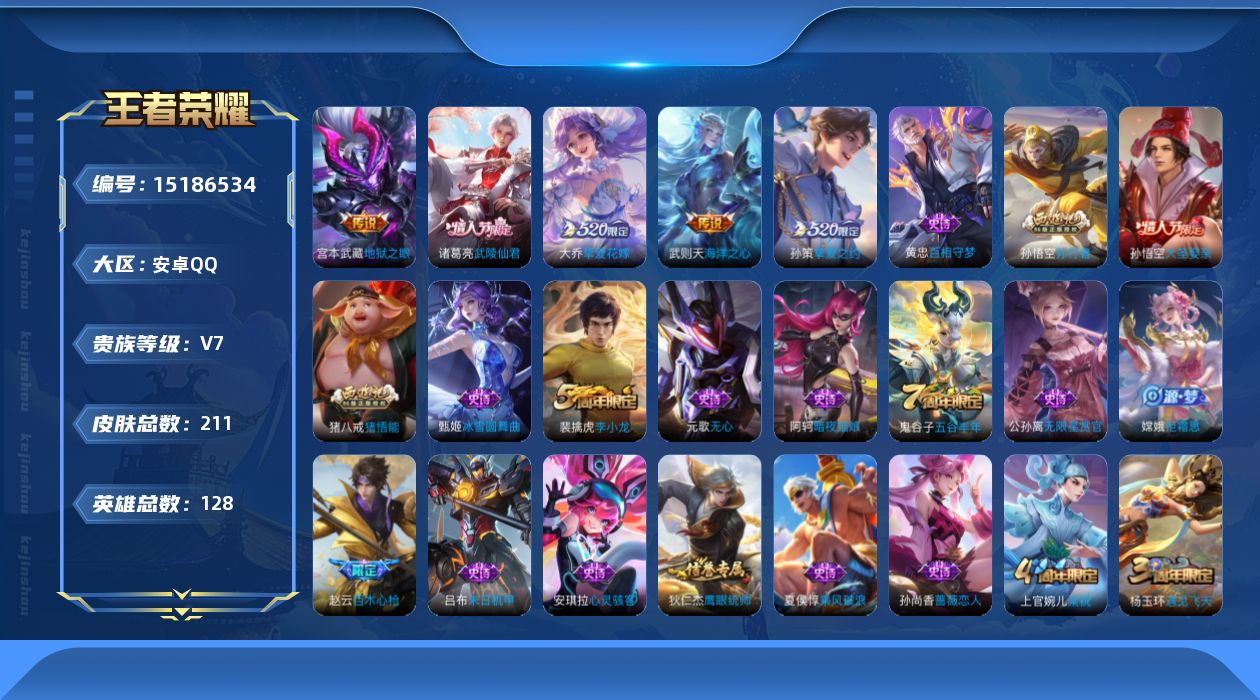 [15186534]v7 6传说 128英雄 211皮肤 典藏英雄武则天 可修改实名 【英雄全皮】:敖隐全皮 【稀有英雄】:敖隐小龙人大司命嬴政始皇帝韩信韩跳跳夏洛特夏师傅艾琳橘右京橘子娜可露露鸟人不知火舞赵云金蝉唐僧戈娅 【传说皮】:神树通天海洋之心地狱之眼挚爱之约挚爱花嫁 【珍宝阁皮】:蔷薇恋人玩趣恶龙 【赛季/战令皮】:海盐诗旅s30擒涛扼浪s31探海日志s32天穹祈灯s34暖冬·兔眠凯尔特女王s7狰s8饕餮s9烛龙s10重明s11穷奇s12御狮s13御霄s14御旌s15御銮s16朔风刀s17混沌棋s18疑决卦s19醍醐杖s20原初探秘者s21万华元夜s22演武夺筹s23驱傩正仪s24千军破阵s25神迹守卫-钟馗狮舞东方沙漠行僧s26吟游魔法夜都怪侠金庭之子s27午后时光大漠名商s28云中旅人s29 【史诗皮】:百相守梦-黄忠无限星赏官暗夜猫娘末日机甲-吕布乱世虎臣摇滚巨星水果甜心天才门将心灵骇客功夫厨神德古拉伯爵暗隐猎兽者鬼剑武藏心灵战警拒霜思乘风破浪逐浪之夏金属风暴圣诞狂欢圣诞恋歌鹰眼统帅暗夜贵公子魅力维加斯无心 【限定皮】:武陵仙君小桃花遇见飞天高山流水五谷丰年梁祝李小龙孙行者猪悟能大圣娶亲百木心呛 【普通皮】:熔金海岸动物派对劲辣红锅刘邦虎啸剑宗长夏之忆经纬探寻者无尽旅途功夫炙烤街头霸王星梦巡礼鹤鸣心笺罗小黑战记-张良荣光之誓落日弦歌踏浪烽翎罗小黑战记-哪吒逆浪荇歌虚灵犬护灵野札记危途狂花潮玩造梦师王牌新星尼罗河女神鬼谷子天穹祈灯s34胡桃狂想曲万事如意五福同心龙腾万里花好人间归虚梦演-蒙犽归虚梦演-孙膑海滩丽影海滩派对皇家上将魔术师沉稳之力掌控之力守护之力坚韧之力霸王丸化身博士炽热元素使纽约教父乓乓大师万象初新次元突破大发明家天使之翼功夫老勺鲨炮海盗猫红桃皇后西部大镖客牛魔教廷特使进击墨子号阴阳师汉昭烈帝兔女郎死亡骑士少女阿狸忍·炎影紫罗兰之誓奇