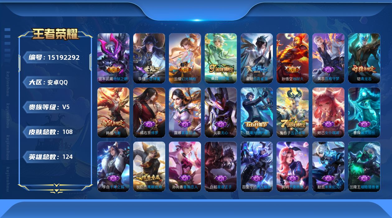 [15192292]v5 6传说 124英雄 108皮肤 可修改实名 【稀有英雄】:大司命韩信韩跳跳夏洛特夏师傅艾琳橘右京橘子娜可露露鸟人不知火舞赵云金蝉唐僧戈娅 【传说皮】:幻光神呛地狱火地狱之眼云霓雀翎一念神魔 【珍宝阁皮】:蔷薇恋人玩趣恶龙 【赛季/战令皮】:古海寻踪s33海盐诗旅s30擒涛扼浪s31探海日志s32天穹祈灯s34原初探秘者s21万华元夜s22演武夺筹s23驱傩正仪s24千军破阵s25沙漠行僧s26金庭之子s27大漠名商s28云中旅人s29 【史诗皮】:百相守梦-黄忠紫霞仙子特工魅影千年之狐猫狗日记-孙策乱世虎臣节奏热浪修罗女仆咖啡水果甜心星夜王子功夫厨神暗隐猎兽者幽灵船长鬼剑武藏曙光守护者鹰眼统帅无心未来纪元-赵云 【限定皮】:鸣野蒿飞衡韩信年限五谷丰年青龙志铠年限 【普通皮】:街头霸王雪境奇遇-西施鹤鸣心笺荣光之誓克喵踏浪烽翎妄想特派完美运算鬼谷子天穹祈灯s34蔚蓝守将龙腾万里花好人间海滩丽影海滩派对皇家上将沉稳之力掌控之力坚韧之力霸王丸缤纷绘卷纽约教父乓乓大师万象初新大发明家天使之翼功夫老勺哥特玫瑰鲨炮海盗猫红桃皇后教廷特使进击墨子号阴阳师汉昭烈帝兔女郎死亡骑士忍·炎影白执事秘密基地白色死神未来纪元-宫本武藏拳王玩偶对对碰虹云星官孤猎灼热之刃幸存者荷鲁斯之眼龙域领主第七人偶福禄兄弟异域舞娘精灵王加勒比小姐秩序猎龙将森年年有余海之征途精准探案法命运角斗场绝影神呛战争骑士特种部队隐刃木偶奇遇记西部大镖客-孙悟空