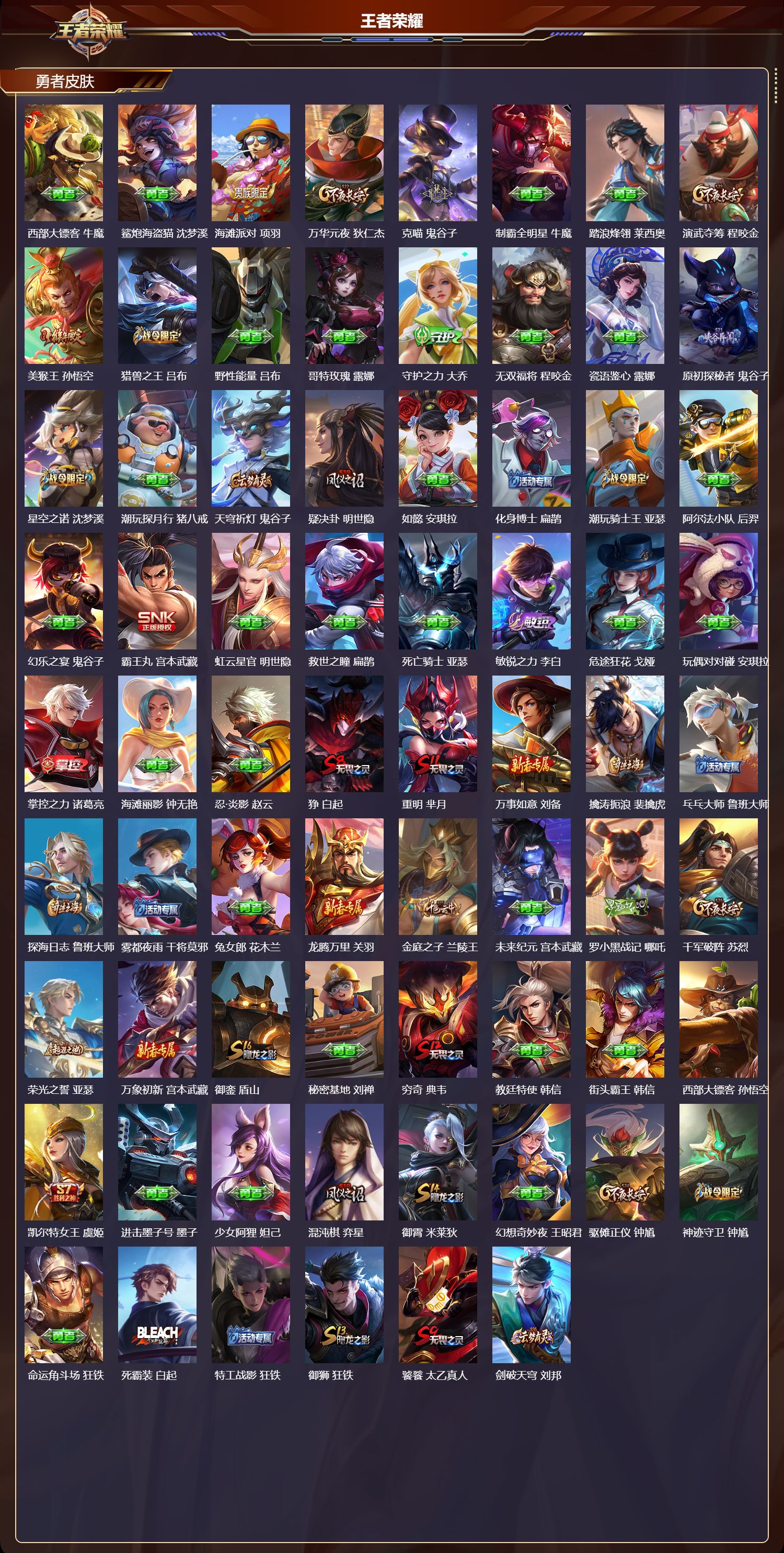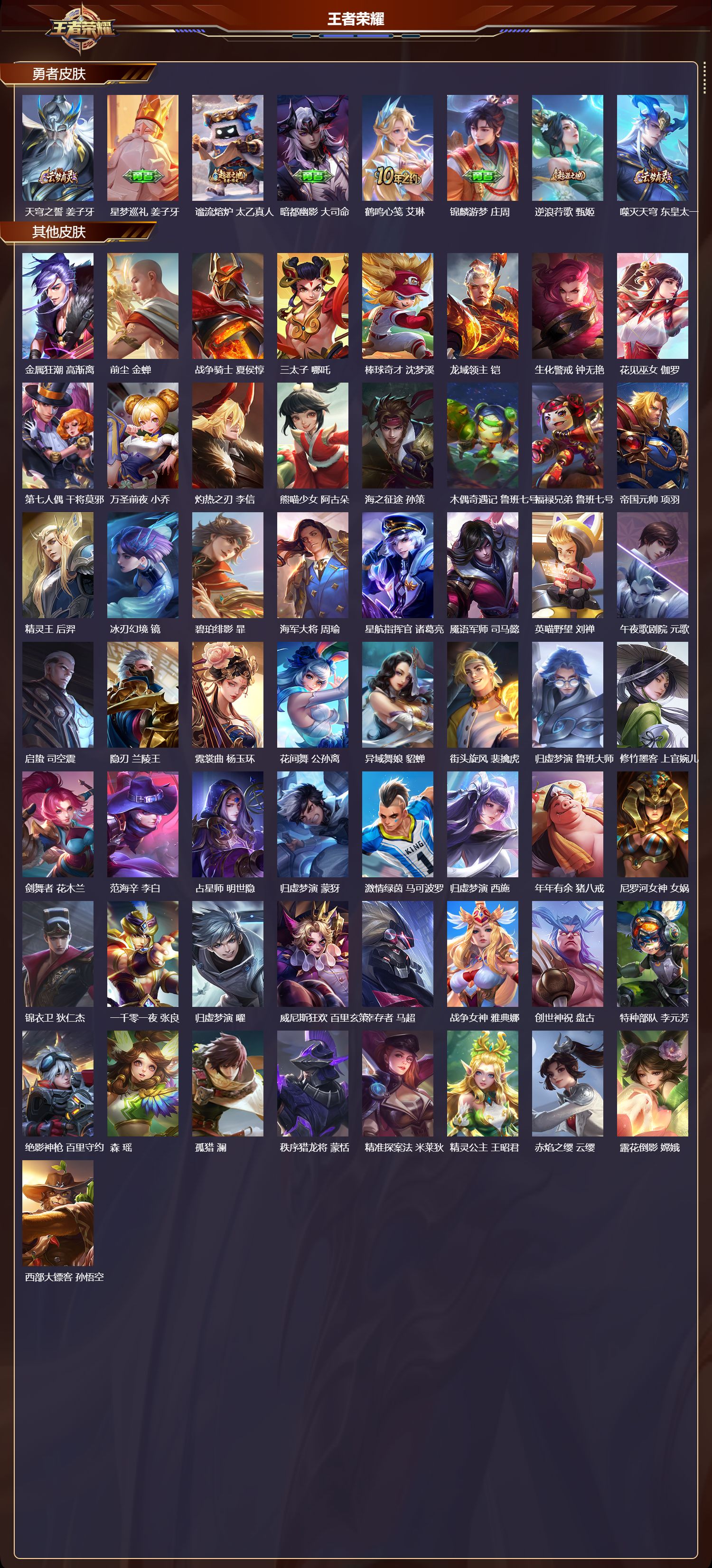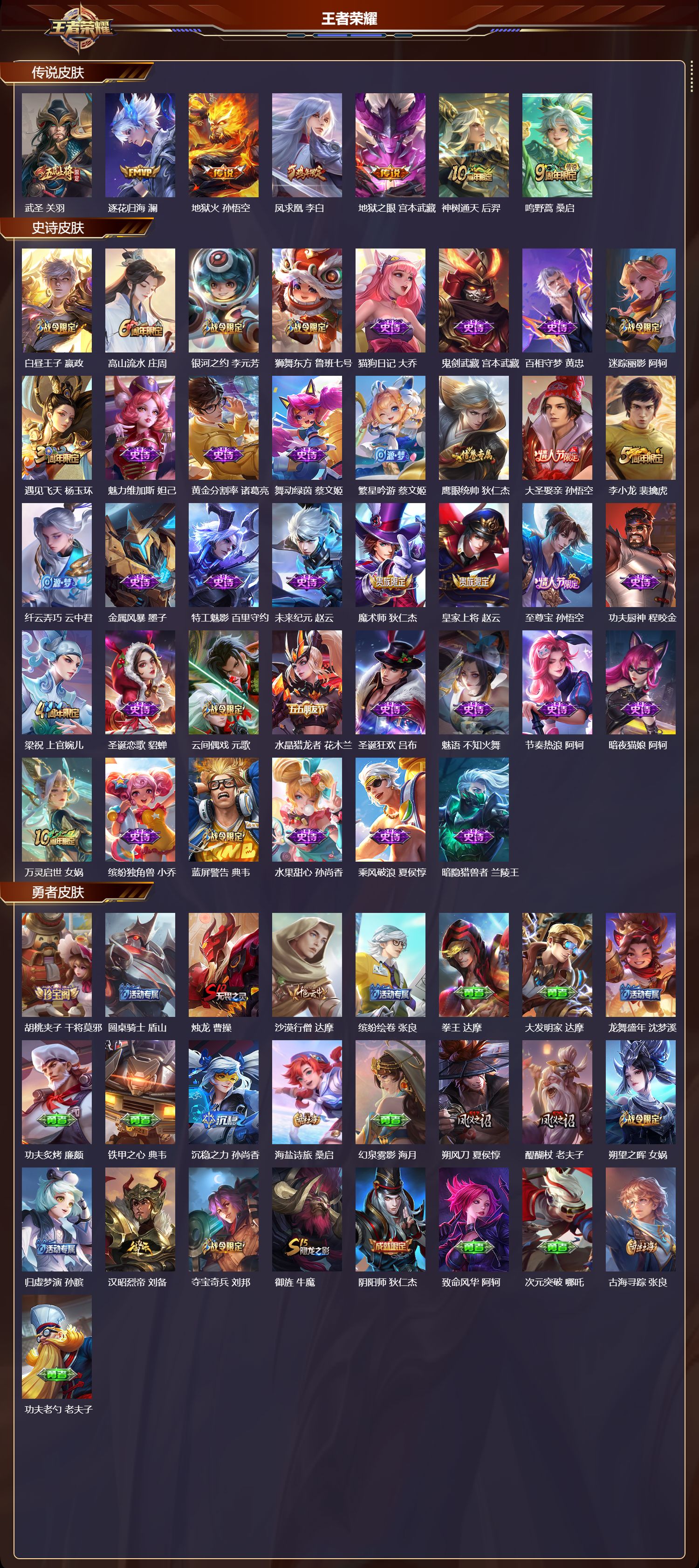 安卓qq/至圣王者/206皮肤/126英雄/0典藏/0珍品无双/0无双/0珍品传说/7传说/38史诗/8稀有英雄【7 传说皮肤】武圣 关羽逐花归海 澜地狱火 孙悟空凤求凰 李白地狱之眼 宫本武藏神树通天 后羿鸣野蒿 桑启【38 史诗皮肤】白昼王子 嬴政高山流水 庄周银河之约 李元芳狮舞东方 鲁班七号猫狗日记 大乔鬼剑武藏 宫本武藏百相守梦 黄忠迷踪丽影 阿轲遇见飞天