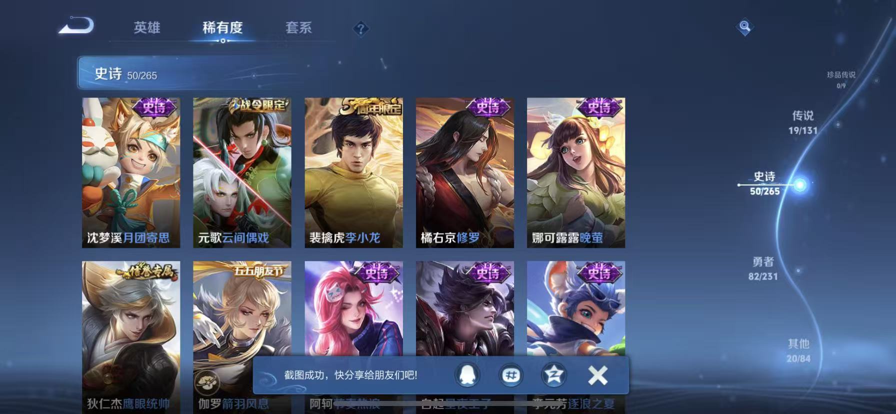 [15225501]【贵族7 172皮肤1水晶19传说1星传说8个性按键】荣耀水晶: 鸣剑·曳影 星传说: 未来机甲 传说皮: 久胜战神一念神魔云霓雀翎末日机甲-孙尚香地狱之眼时之恋人-刘备超时空战士-狄仁杰山海·炽霜斩浮生妄妄想实况澜逐花归海九山相柳万灵伏威神树通天 限定皮: 李小龙傲雪梅呛齐天大圣夏侯惇霜北刀鸣野蒿愿照·九州拓