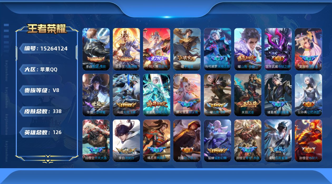 [15264124]v8 2典藏 1无双 23传说 126英雄 338皮肤 可修改实名 【英雄全皮】橘右京全皮蚩奼全皮刘禅全皮夏洛特全皮 【稀有英雄】大司命嬴政始皇帝韩信韩跳跳夏洛特夏师傅艾琳橘右京橘子娜可露露鸟人不知火舞赵云金蝉唐僧戈娅 【荣耀水晶】鸣剑·曳影九霄神辉木兰典藏 【无双皮】花合斗 【传说皮】神树通天李零号·赤焰地狱火地狱之眼云霓雀翎一念神魔猫影幻舞云鹰飞将小将军无双飞将时之恋人-刘备电焊工山海·苍雷引电光曜子浮生妄记忆之芯机甲兔鹤羽星尊 【珍宝阁皮】蔷薇恋人女武神 【赛季/战令皮】噬灭天穹s37古海寻踪s33星界游侠海盐诗旅s30擒涛扼浪s31潮玩骑兵奇幻香踪探海日志s32驭风魔法玲珑珍味顽趣-梦奇剑破天穹s35天穹祈灯s34天穹之誓s36暖冬·兔眠狰s8混沌棋s18疑决卦s19醍醐杖s20原初探秘者s21万华元夜s22演武夺筹s23驱傩正仪s24千军破阵s25猎兽之王星空之诺银河之约单词大作战潮玩骑士王云间偶戏圣弓游侠真爱魔法火炮绅士沙漠行僧s26幻夜卜梦金庭之子s27电玩高手电玩铁子午后时光大漠名商s28云中旅人s29超时空战士-钟无艳落雪兰心 【史诗皮】灵蛊蚀心鸭鸭历险记-刘禅龙之律动百相守梦-百里守约芈月浮光幕影怒海争锋蔬乡物语鲁班七号万灵启世罗小黑战记-百里玄策紫霞仙子苍穹之光电玩小子小书包白龙吟特工魅影千年之狐永昼高渐离燃音魔法蒙恬荣光圣徽龙骑士小龙虾冰冠公主青蛇偶像歌手魅语白蛇电玩·爆裂旋风百相守梦刘备末日机甲-吕布猫狗日记-孙策乱世虎臣节奏热浪修罗女仆咖啡摇滚巨星水果甜心绅士熊喵天才门将星夜王子心灵骇客功夫厨神德古拉伯爵暗隐猎兽者幽灵船长鬼剑武藏暗渊魔法心灵战警地狱岩魂纤云弄巧拒霜思乘风破浪逐浪之夏龙鼓争鸣水晶猎龙者曙光守护者金属风暴圣诞狂欢圣诞恋歌鹰眼统帅魅力维加斯赏金猎手寅虎·御盾无心未来纪元-赵云 【限定皮】逐霄战戟至尊宝凤凰于飞前尘