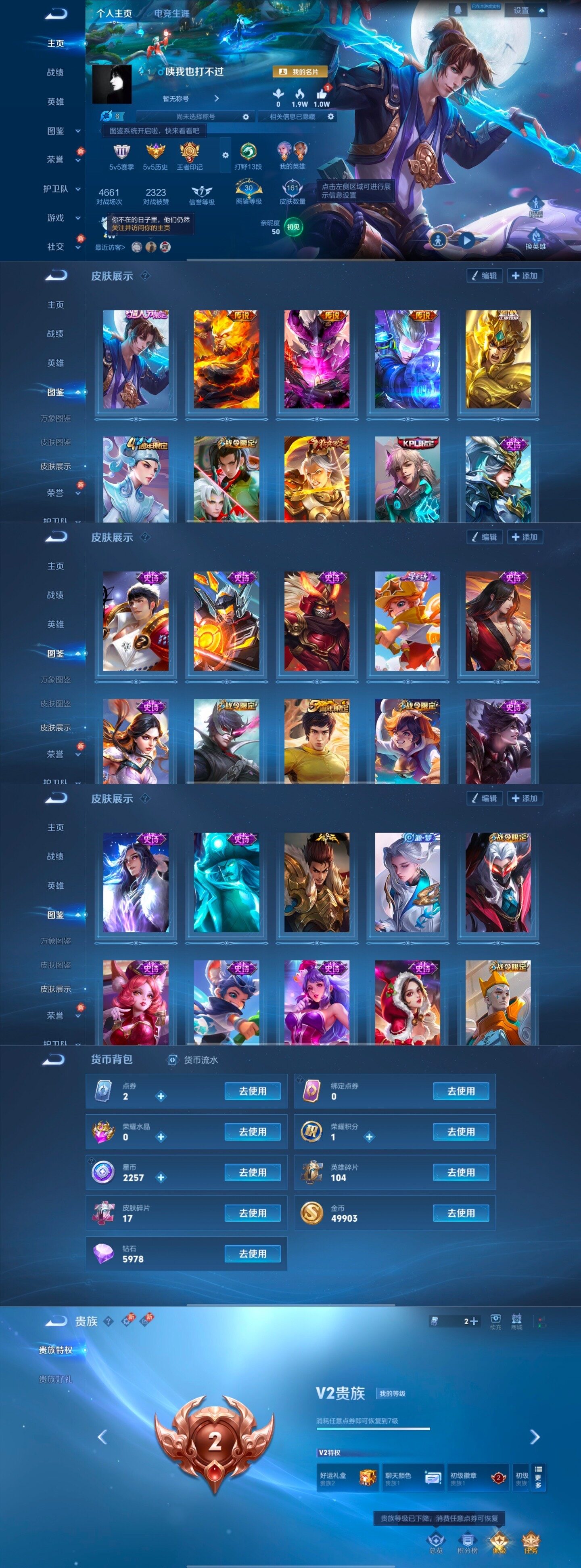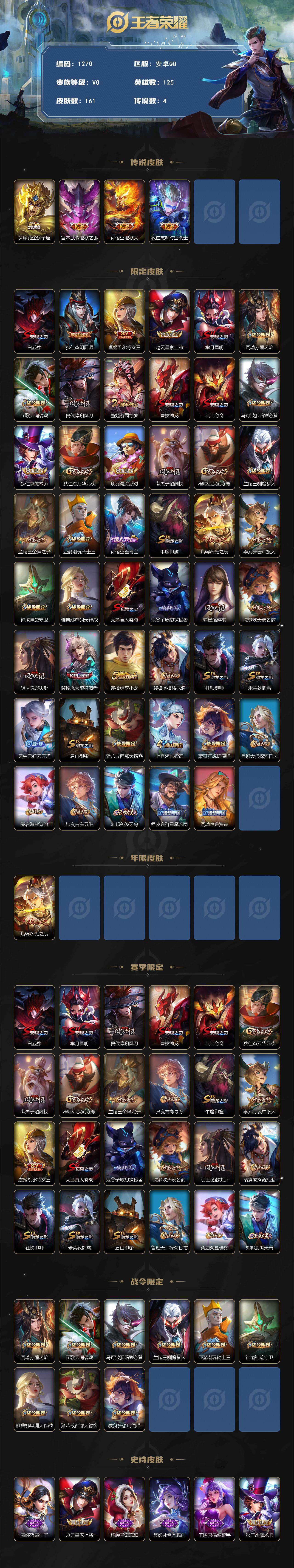 125英雄-161皮肤-安卓qv7 【至尊宝,后羿辉光之辰,天狼狩猎者,白龙吟】永恒钻石iii段位-125英雄-161皮肤-4传说-32史诗 【传说皮肤】:达摩黄金狮子座,宫本武藏地狱之眼,孙悟空地狱火,狄仁杰超时空战士 【限定皮肤】:白起狰,狄仁杰阴阳师,虞姬凯尔特女王,赵云皇家上将,芈月重明,周瑜赤莲之焰,元歌云间偶戏,夏侯惇朔风刀,甄姬游园惊梦,曹操烛龙,典韦穷奇,马可波罗暗影游猎,狄仁杰魔术师,狄仁杰万华元