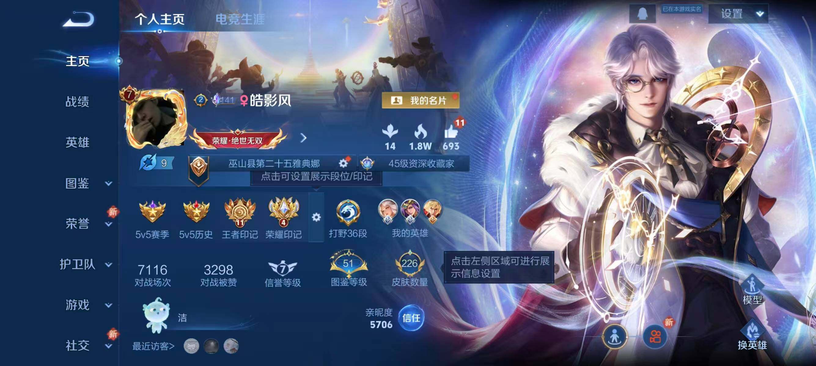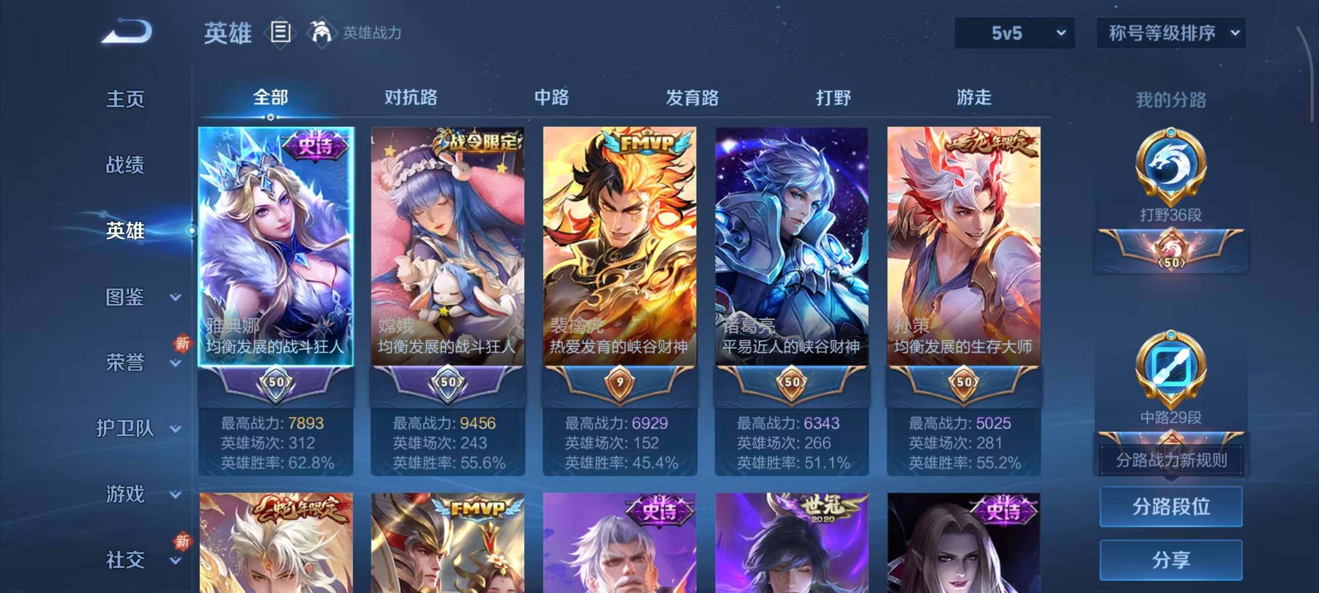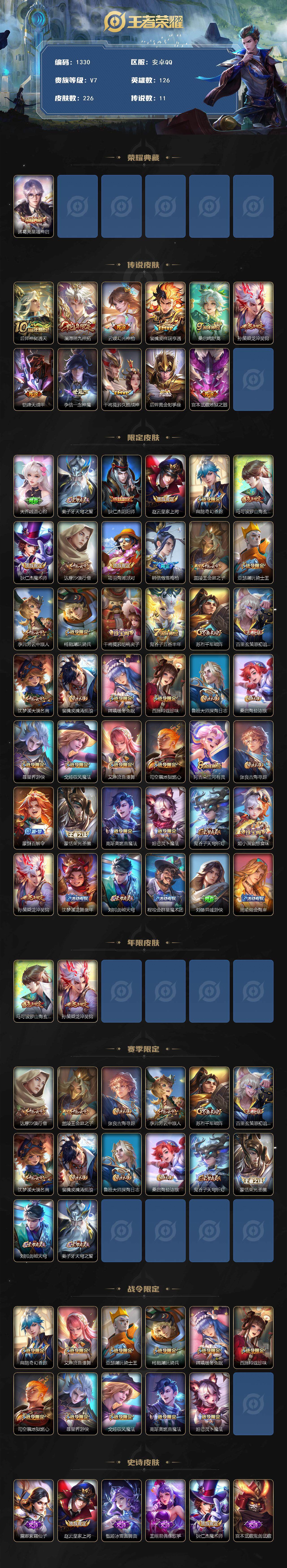 126英雄-226皮肤-【mj秒换绑 226皮1典藏11传说11王者印记打野36段 中路29段 v7 9按键】安卓q-v7-最强王者段位-126英雄-226皮肤-1典藏皮肤-11传说-59史诗 【英雄全皮】:孙权全皮,空空儿全皮,影全皮 【荣耀典藏】:诸葛亮星域神启 【传说皮肤】:后羿神树通天,澜愿照九州拓,云缨幻光神呛,裴擒虎祥瑞亨通,桑启鸣野蒿,孙策乘龙淬吴钩,铠绛天战甲,李信一念神魔,干将莫邪久胜战神,后羿黄金