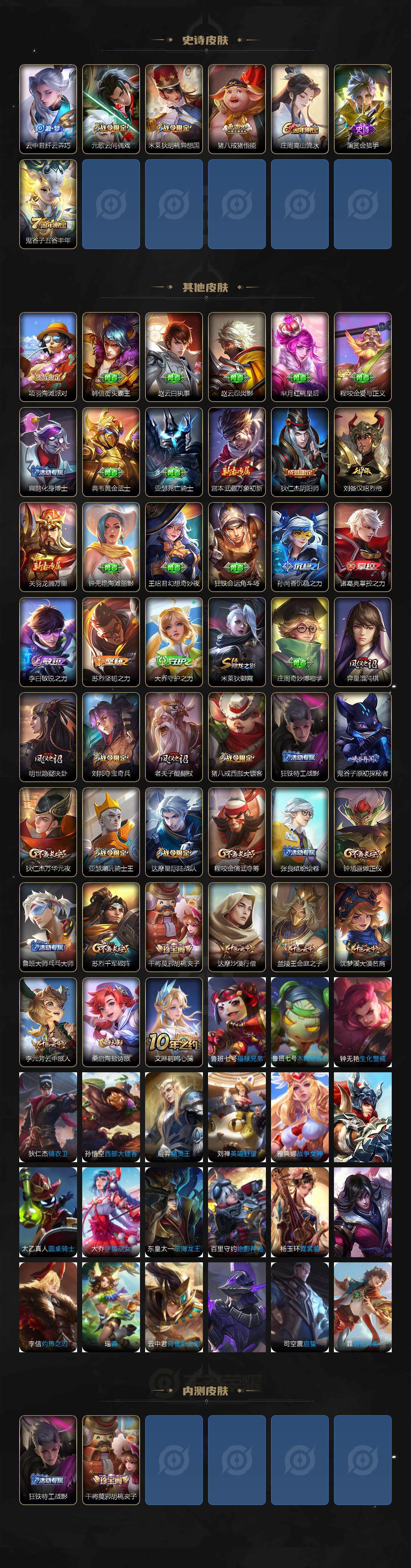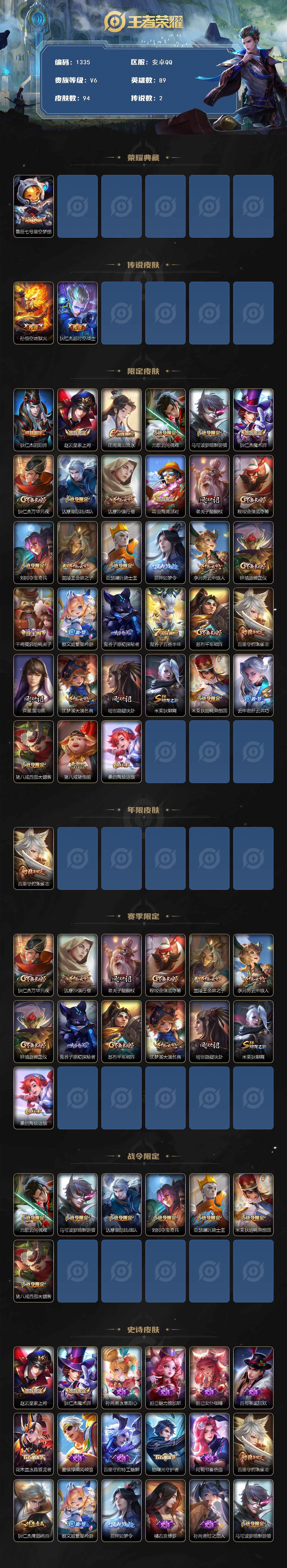 89英雄-94皮肤-安卓q-v6-荣耀黄金i段位-89英雄-94皮肤-1典藏皮肤-2传说-25史诗 【荣耀典藏】:鲁班七号星空梦想 【传说皮肤】:孙悟空地狱火,狄仁杰超时空战士 【限定皮肤】:狄仁杰阴阳师,赵云皇家上将,庄周高山流水,元歌云间偶戏,马可波罗暗影游猎,狄仁杰魔术师,狄仁杰万华元夜,达摩星际陆战队,达摩沙漠行僧,项羽海滩派对,老夫子醍醐杖,程咬金演武夺筹,刘邦夺宝奇兵,兰陵王金庭之子,亚瑟潮玩骑士王,