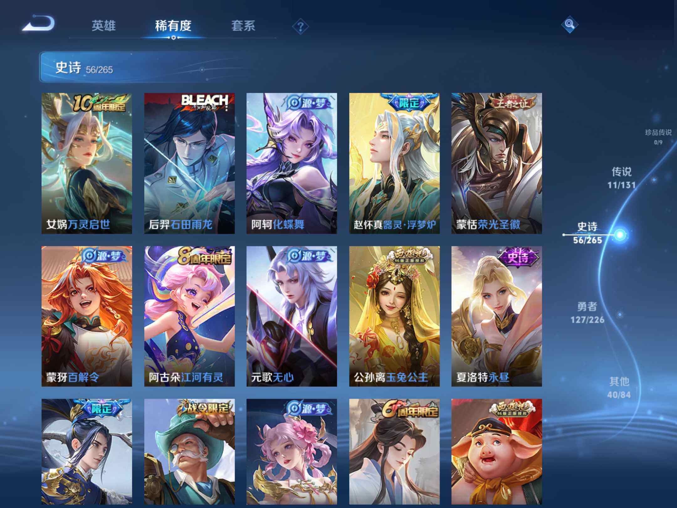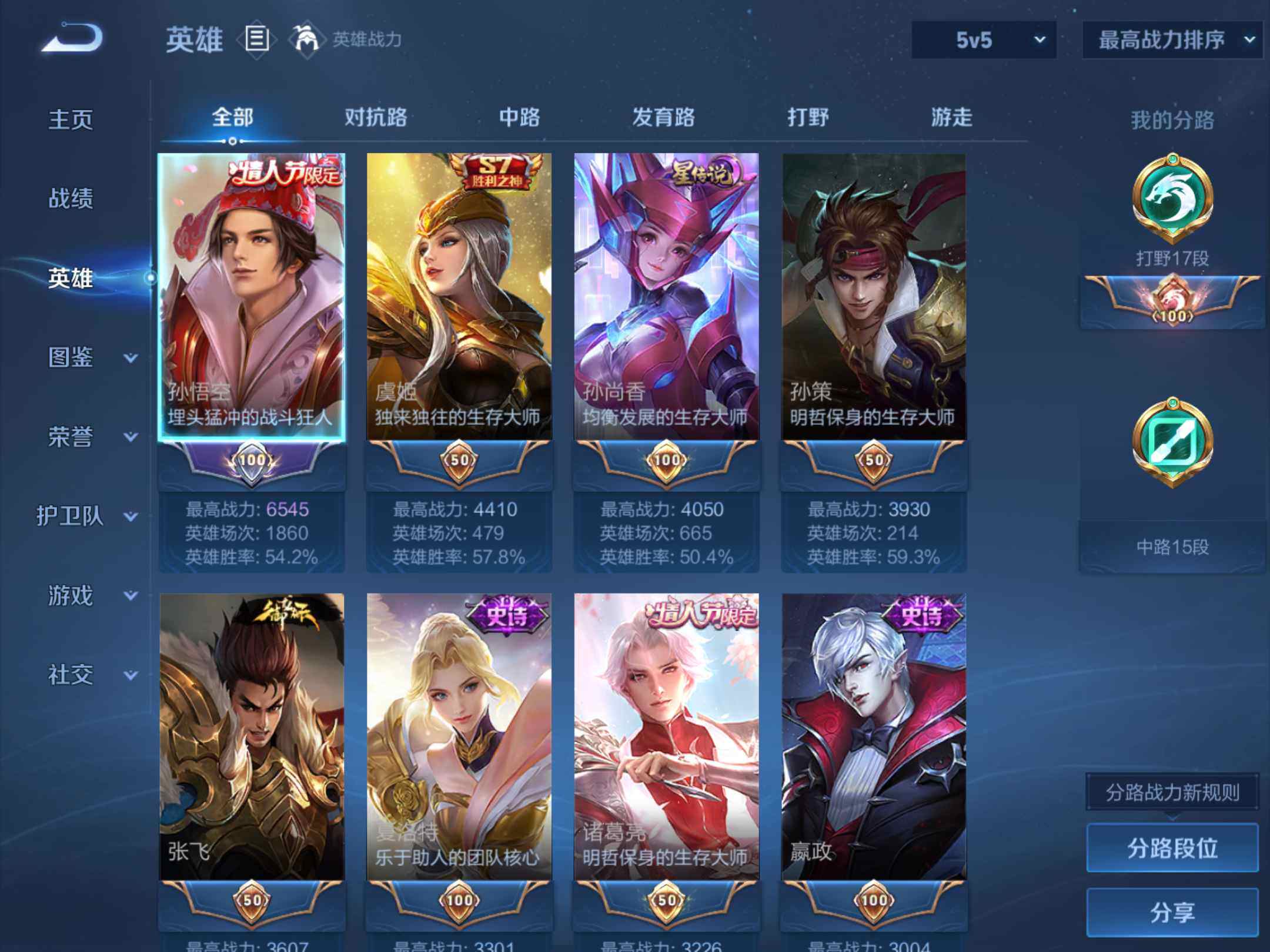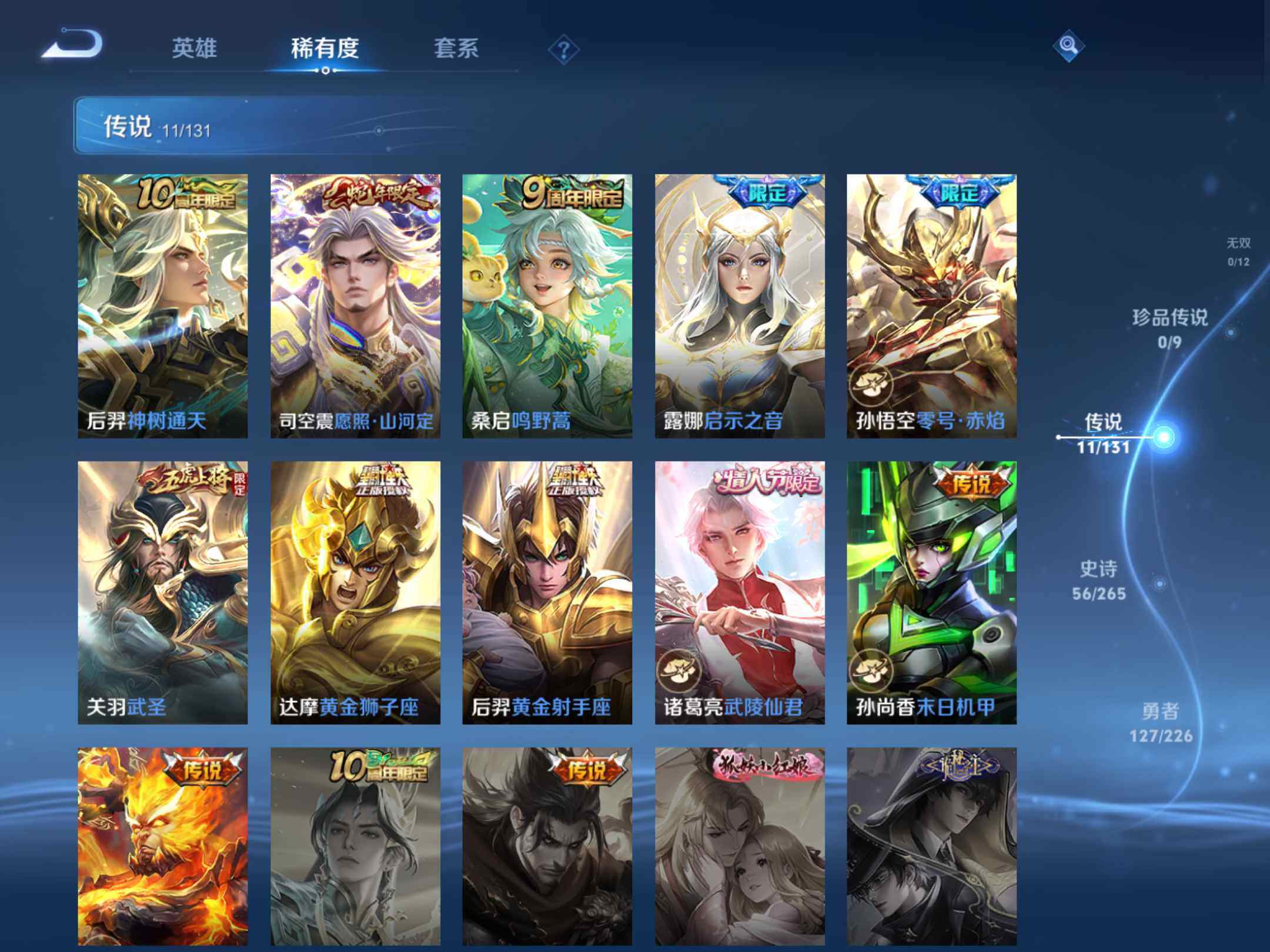 2375142-q-v7-最强王者段位打野17段中路15段-127英雄-234皮肤-11传说1星元未来机甲-56史诗 【英雄全皮】:影全皮 【传说皮肤】:后羿神树通天,司空震愿照山河定,桑启鸣野蒿,露娜启示之音,孙悟空零号赤焰,关羽武圣,达摩黄金狮子座,后羿黄金射手座,诸葛亮武陵仙君,孙尚香末日机甲,孙悟空地狱火 【限定皮肤】:白起狰,姜子牙天穹之誓,狄仁杰阴阳师,虞姬凯尔特女王,赵云皇家上