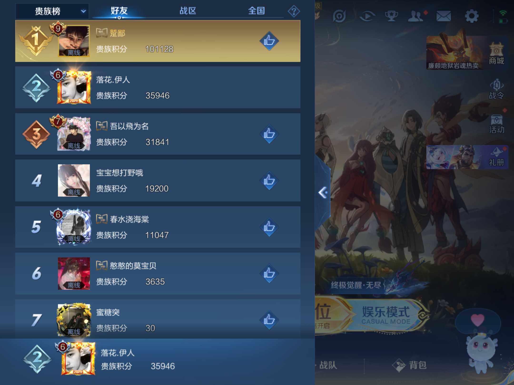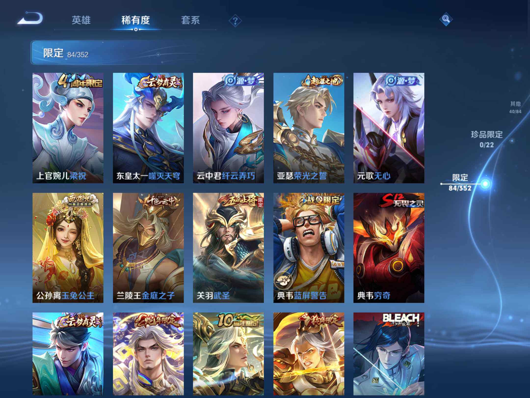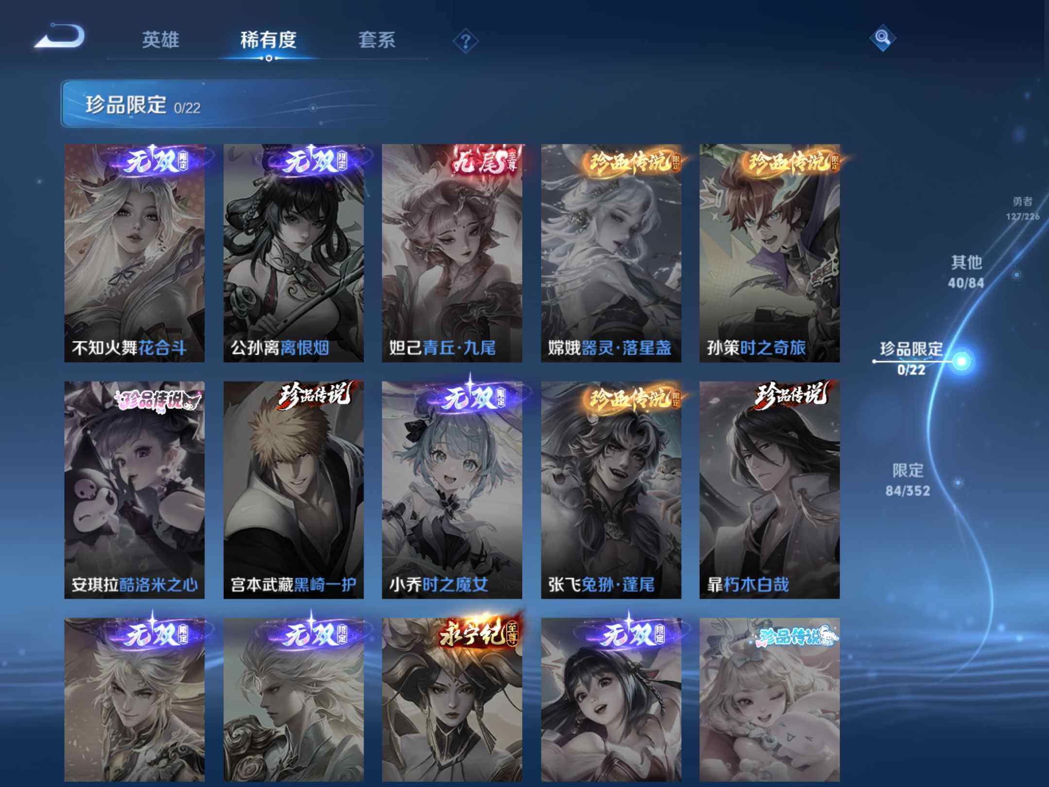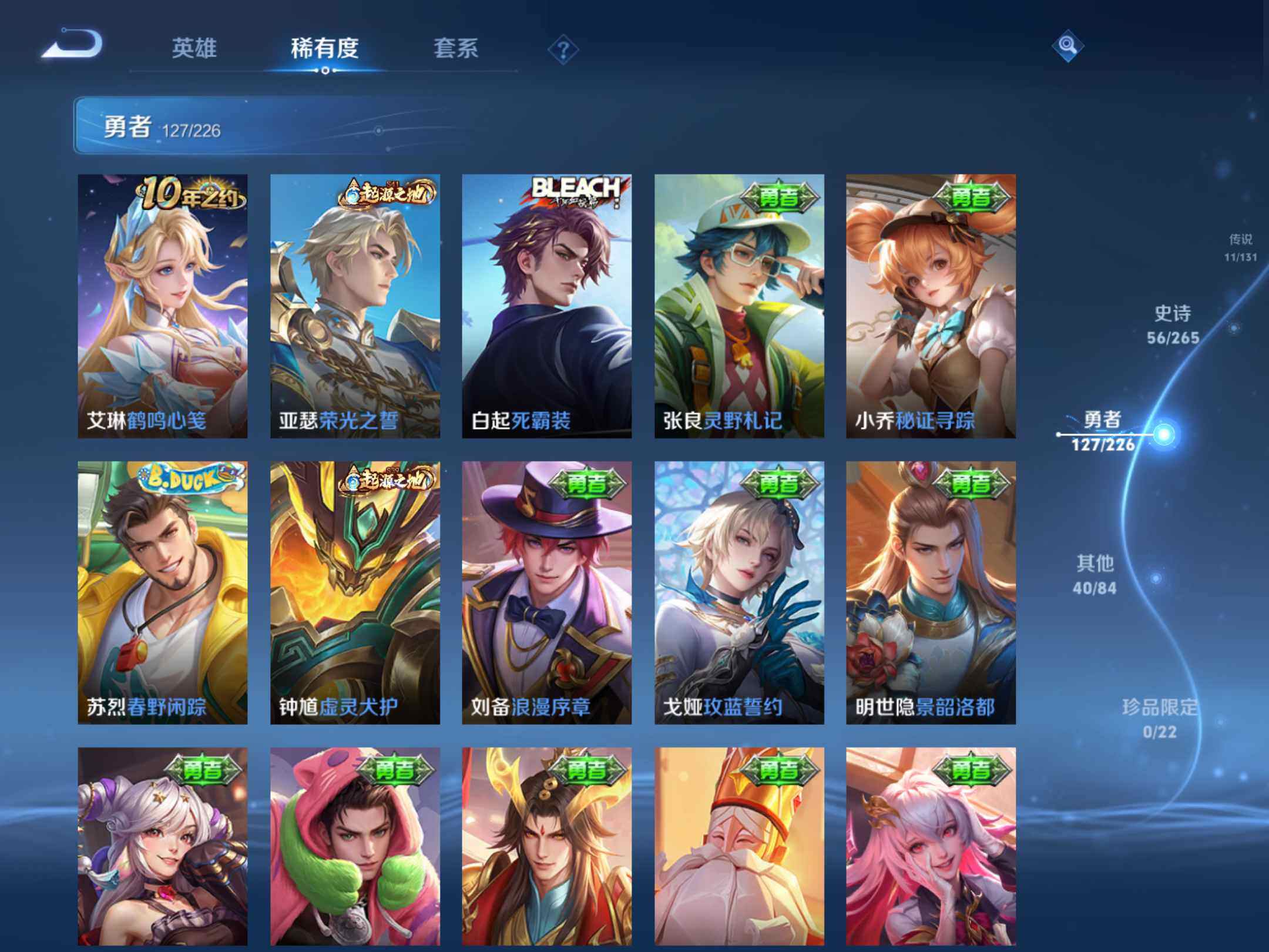 2375142-q-v7-最强王者段位打野17段中路15段-127英雄-234皮肤-11传说1星元未来机甲-56史诗 【英雄全皮】:影全皮 【传说皮肤】:后羿神树通天,司空震愿照山河定,桑启鸣野蒿,露娜启示之音,孙悟空零号赤焰,关羽武圣,达摩黄金狮子座,后羿黄金射手座,诸葛亮武陵仙君,孙尚香末日机甲,孙悟空地狱火 【限定皮肤】:白起狰,姜子牙天穹之誓,狄仁杰阴阳师,虞姬凯尔特女王,赵云皇家上