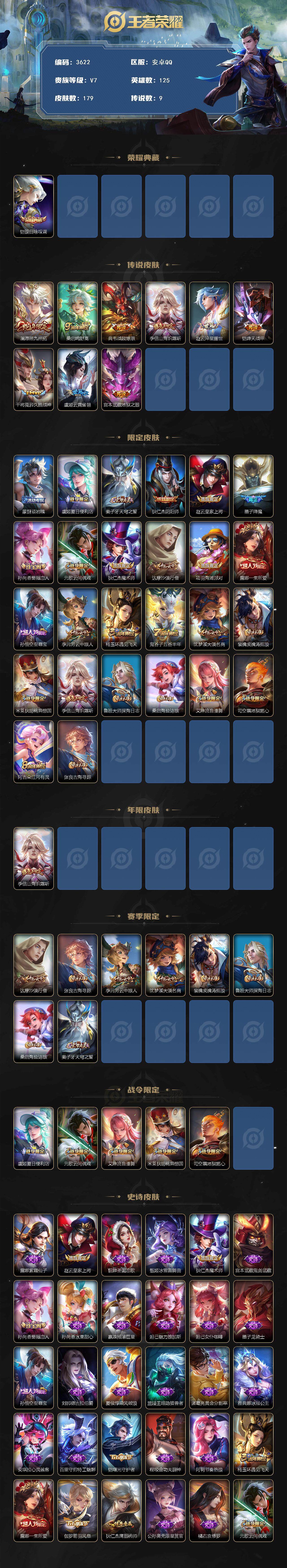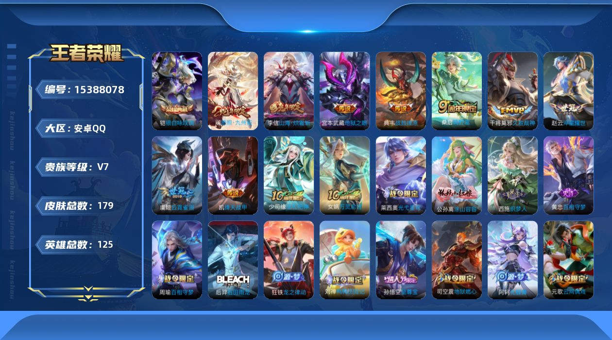 [15388078]安卓q-v7-最强王者段位-125英雄-179皮肤-1典藏皮肤-9传说-56史诗 【英雄全皮】:孙权全皮,影全皮 【荣耀典藏】:铠银白咏叹调 【传说皮肤】:澜愿照九州拓,桑启鸣野蒿,典韦战鼓燎原,李信山海炽霜斩,赵云淬星耀世,铠绛天战甲,干将莫邪久胜战神,虞姬云霓雀翎,宫本武藏地狱之眼 【限定皮肤】:蒙犽顽岩魄,虞姬夏日便利店,姜子牙天穹之誓,狄仁杰阴阳师,赵云皇家上将,墨子降魔,孙尚香蔷薇恋人,元歌云间偶戏,狄仁杰魔术师,达摩沙漠行僧,项羽海滩派对,露娜一生所爱,孙悟空至尊宝,李元芳云中旅人,杨玉环遇见飞天,鬼谷子五谷丰年,沈梦溪大漠名商,裴擒虎擒涛扼浪,米莱狄胡桃异想国,李信山海炽霜斩,鲁班大师探海日志,桑启海盐诗旅,艾琳流音漫舞,司空震地狱燃心,阿古朵江河有灵,张良古海寻踪 【年限皮肤】:李信山海炽霜斩 【赛季限定】:达摩沙漠行僧,张良古海寻踪,李元芳云中旅人,沈梦溪大漠名商,裴擒虎擒涛扼浪,鲁班大师探海日志,桑启海盐诗旅,姜子牙天穹之誓 【战令限定】:虞姬夏日便利店,元歌云间偶戏,艾琳流音漫舞,米莱狄胡桃异想国,司空震地狱燃心 【史诗皮肤】:露娜紫霞仙子,赵云皇家上将,貂蝉圣诞恋歌,甄姬冰雪圆舞曲,狄仁杰魔术师,宫本武藏鬼剑武藏,孙尚香蔷薇恋人,孙尚香水果甜心,嬴政摇滚巨星,妲己魅力维加斯,妲己女仆咖啡,墨子龙骑士,孙悟空至尊宝,刘邦德古拉伯爵,夏侯惇乘风破浪,兰陵王暗隐猎兽者,诸葛亮黄金分割率,雅典娜冰冠公主,安琪拉心灵骇客,百里守约特工魅影,铠曙光守护者,程咬金功夫厨神,阿轲节奏热浪,杨玉环遇见飞天,露娜一生所爱,伽罗箭羽风息,狄仁杰鹰眼统帅,公孙离无限星赏官,橘右京修罗,元歌云间偶戏,米莱狄胡桃异想国,钟馗乐园奇幻夜,澜赏金猎手,张良千筹问战,鬼谷子五谷丰年,墨子降魔,百里守约真我赫兹,司空震地狱燃心,阿古朵江河有灵,蒙犽顽岩魄,百里守约百相守梦,牛魔星界战将,孙膑茶境仙,赵怀真器灵浮梦炉,狄仁杰绮世丹青,阿轲化蝶舞,刘禅鸭鸭历险记,狂铁龙之律动,后羿石田雨龙,周瑜百相守梦,黄忠百相守梦,西施织梦人,公孙离涂山容容,莱西奥光弋星穹,女娲万灵启世,少司缘巫礼祀神 【其他皮肤】:项羽海滩派对,韩信教廷特使,赵云忍炎影,白起白色死神,姜子牙时尚教父,妲己少女阿狸,典韦黄金武士,亚瑟死亡骑士,达摩拳王,花木兰兔女郎,张飞五福同心,甄姬花好人间,刘备万事如意,